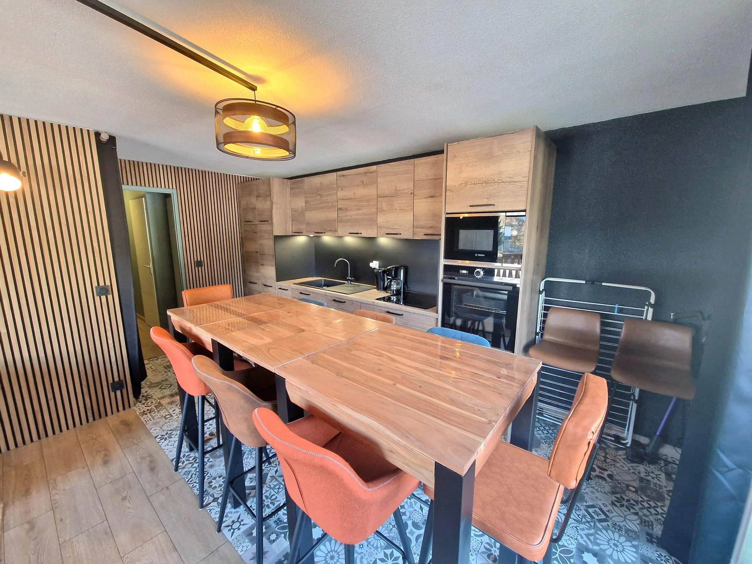 - Comedor con 2 mesas altas y sillas altas.