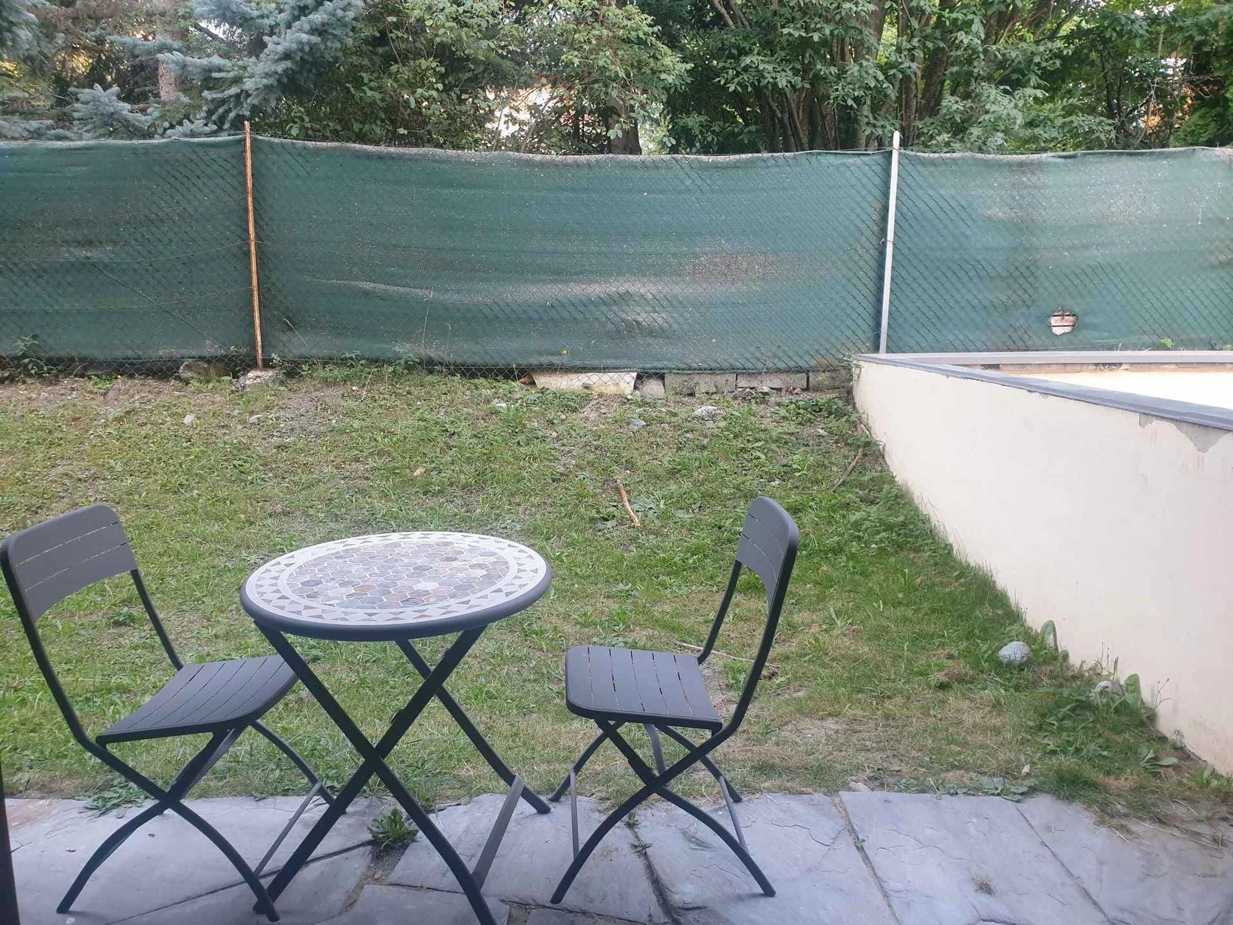 Terraza (5 m²/Oeste) con una mesa de jardín y dos sillas. No hay aparcamiento, pero hay aparcamiento público cercano.