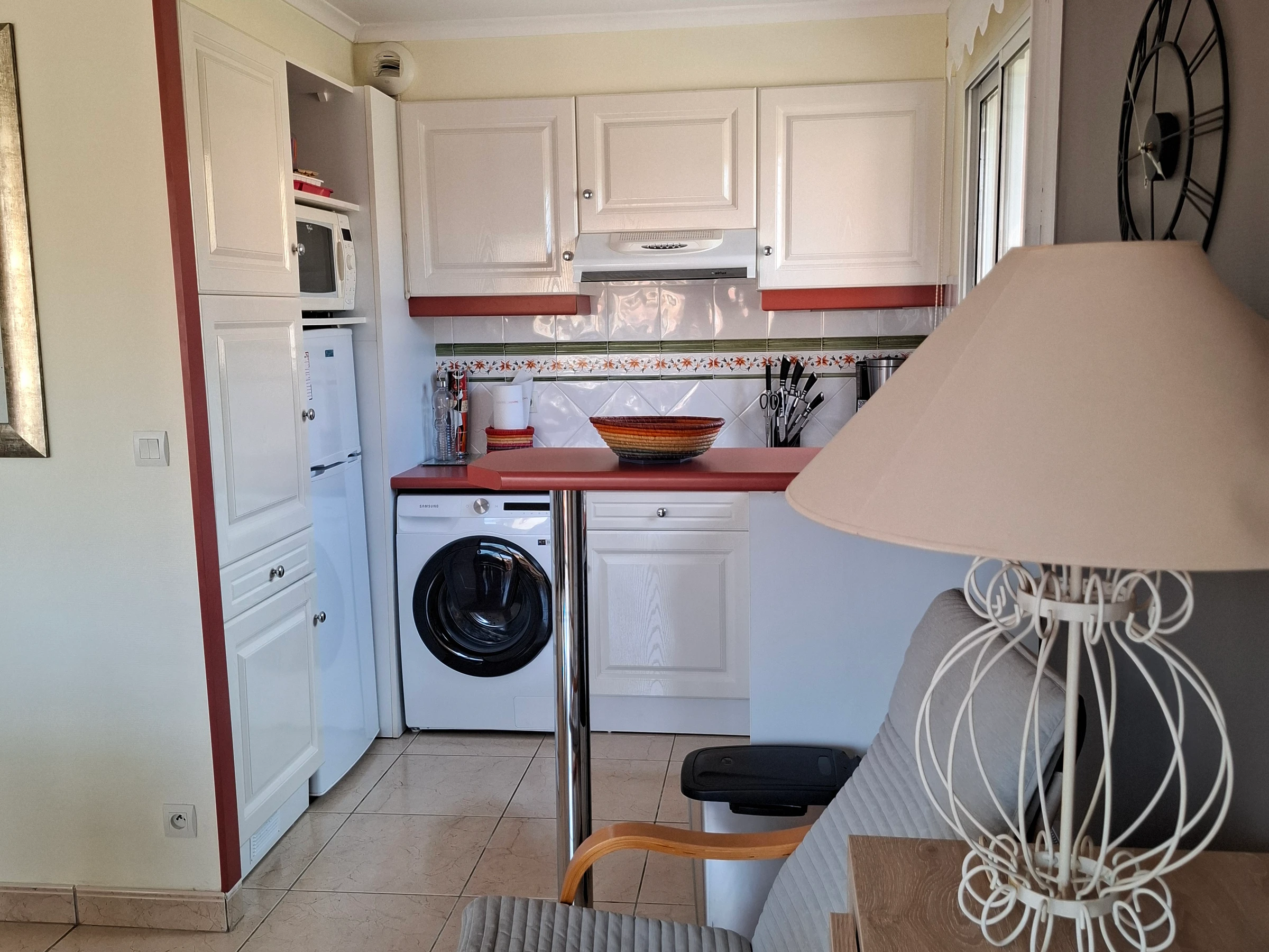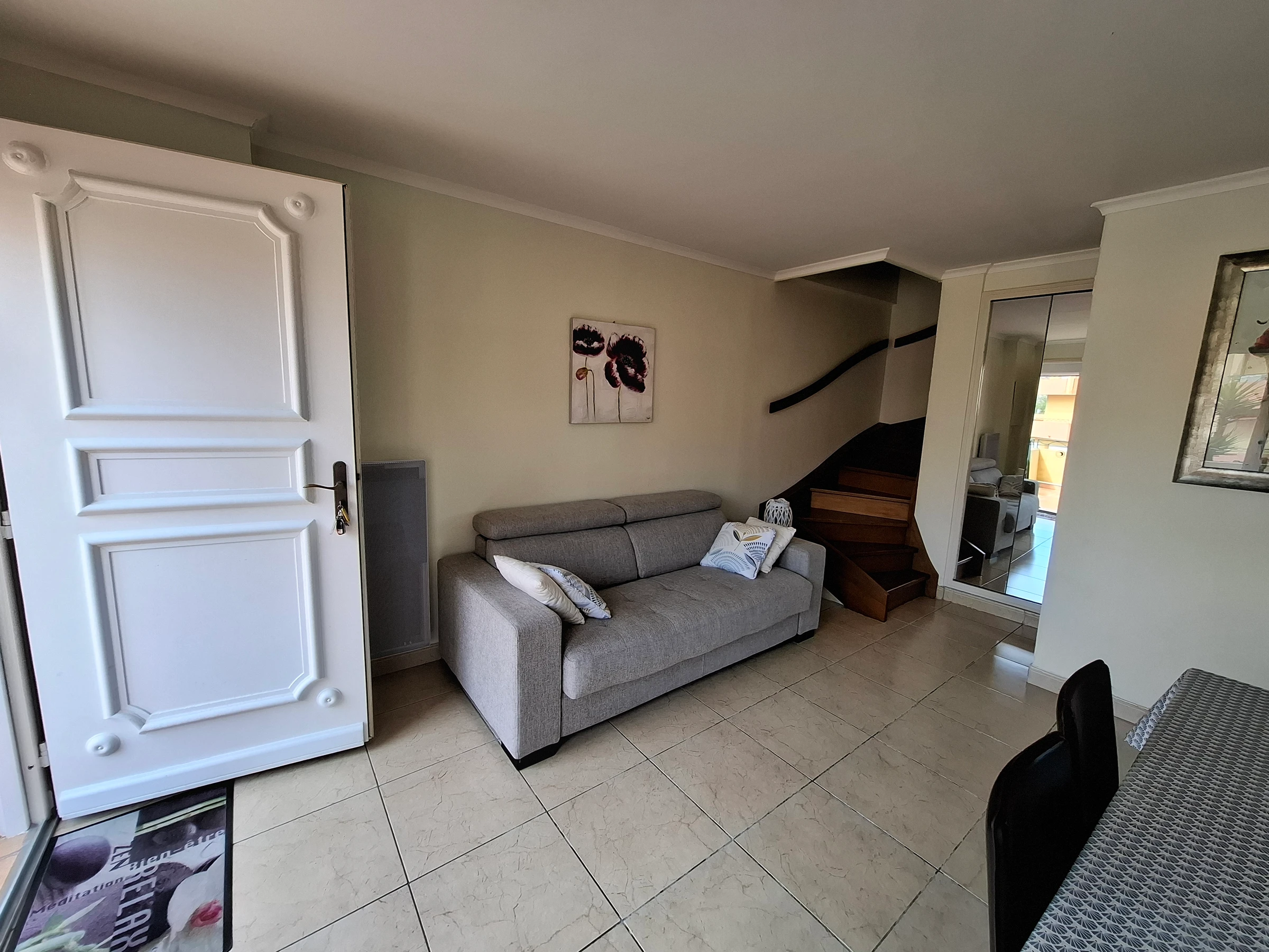 En una residencia segura con piscina, esta villa dúplex consta de una planta baja con escaleras que conducen a la primera planta (garaje bajo la casa).