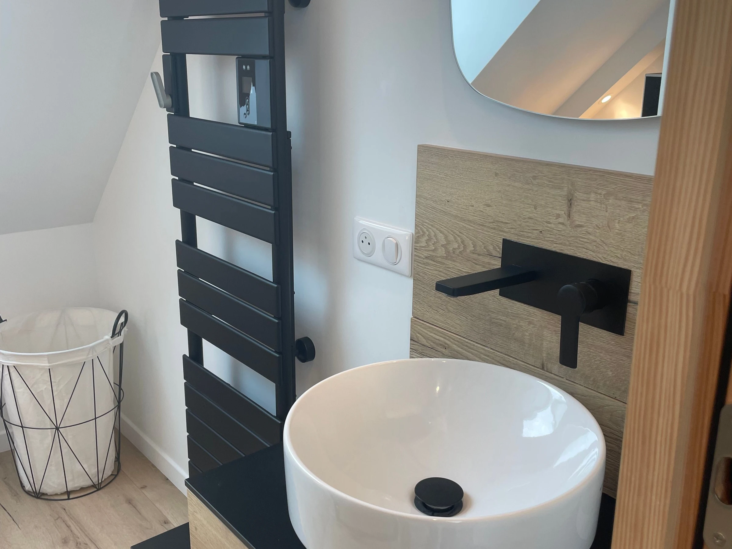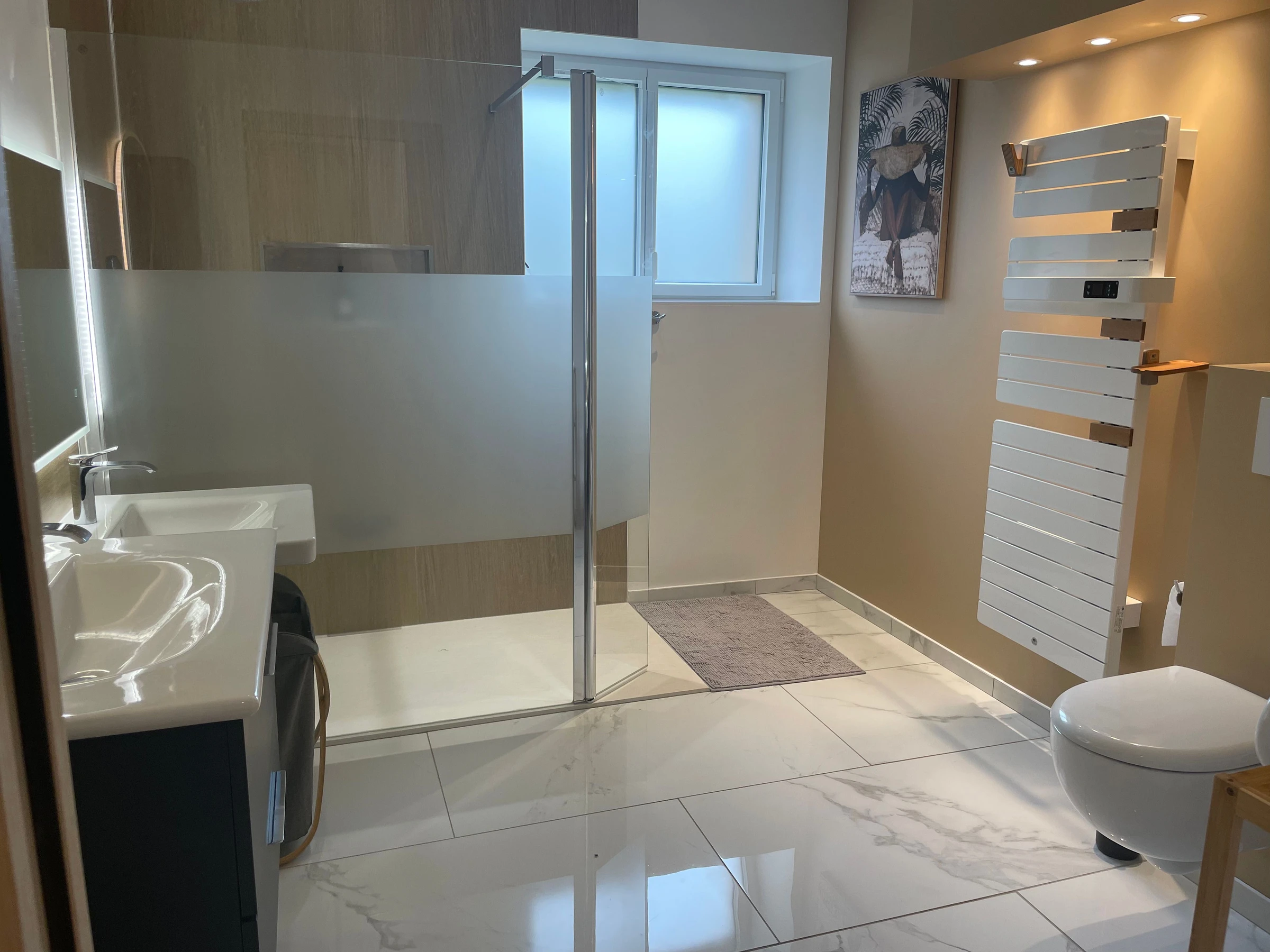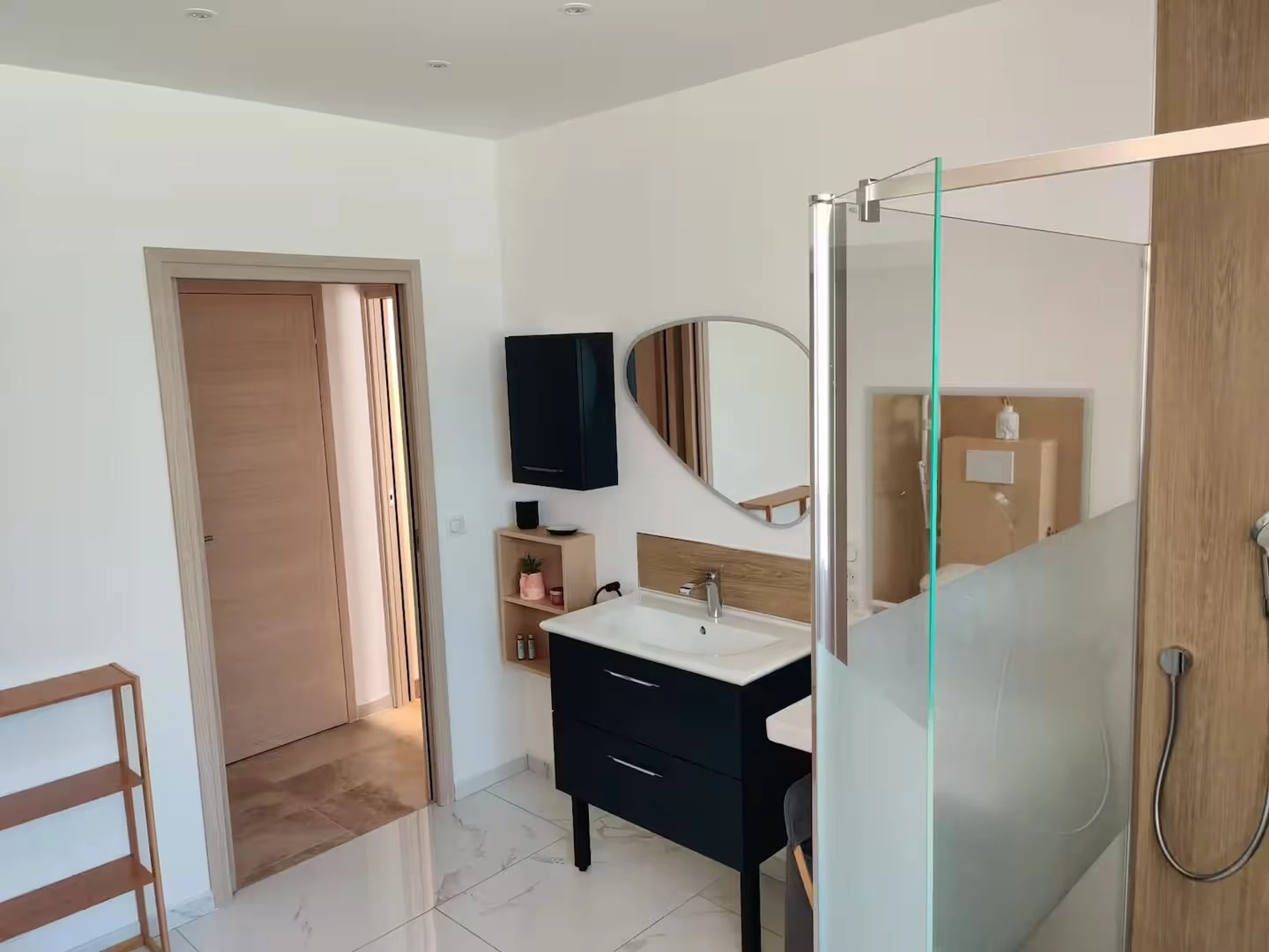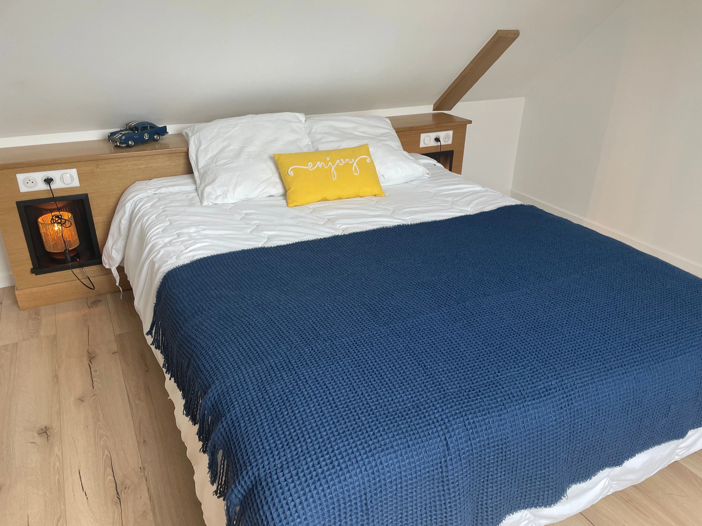 - un amplio dormitorio con cama de matrimonio (160 x 190 cm o convertible en dos camas de 80 x 190 cm) y un cuarto de baño adaptado para personas con movilidad reducida. En la planta superior encontrará: dos amplias habitaciones, cada una con una cama de matrimonio (160x200 cm), una habitación con una cama doble (140x190 cm) y una cama individual (90x190 cm), y un cuarto de baño con ducha e inodoro. Todas las habitaciones disponen de aire acondicionado.