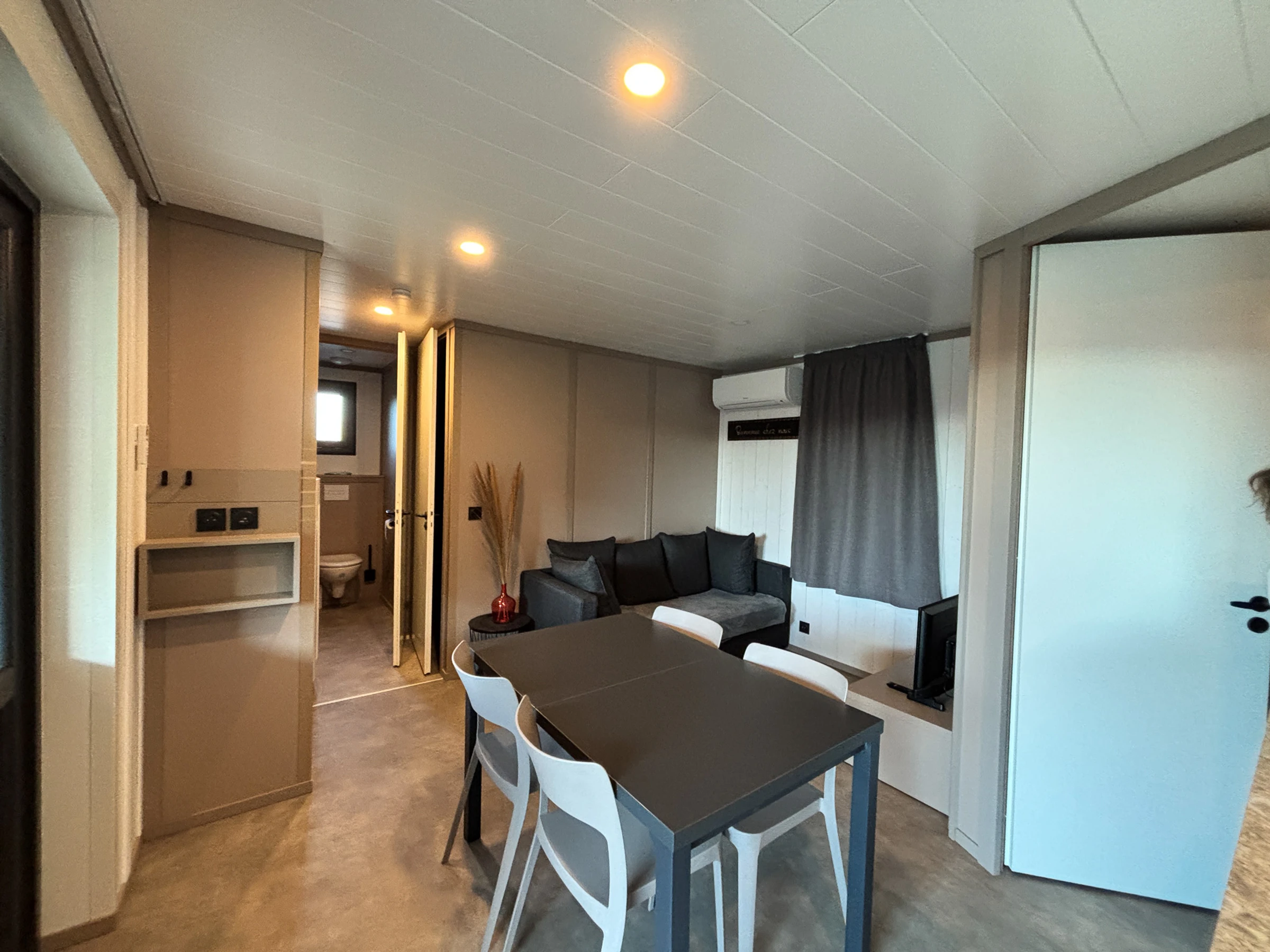 1 Séjour équipé avec canapé non convertible, table à manger, télévision.
