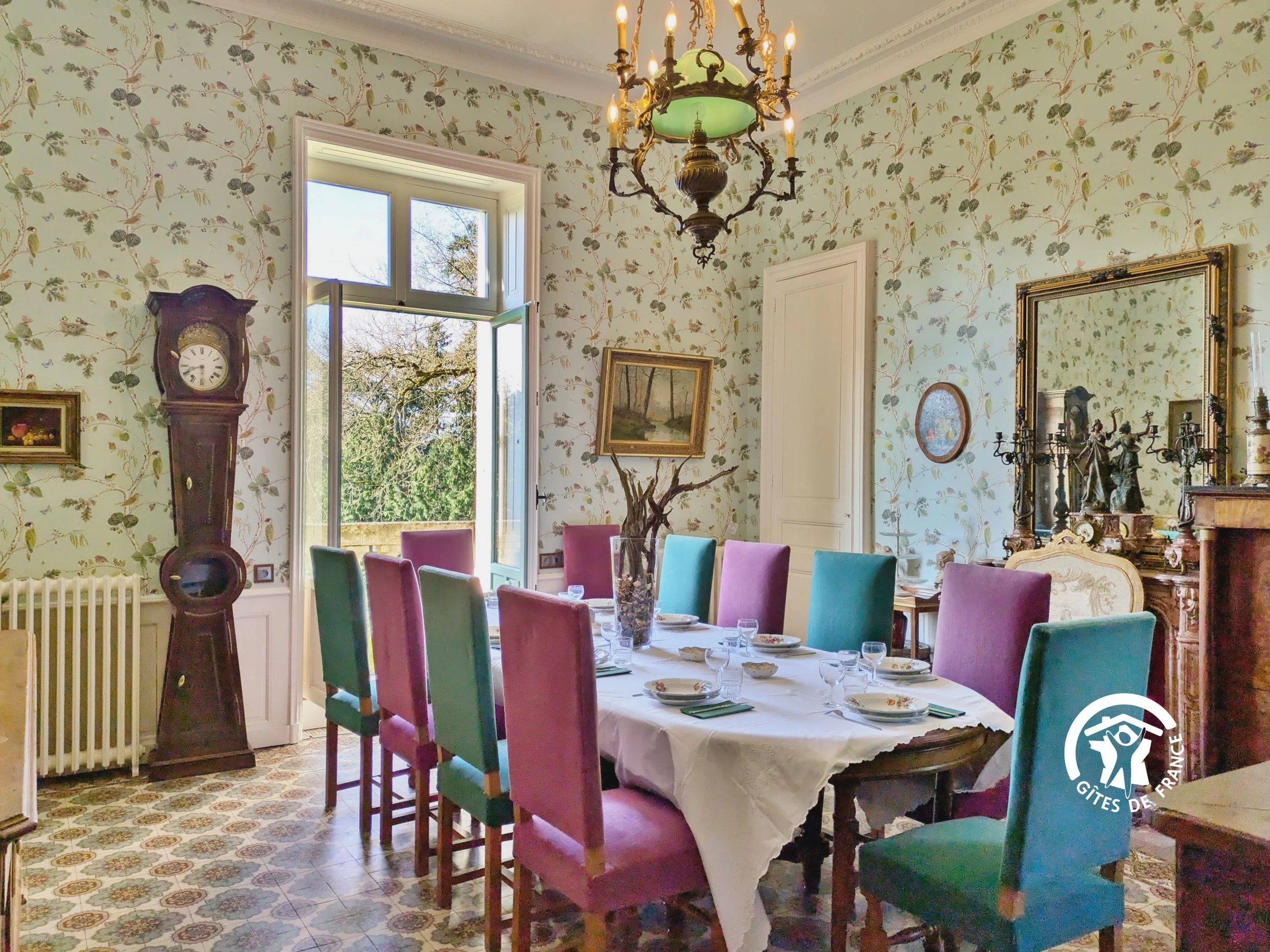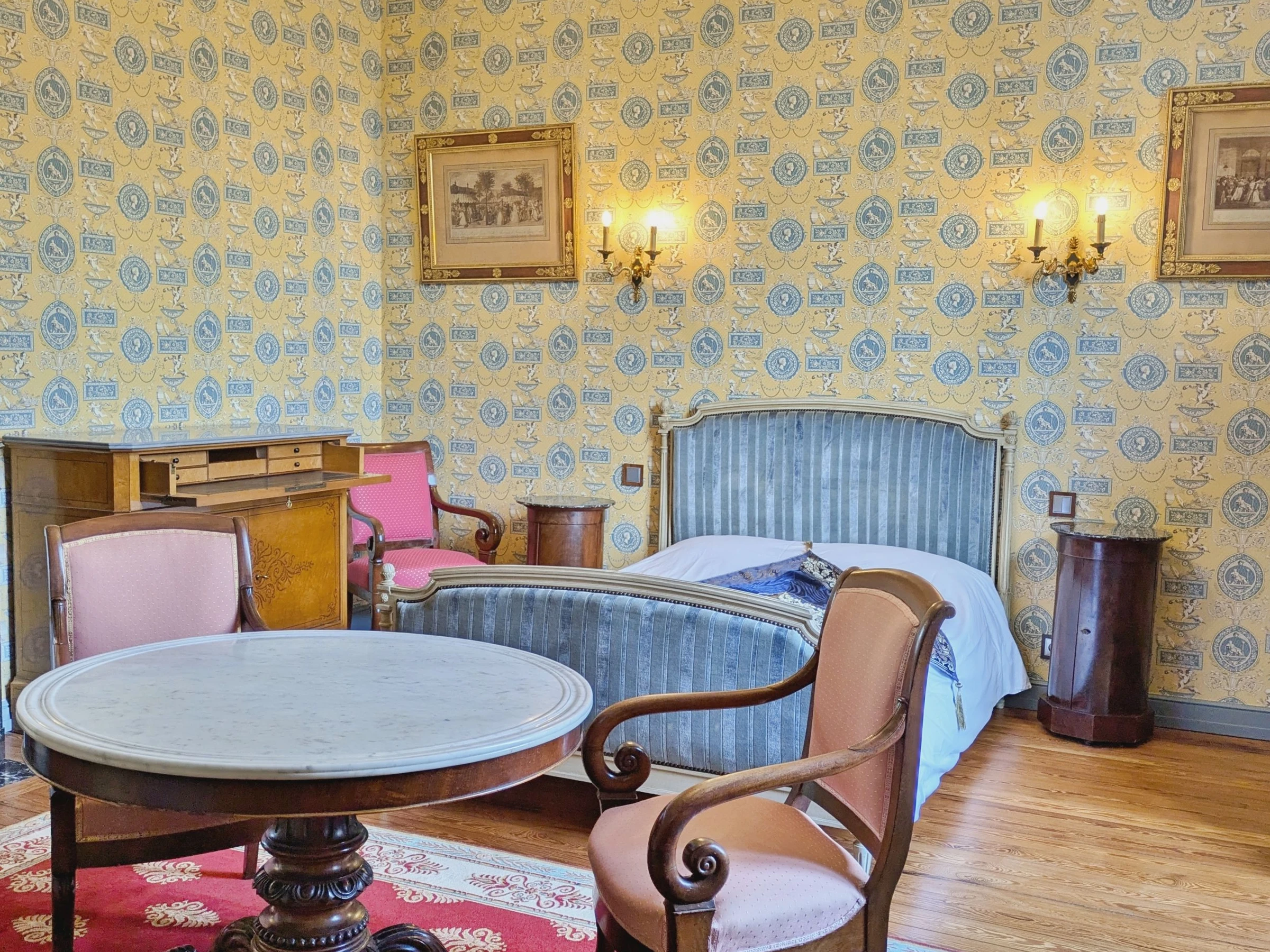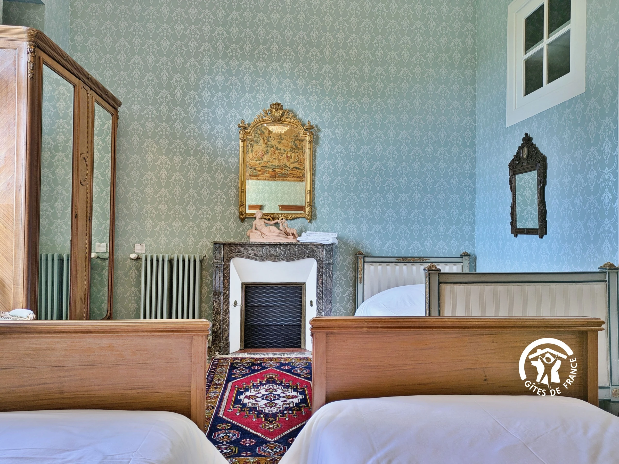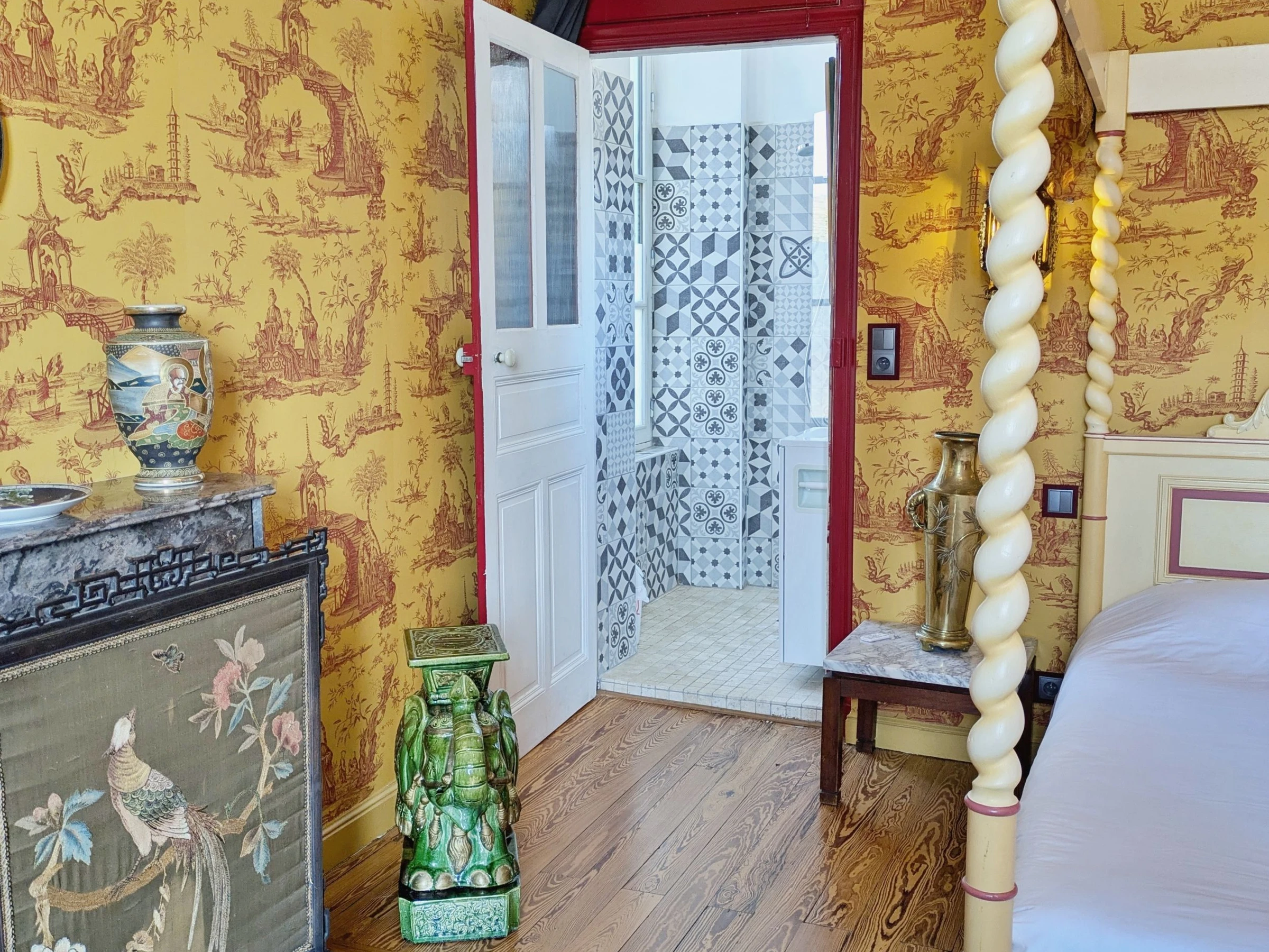 À l’étage, les cinq chambres spacieuses (de 21 à 26 m²) offrent un confort absolu. Chacune dispose de sa propre salle d’eau et arbore un style unique, fidèle à une époque : Empire, Louis XIII, Louis XV, Louis XVI… ou un charmant Parfum d’Asie.
