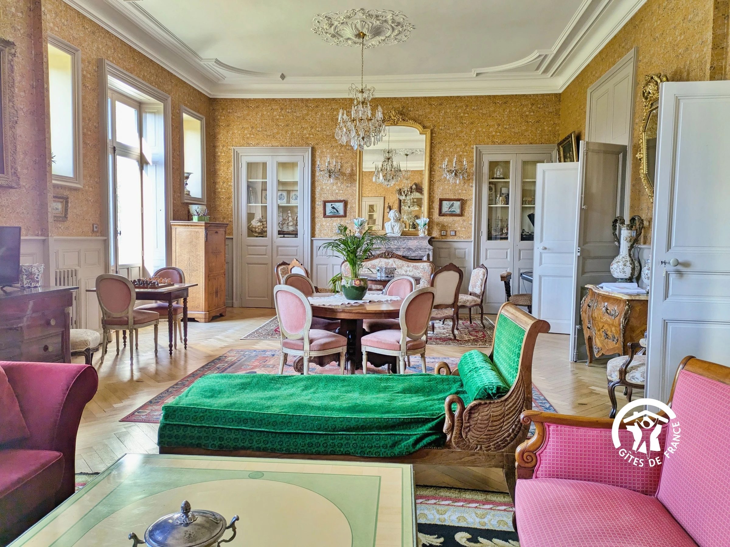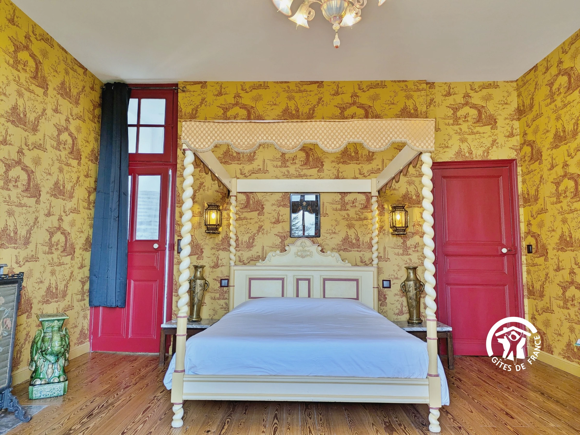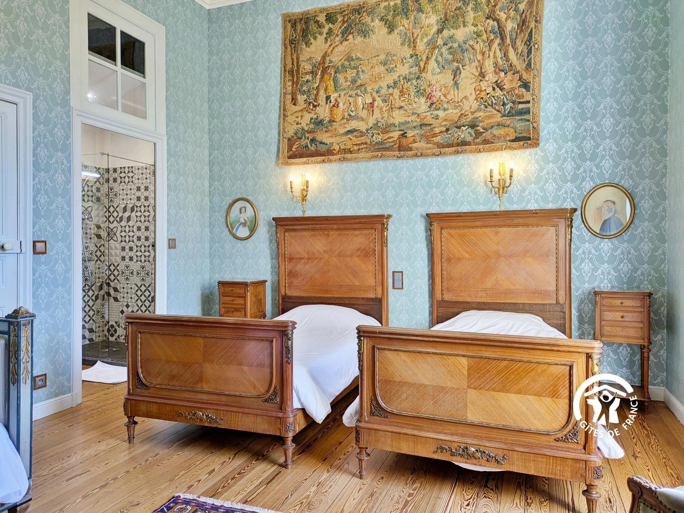 NIVEAU 1 - Accès par un escalier en fer à cheval confortable - 5 chambres - (1) Chambre Louis XVI 21m², 2 lits en 90*190cm et 1 lit en 100*190cm, salle d'eau privative avec vasque, douche et sèche serviettes - (2) Chambre Parfum d'Asie 26m², 1 lit 160*200 et 1 lit pliant à disposer dans la chambre souhaitée, petite salle d'eau privative avec douche et petit vasque - (3) Chambre Empire 22m², 1 lit 140*190, salle de bain privative avec baignoire, double vasque et sèche serviettes - (4) Chambre Louis XIII 22m², 1 lit 160*200, salle de bain privative avec baignoire, double vasque, sèche serviette et sèche-cheveux - (5) Chambre Louis XV 21m², 1 lit 140*190, salle d'eau privative avec douche, vasque, sèche serviettes et sèche-cheveux - 1 WC indépendant avec lave-mains.