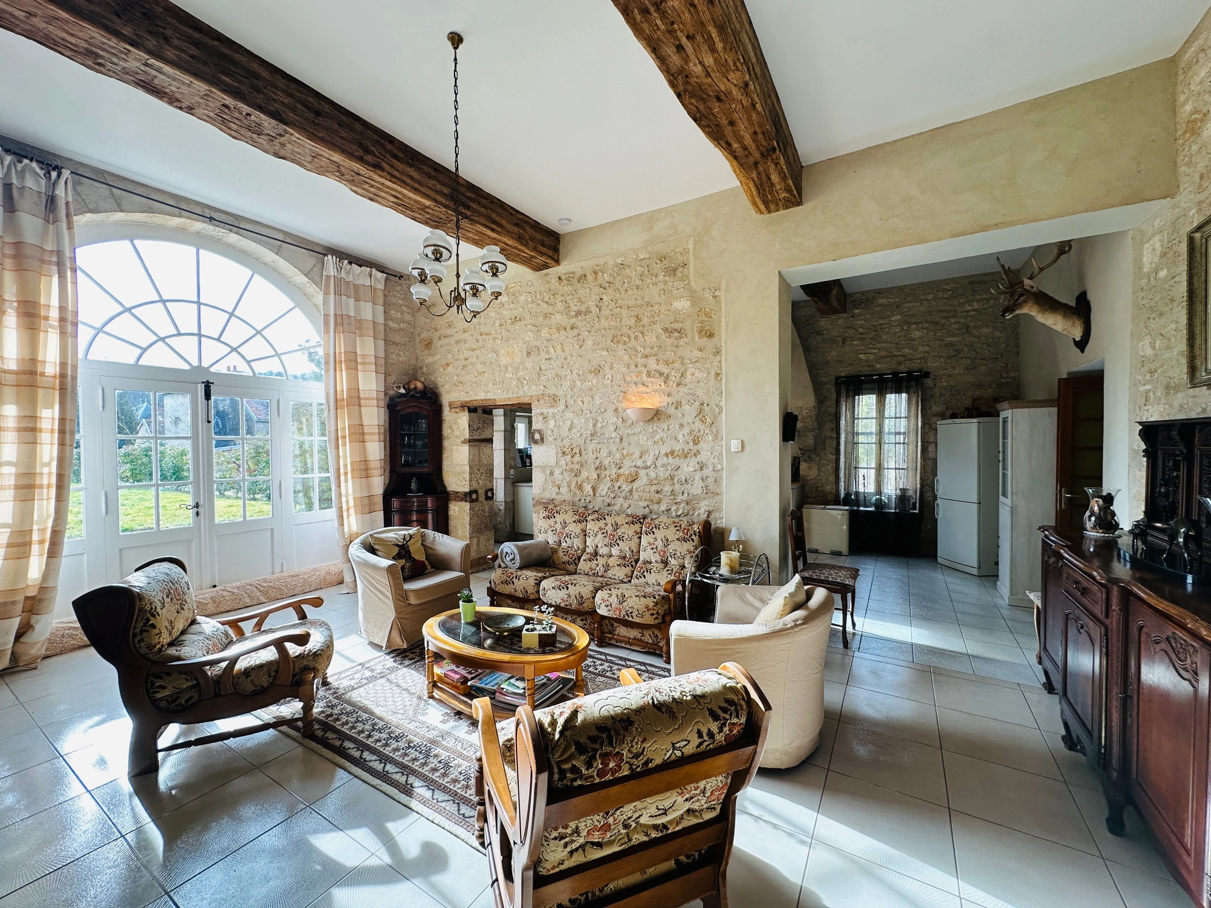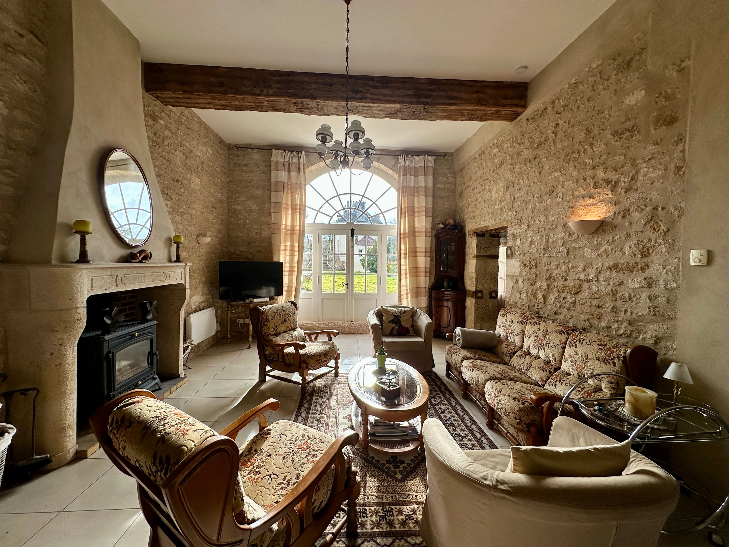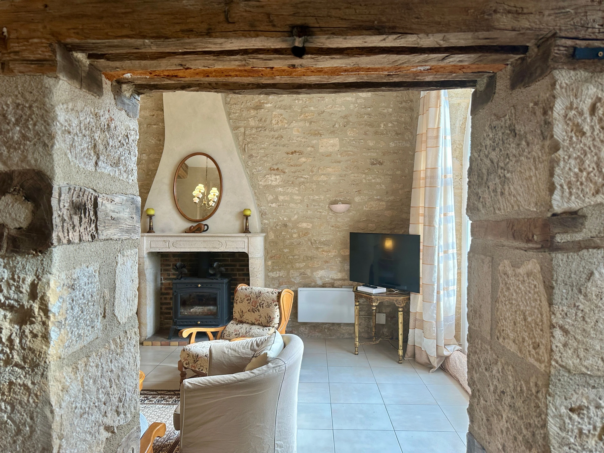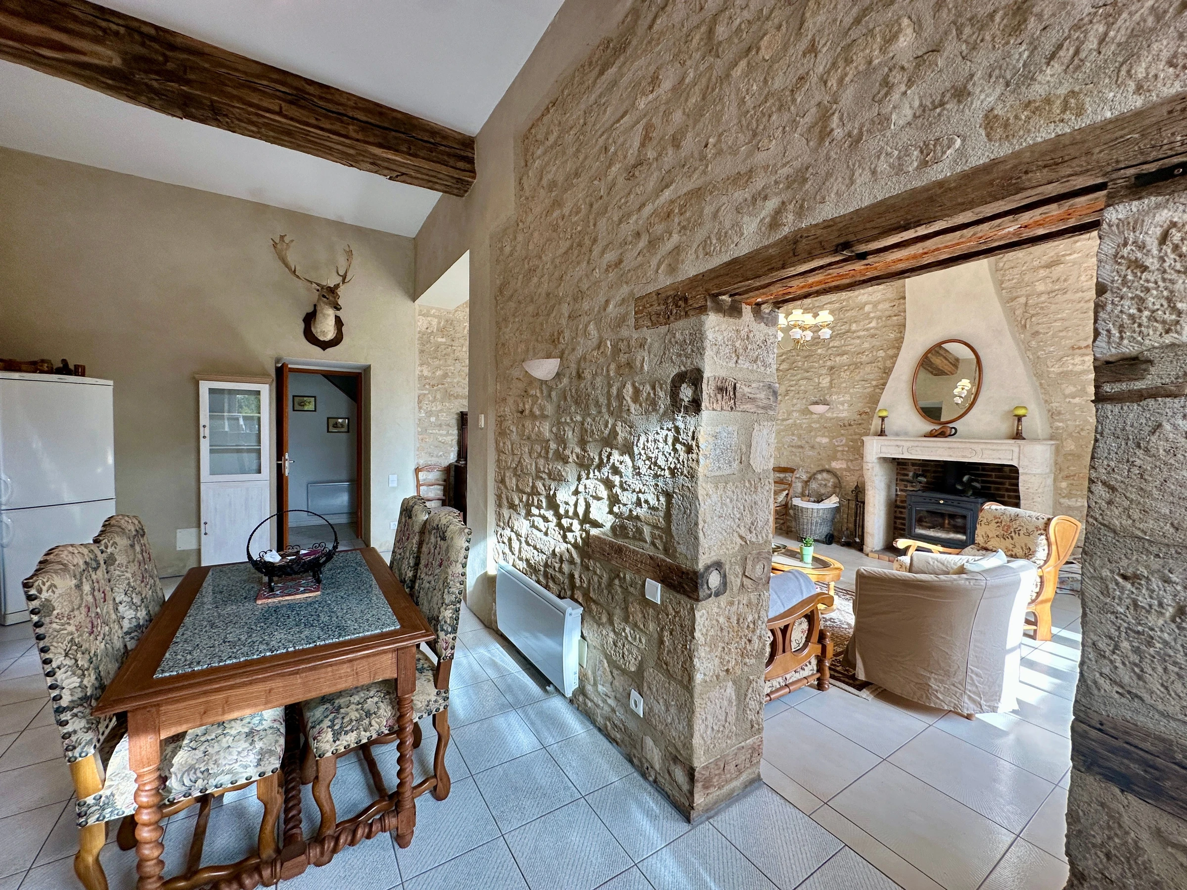 Au rez-de-chaussée, vous profiterez d’une vaste pièce de vie chaleureuse où les matériaux nobles (pierres apparentes, poutres) se marient élégamment à une décoration soignée : vous disposez d’une cuisine entièrement équipée, ouverte sur un salon confortable avec télévision écran plat et poêle à bois (bois fourni).WC indépendants