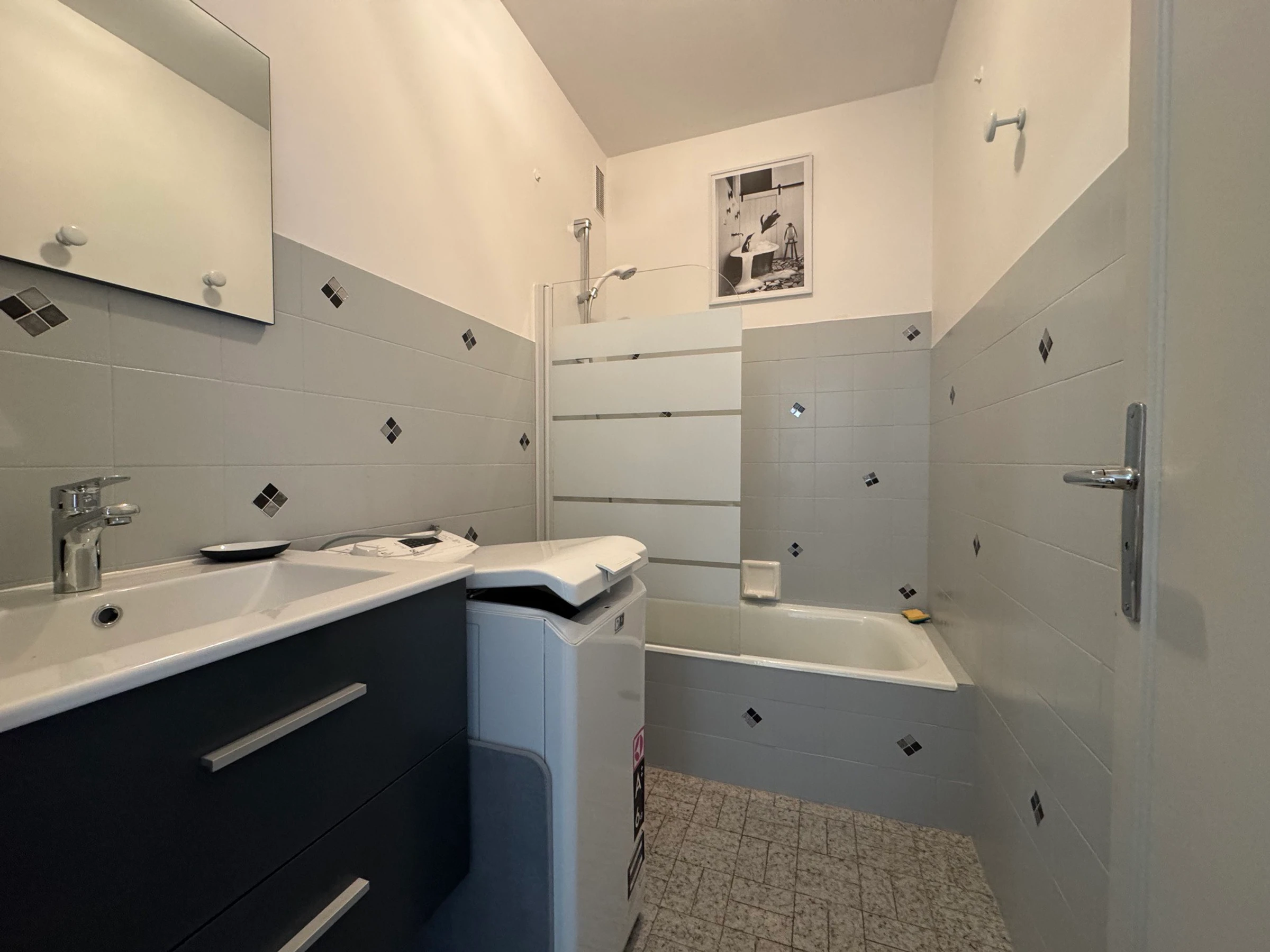 - SALLE DE BAINS (carrelage – peinture et faïence) : baignoire avec rideau, lavabo, lave-linge, meuble de rangements, miroir.