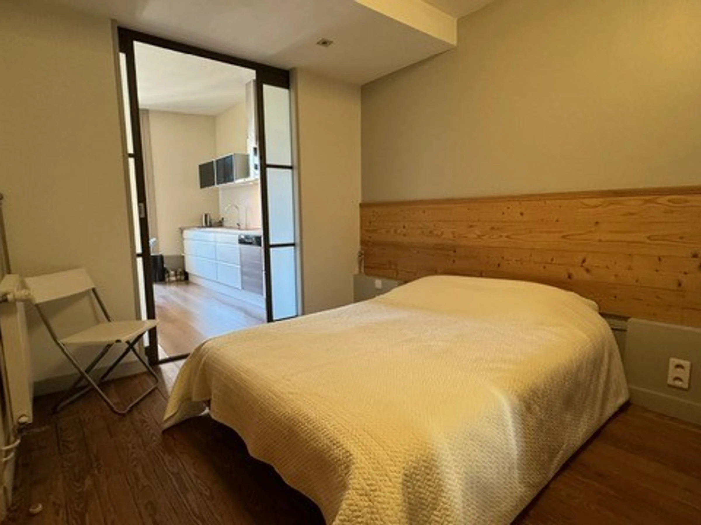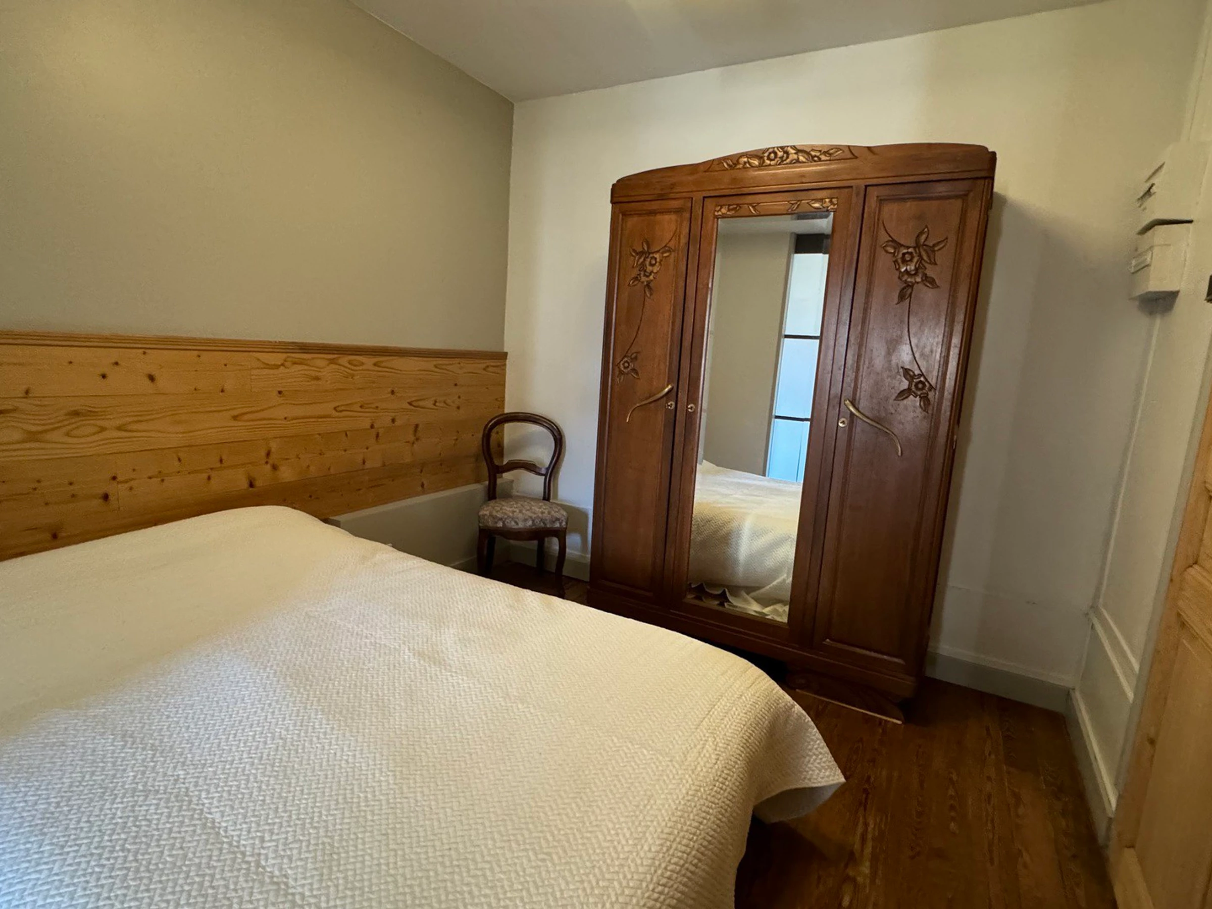 - CHAMBRE 1 (parquet - peinture) : lit 140 cm, 1 lampe de chevet, armoire avec étagères/penderie porte miroir, 2 oreillers, couette, jeté de lit, pas de fenêtre directe mais lumière par portes sablées coulissantes, 2 chaises