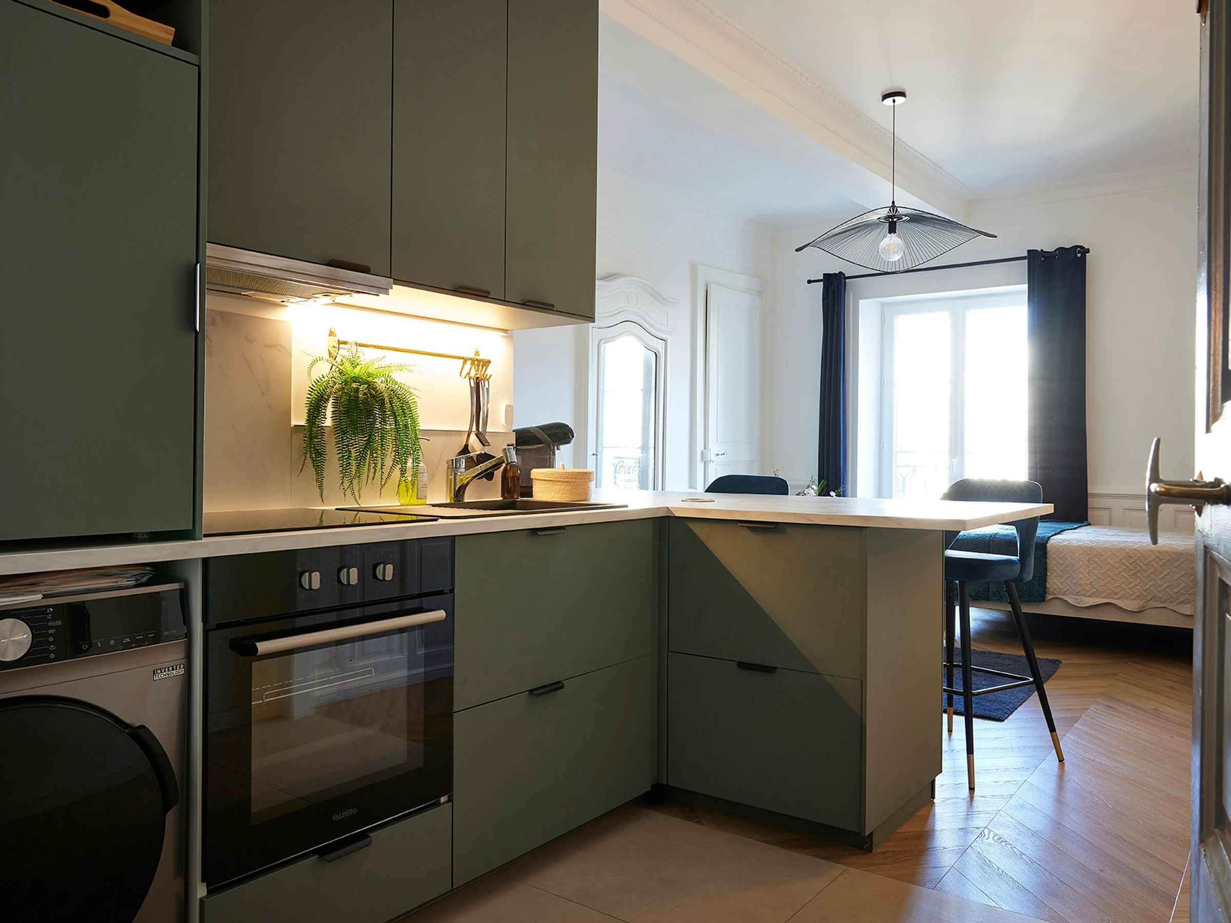 - CUISINE OUVERTE(Parquet – peinture) : meubles hauts / bas, évier 1 bac avec égouttoir, plaque induction 4 feux, four, hotte, réfrigérateur/freezer, lave-linge, cafetière Dolce-Gusto, bouilloire, grille-pain, espace repas + 2 chaises hautes, ustensiles. - COIN NUIT (parquet – peinture) :lampe, miroir, 1 lit x (140x200cm), oreillers, couette, plaid,