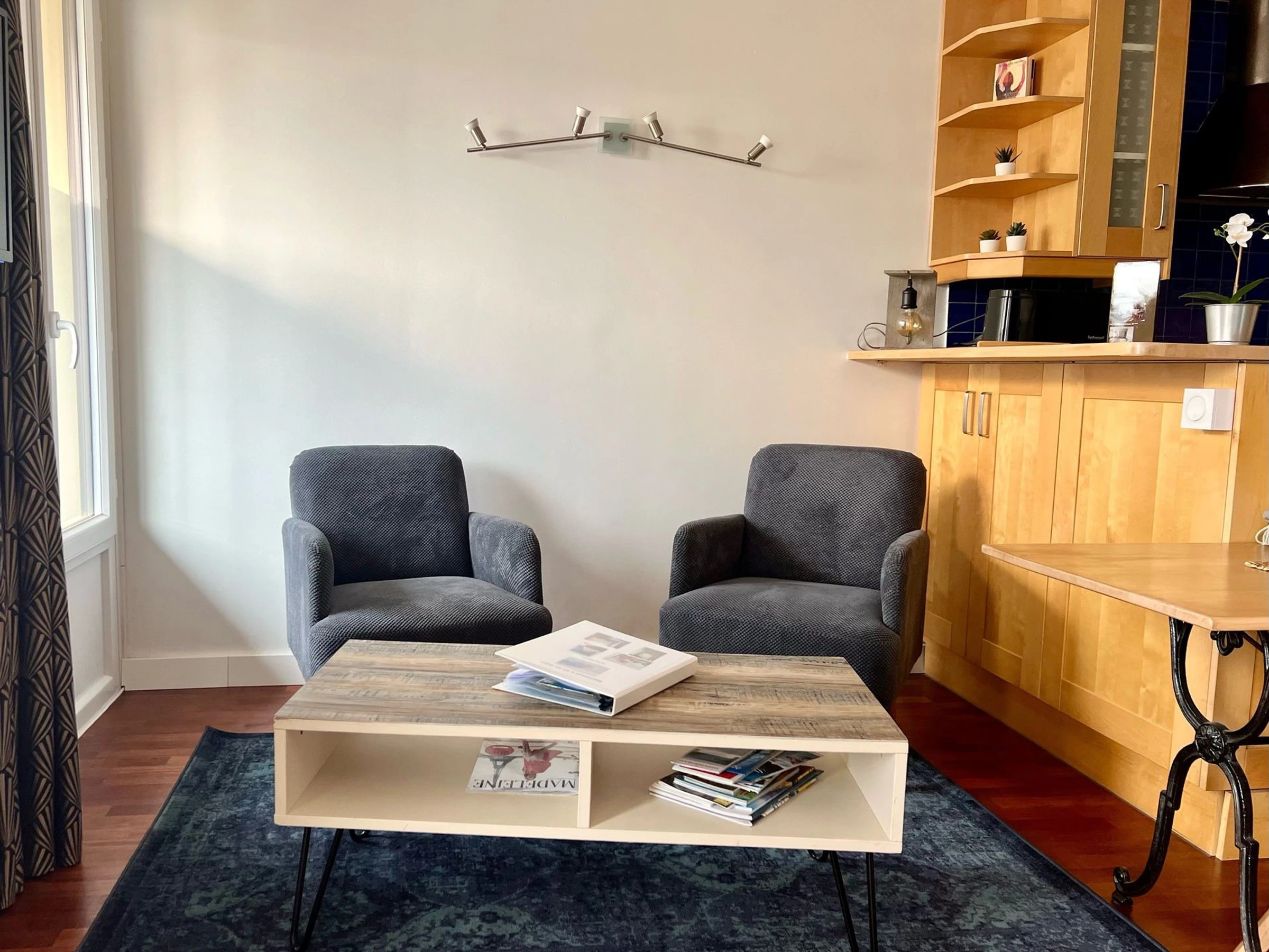 * Coin Salon/séjour : 2 fauteuils, 1 table basse, 1 télévision sur bras amovible, meuble de rangements