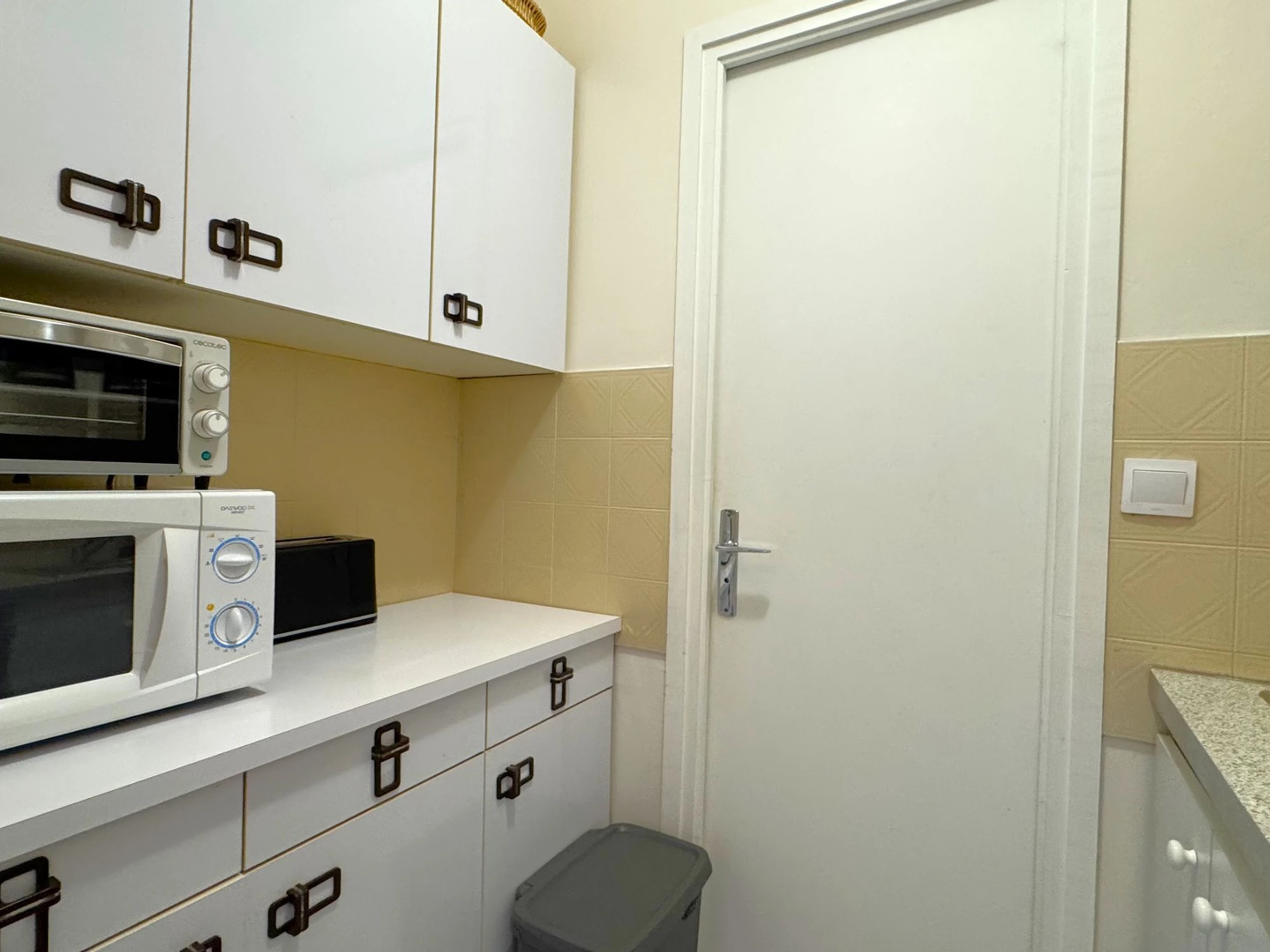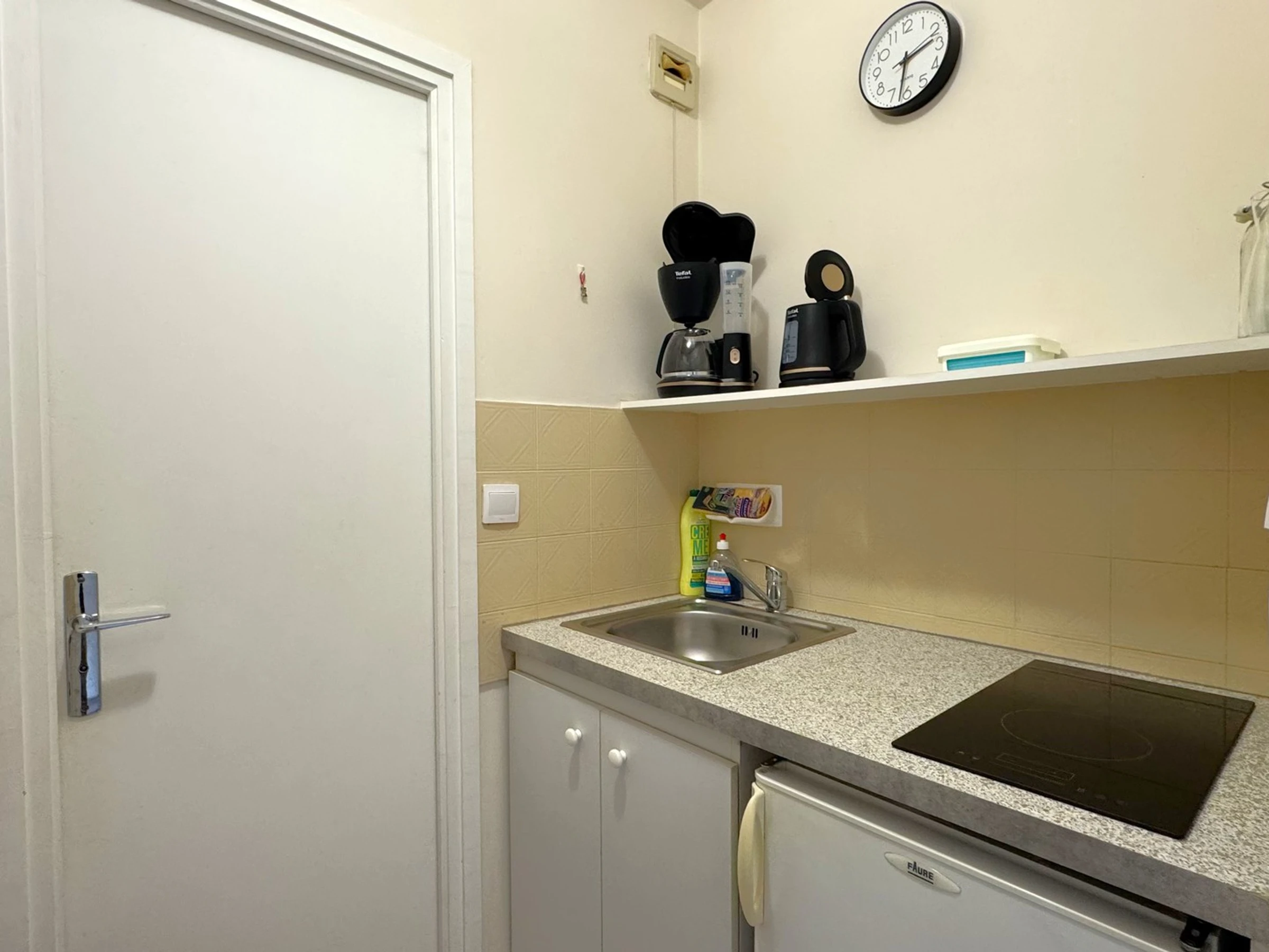 - KITCHENETTE (carrelage – peinture et faïence) : meubles hauts et bas, évier 1 bac, plaque induction 2 feux, micro-ondes, mini-four, cafetière, réfrigérateur, vaisselle et ustensiles divers.