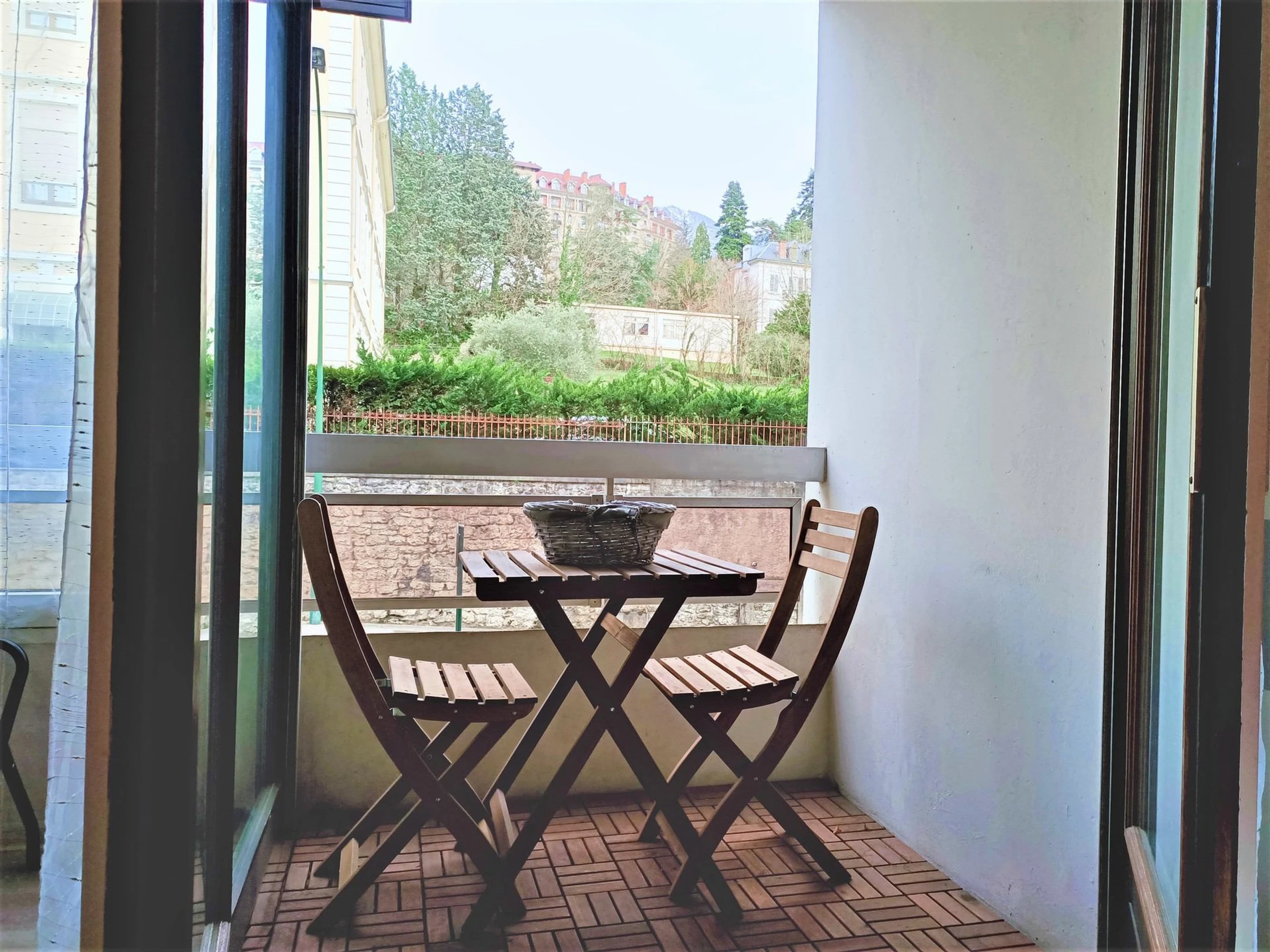 - BALCON (caillebottis) : 1 table pliante, 2 chaises pliantes. Vue sur jardin et sur l'Eglise Notre-Dâme d'Aix-Les-Bains.