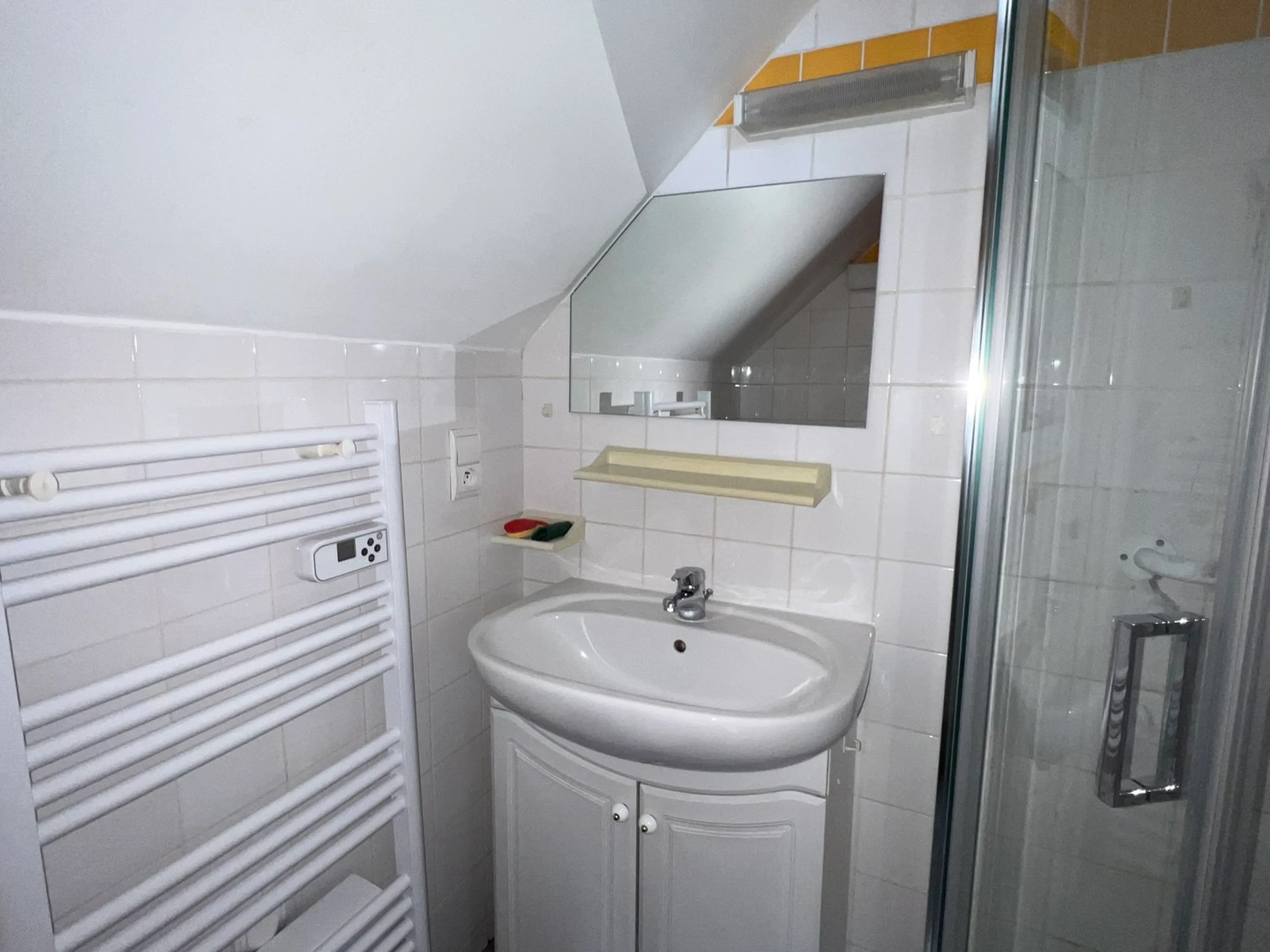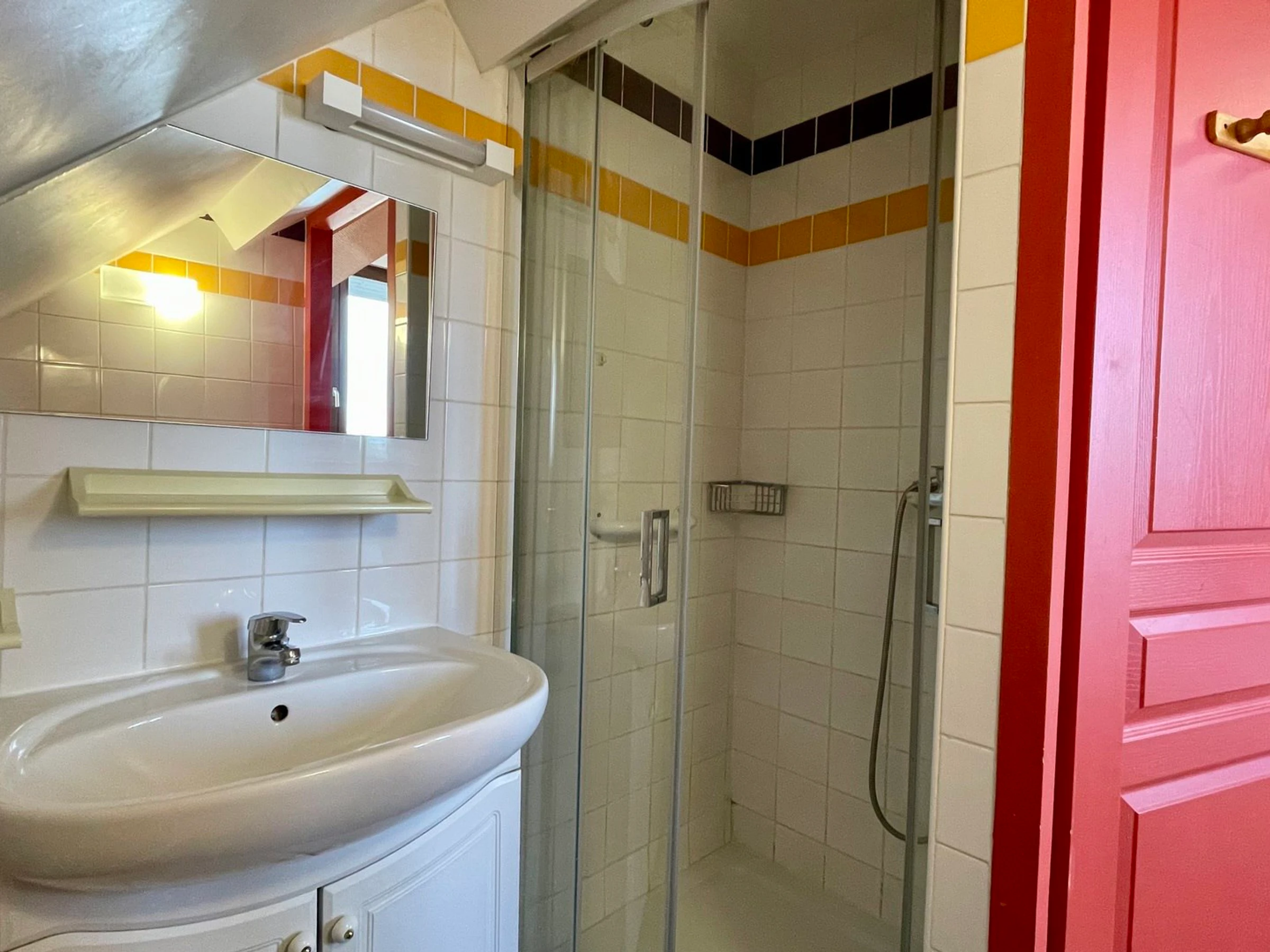 - SALLE D’EAU AVEC WC (carrelage – peinture et faïence) : douche avec bac, vasque avec meuble, miroir, WC, sèche-serviette électrique.