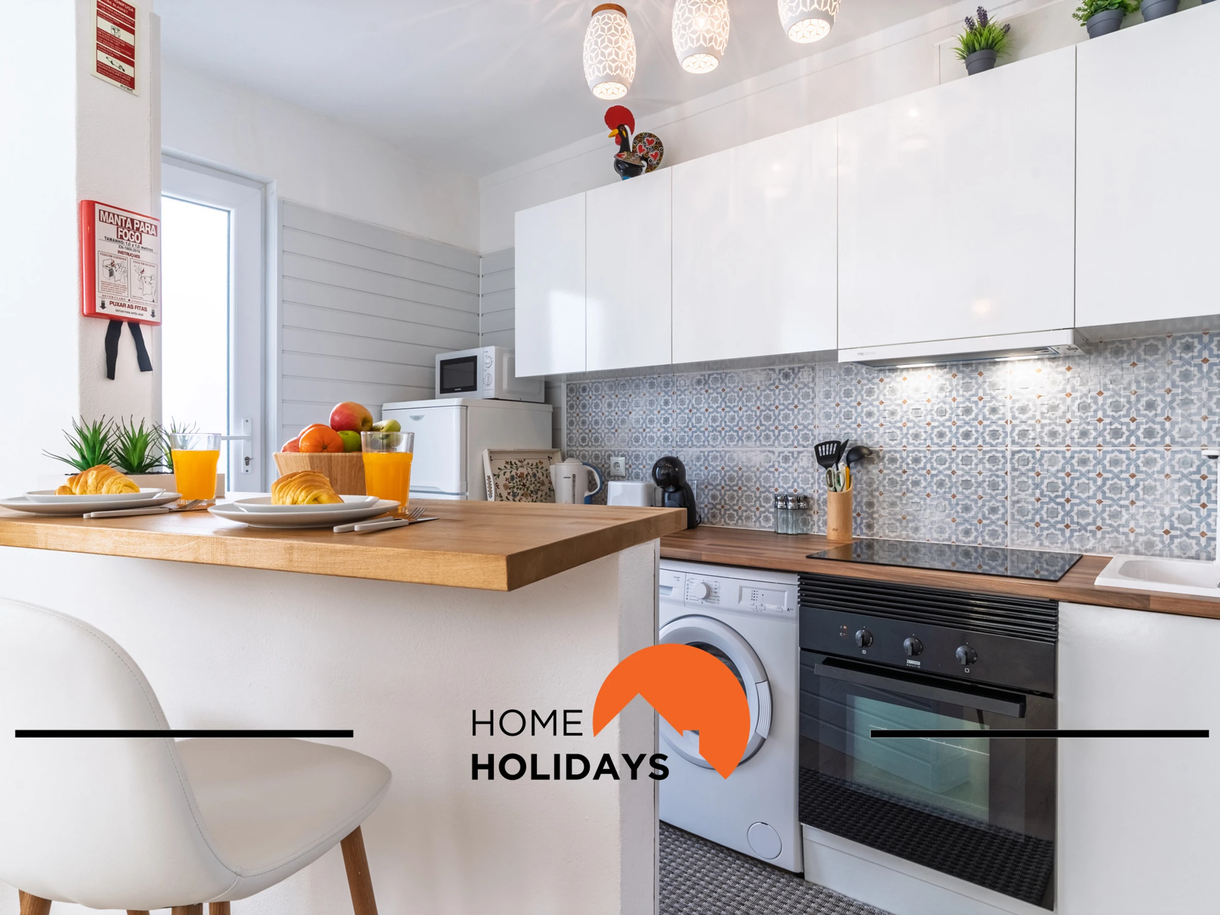 La cuisine américaine, à mixte: gaz et électricité, est équipée avec réfrigérateur, micro-ondes, four, congélateur, vaisselle/couverts, grille pain, bouilloire et assiettes et bols.