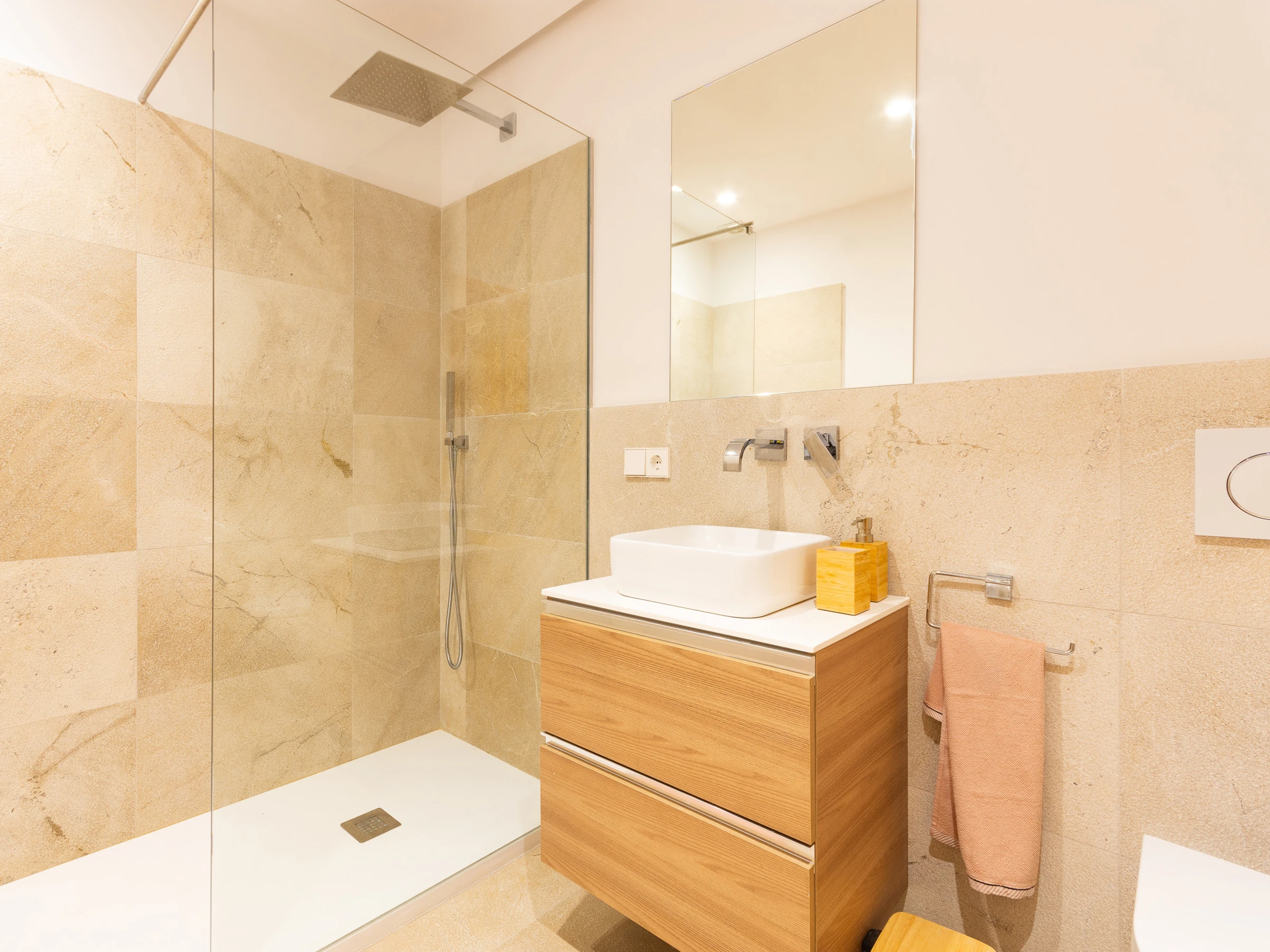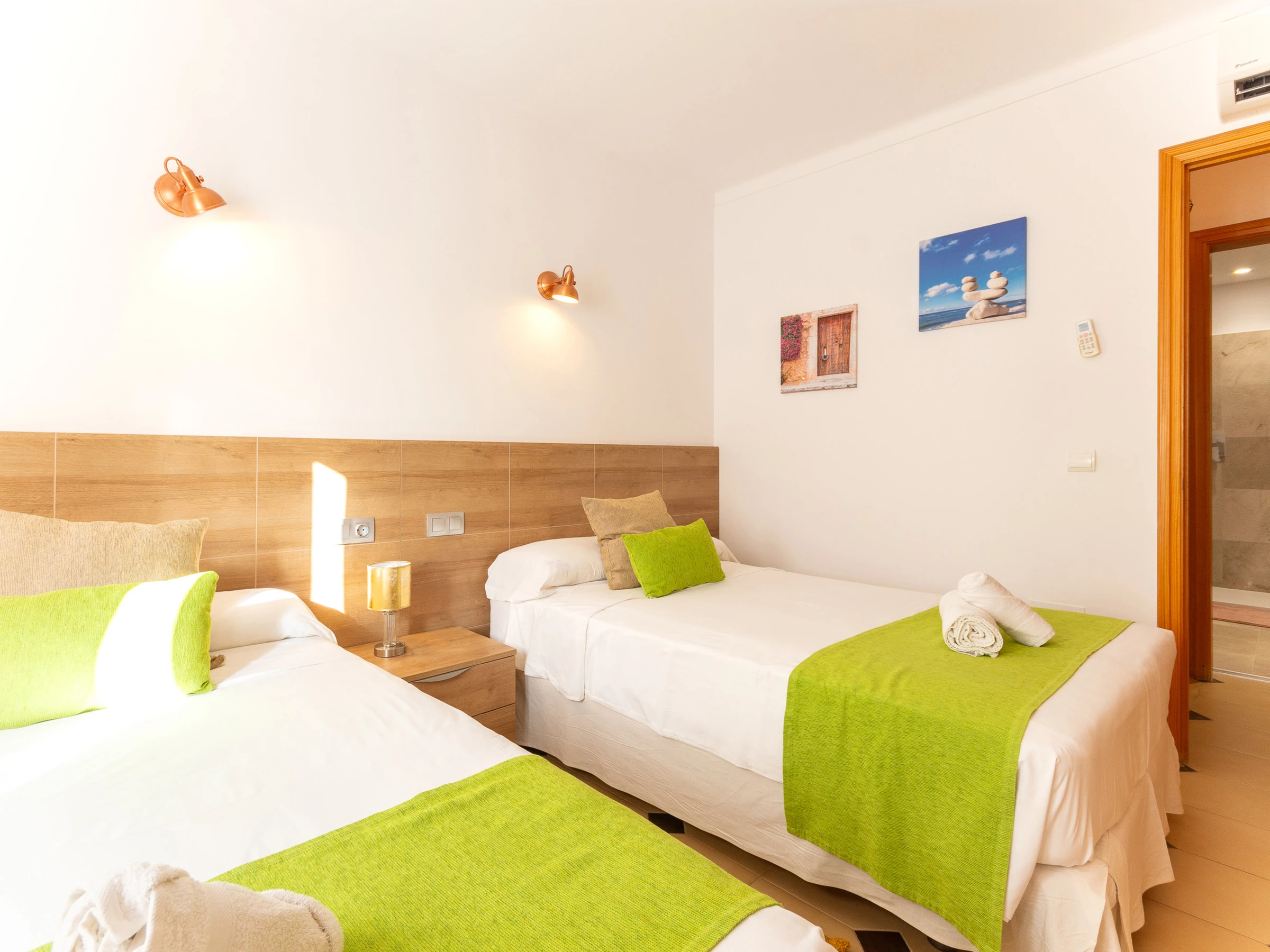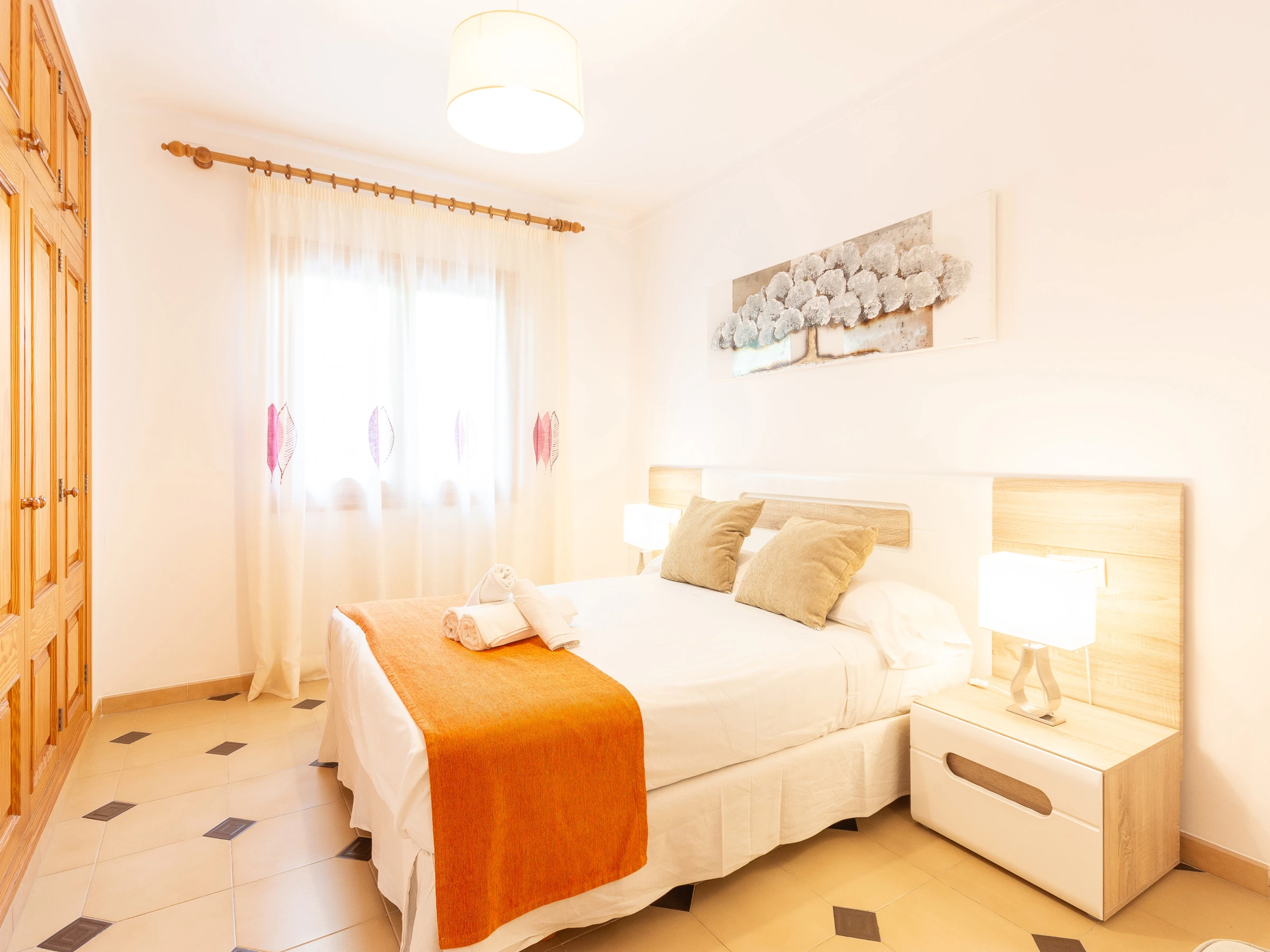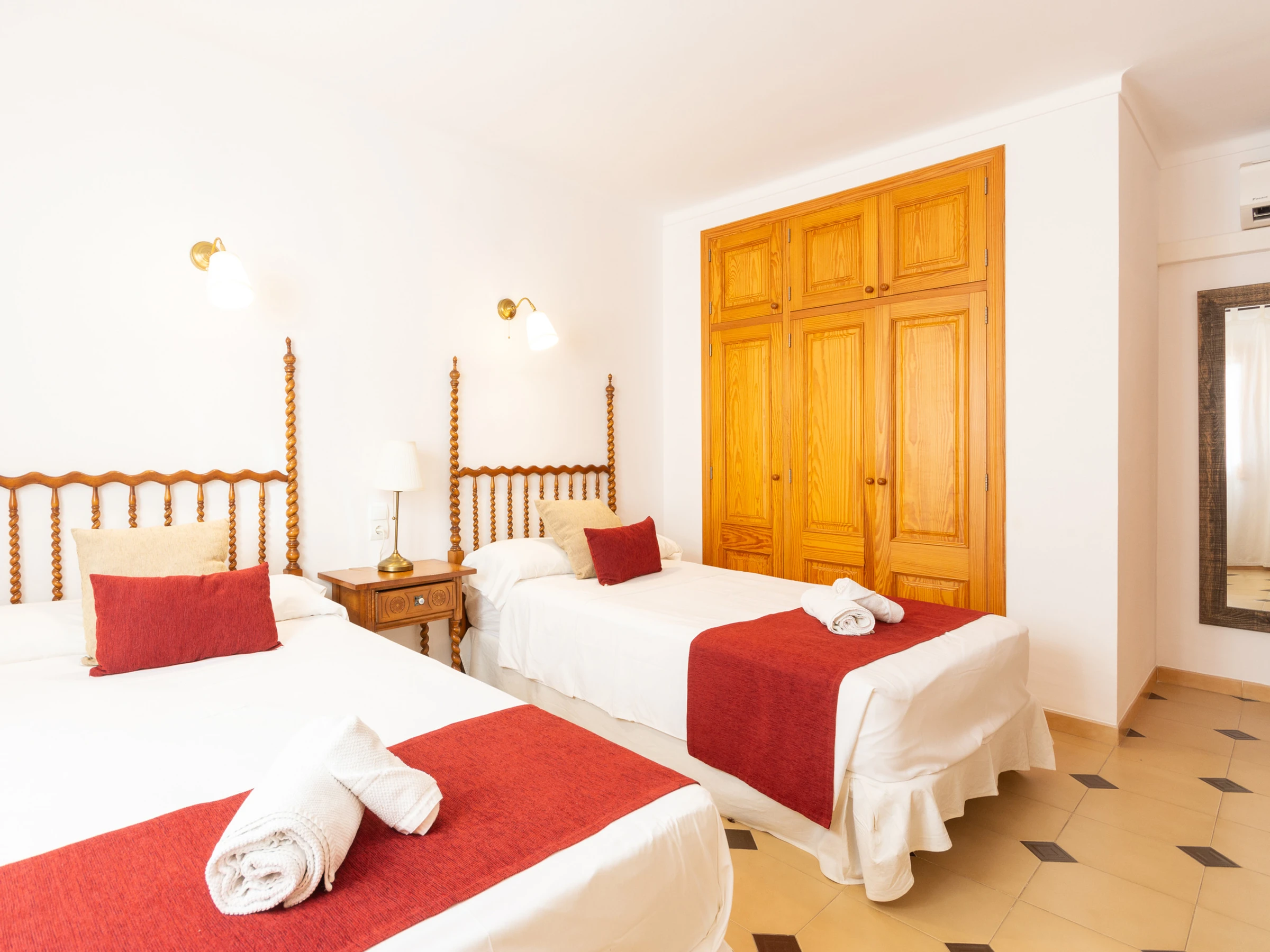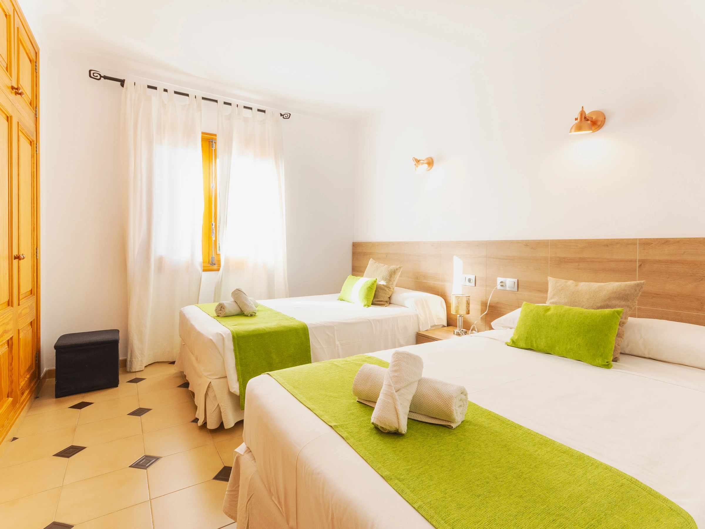 La villa dispose de 4 chambres : deux avec des lits individuels et deux avec des lits de couple, dont l'un dispose d'une salle de bain attenante. Une deuxième salle de bain, également équipée d'une douche, dessert le reste de la maison. Pour les familles avec enfants, un lit de bébé et une chaise haute sont disponibles sur demande.