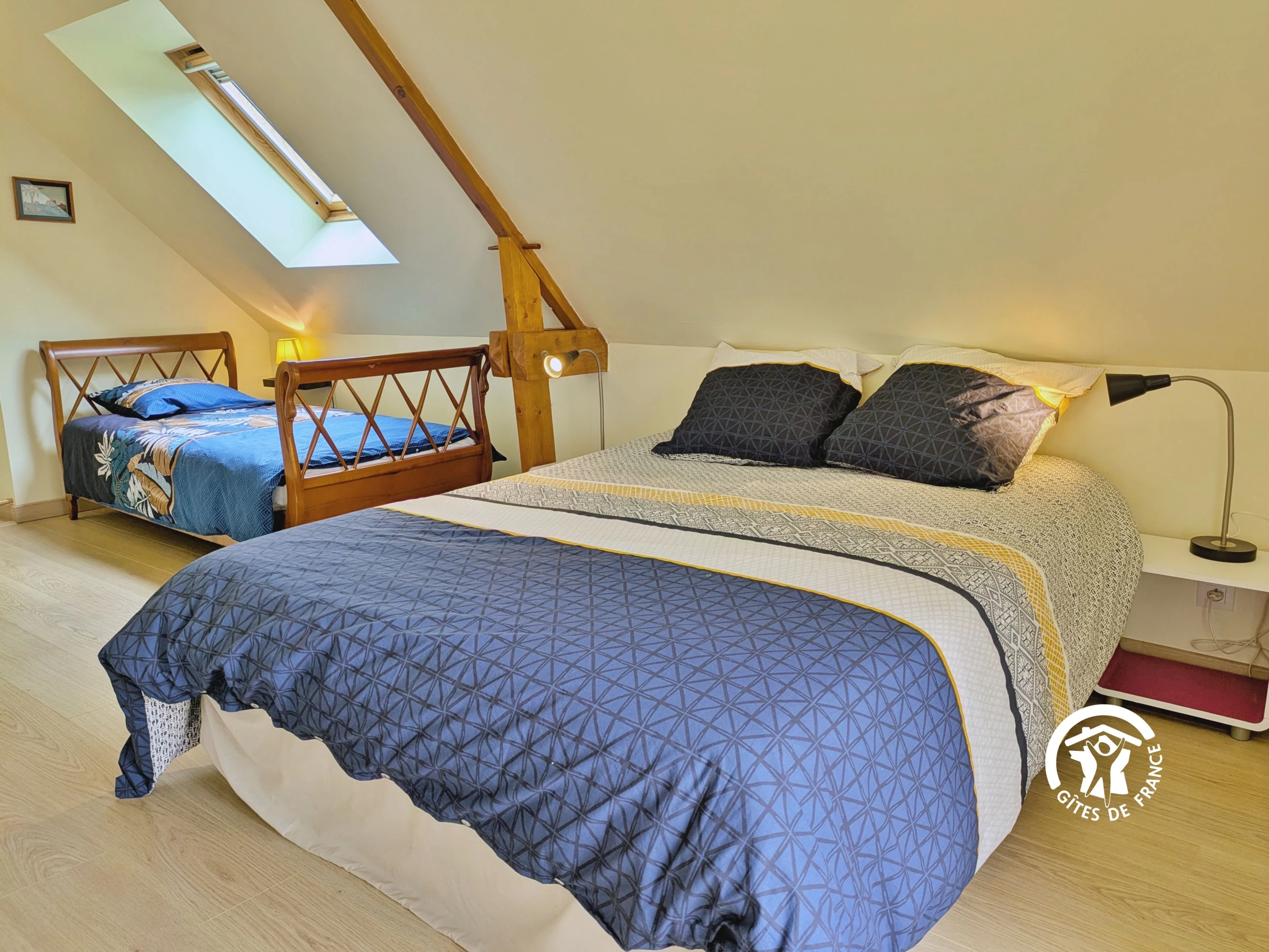 Dans cette maison, tout est par deux : 2 chambres (4 lits et un convertible), 2 salles d'eau et 2 espaces extérieurs clôturés : une cour pour garer deux véhicules et un jardin de 295m².