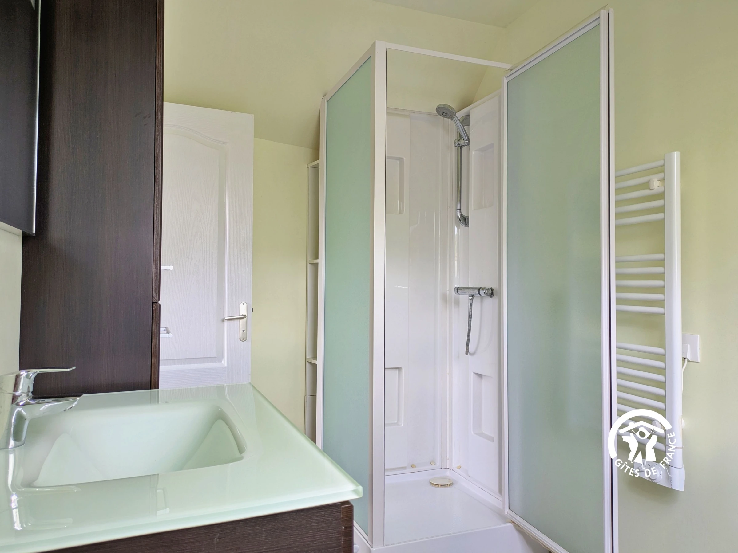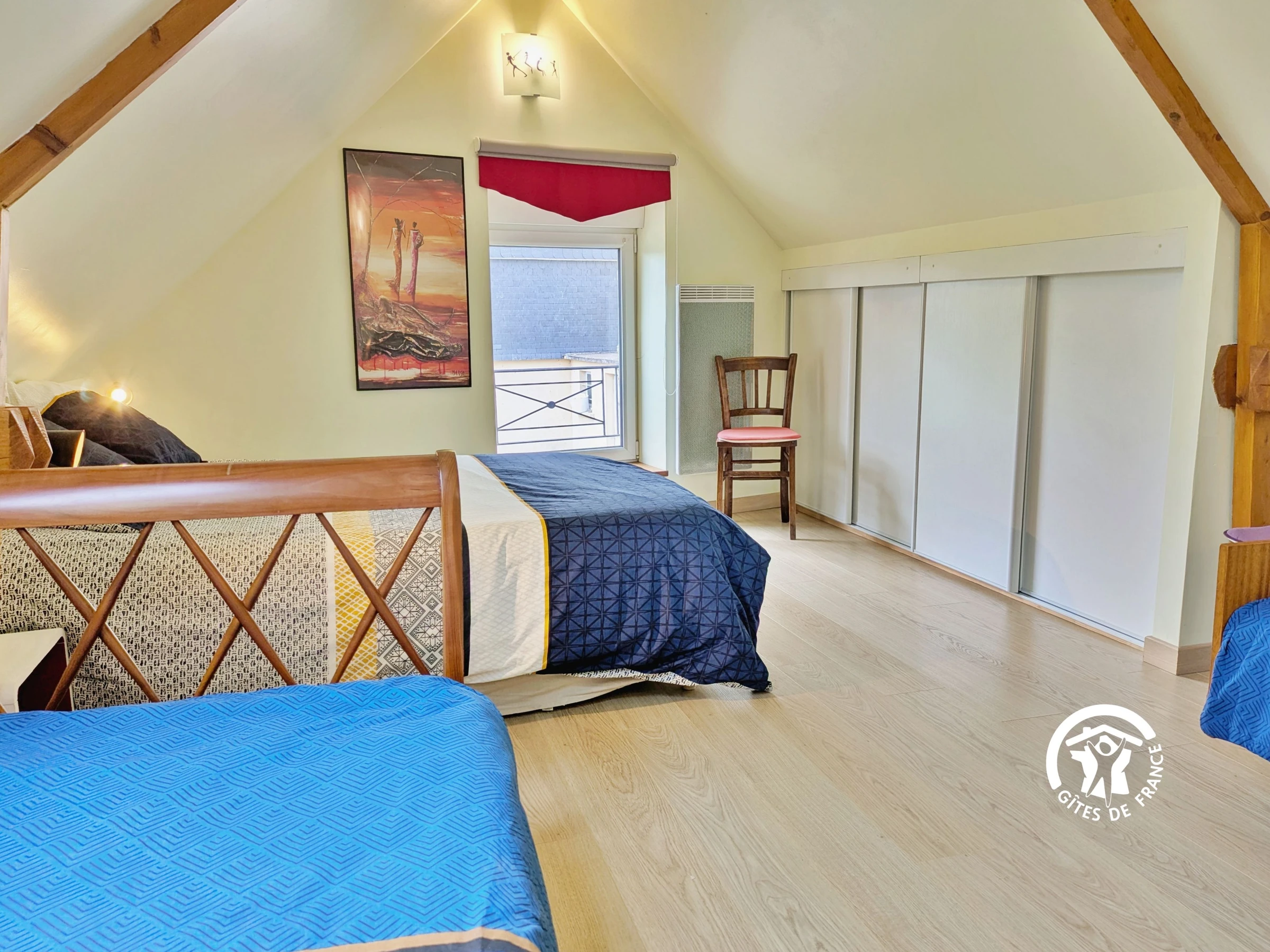 NIVEAU 1 - montée par escalier confortable - Palier avec canapé convertible 140x190 - Chambre (2) 9,2m² avec 1,8m sous plafond, 2 lits 90x190 et 1 lit 140x190, rangement penderie et étagères - Salle d'eau 4m² avec cabine de douche, lavabo, sèche serviettes, sèche-cheveux, WC.