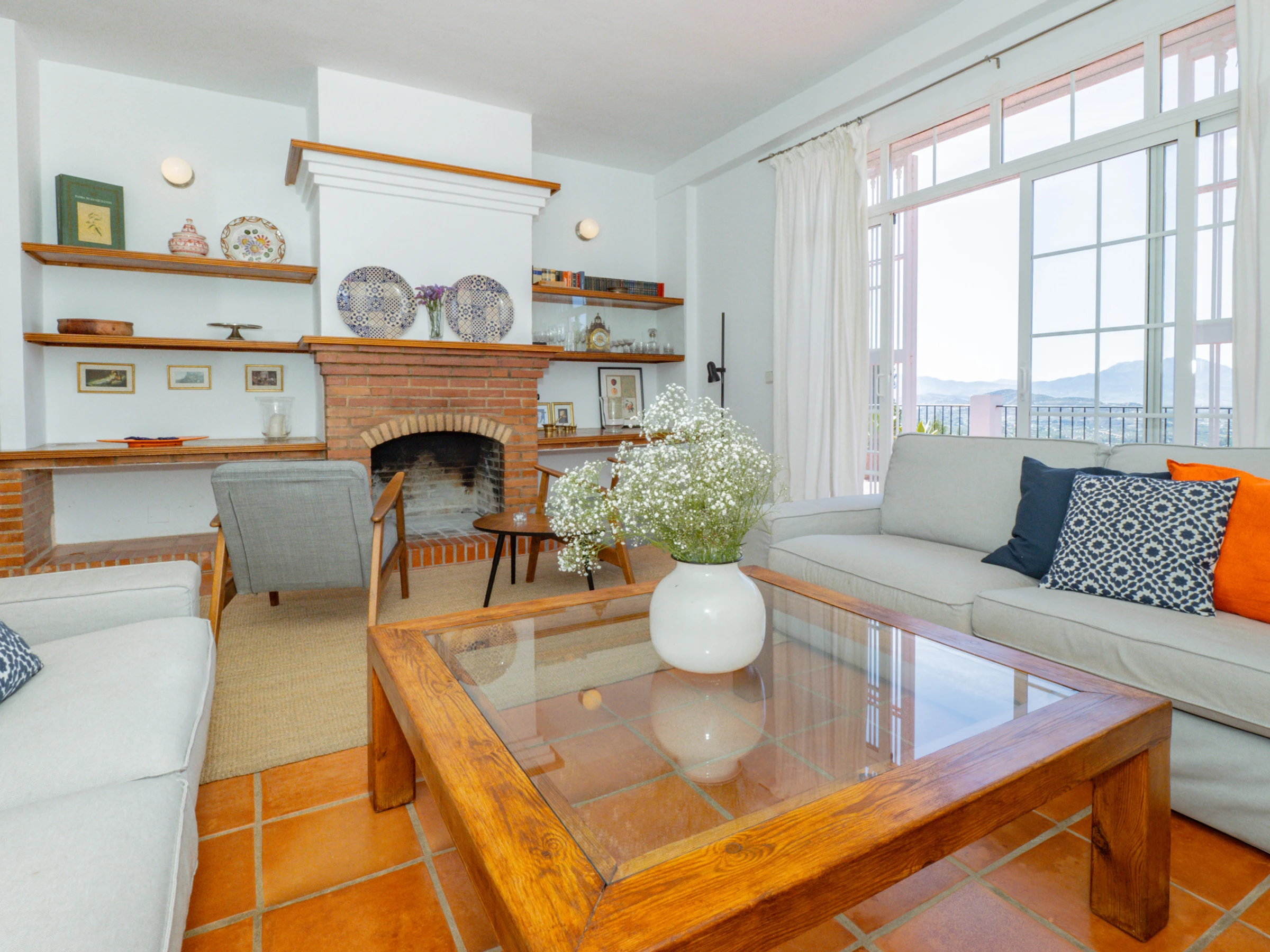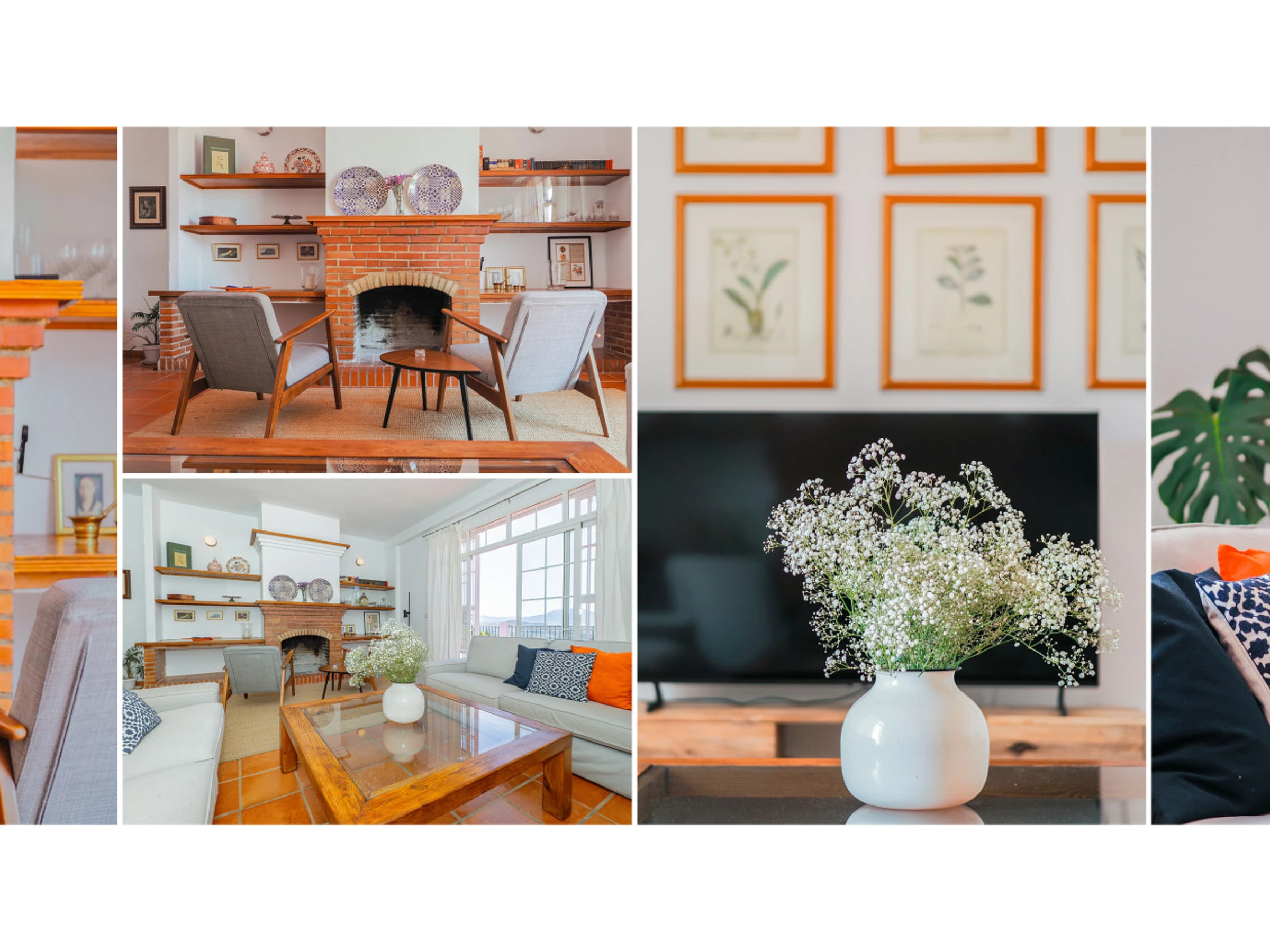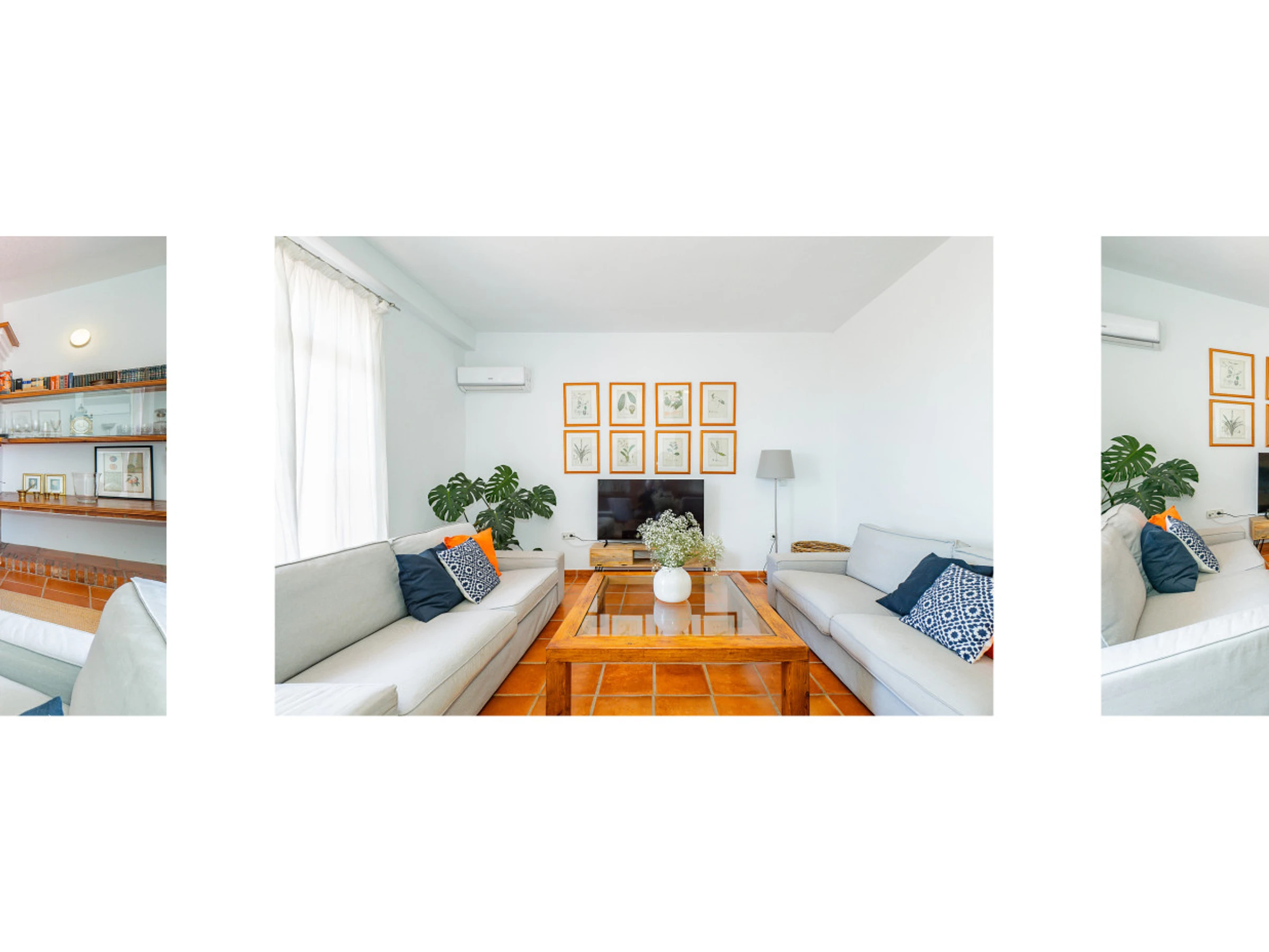 À l'intérieur, la maison offre trois salons aux ambiances différenciées : un salon-salle à manger contigu à la cuisine, idéal pour préparer et profiter des repas en famille ; un salon élégant avec cheminée et télévision qui se connecte à la terrasse ; et un troisième salon avec décoration classique, canapés confortables et une autre TV qui sépare les deux espaces de chambres, offrant intimité et confort.