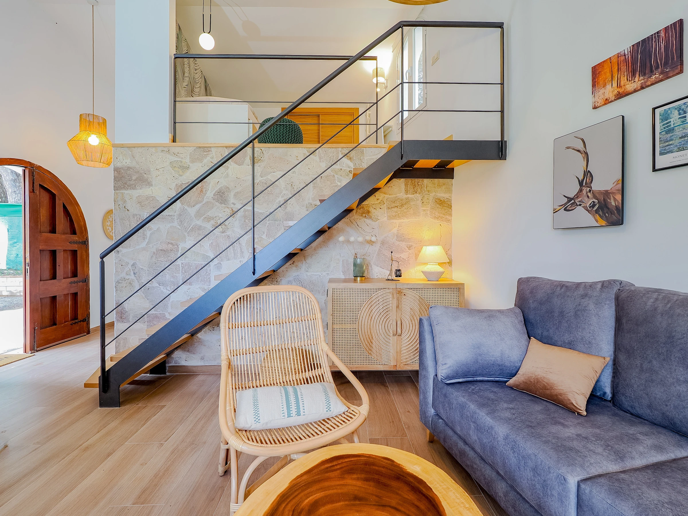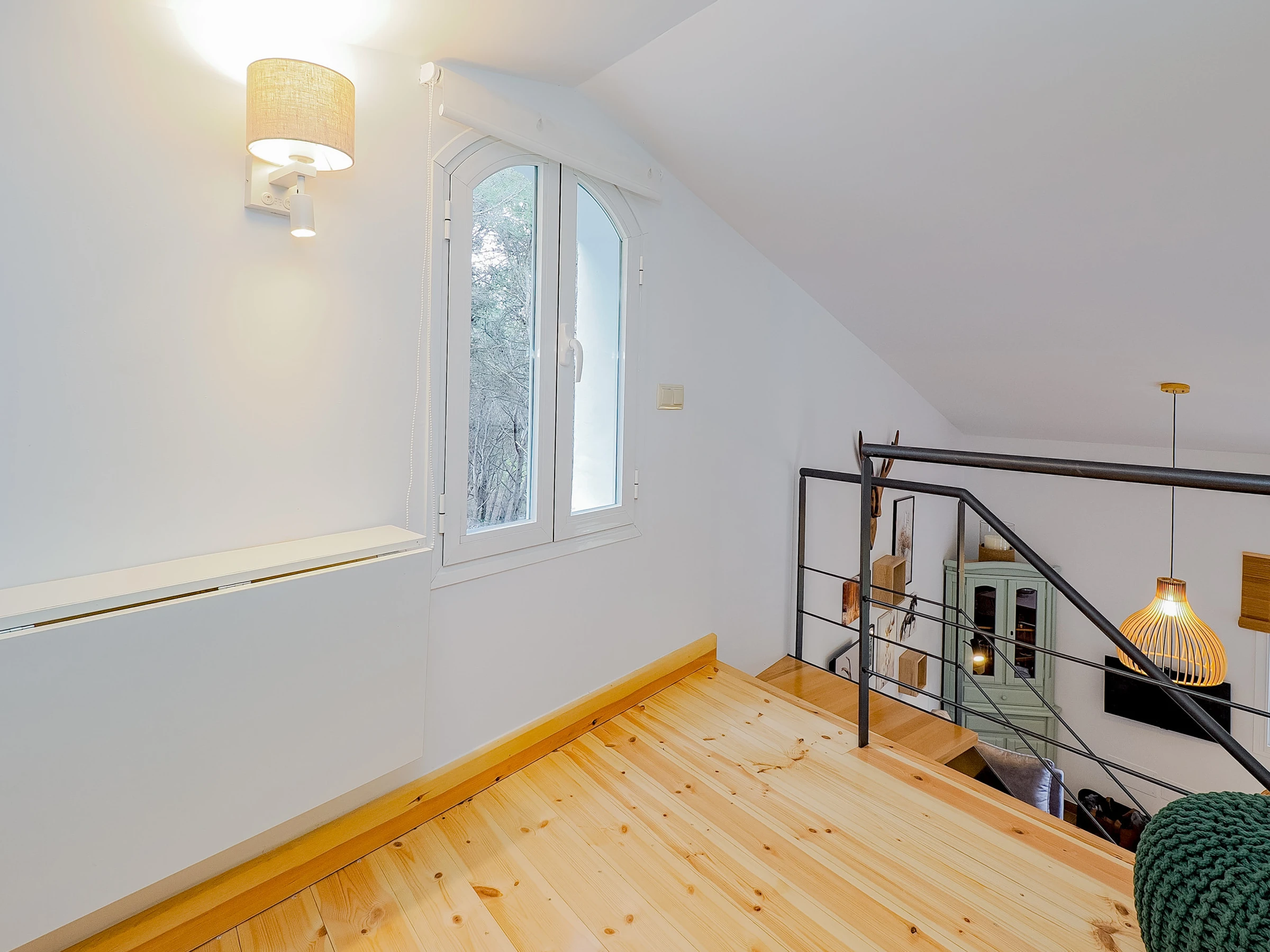 La maison dispose de deux chambres réparties sur deux étages : une chambre au rez-de-chaussée avec un lit de couple et une autre mansardée à l'étage supérieur avec deux lits individuels type gigogne, accessible par un escalier depuis le salon. Le salon-salle à manger est lumineux et moderne, relié à une cuisine américaine entièrement équipée avec des électroménagers de dernière génération (induction, lave-vaisselle, micro-ondes, four, réfrigérateur, congélateur, cafetière, grille-pain et plus), idéal pour préparer vos repas avec confort.