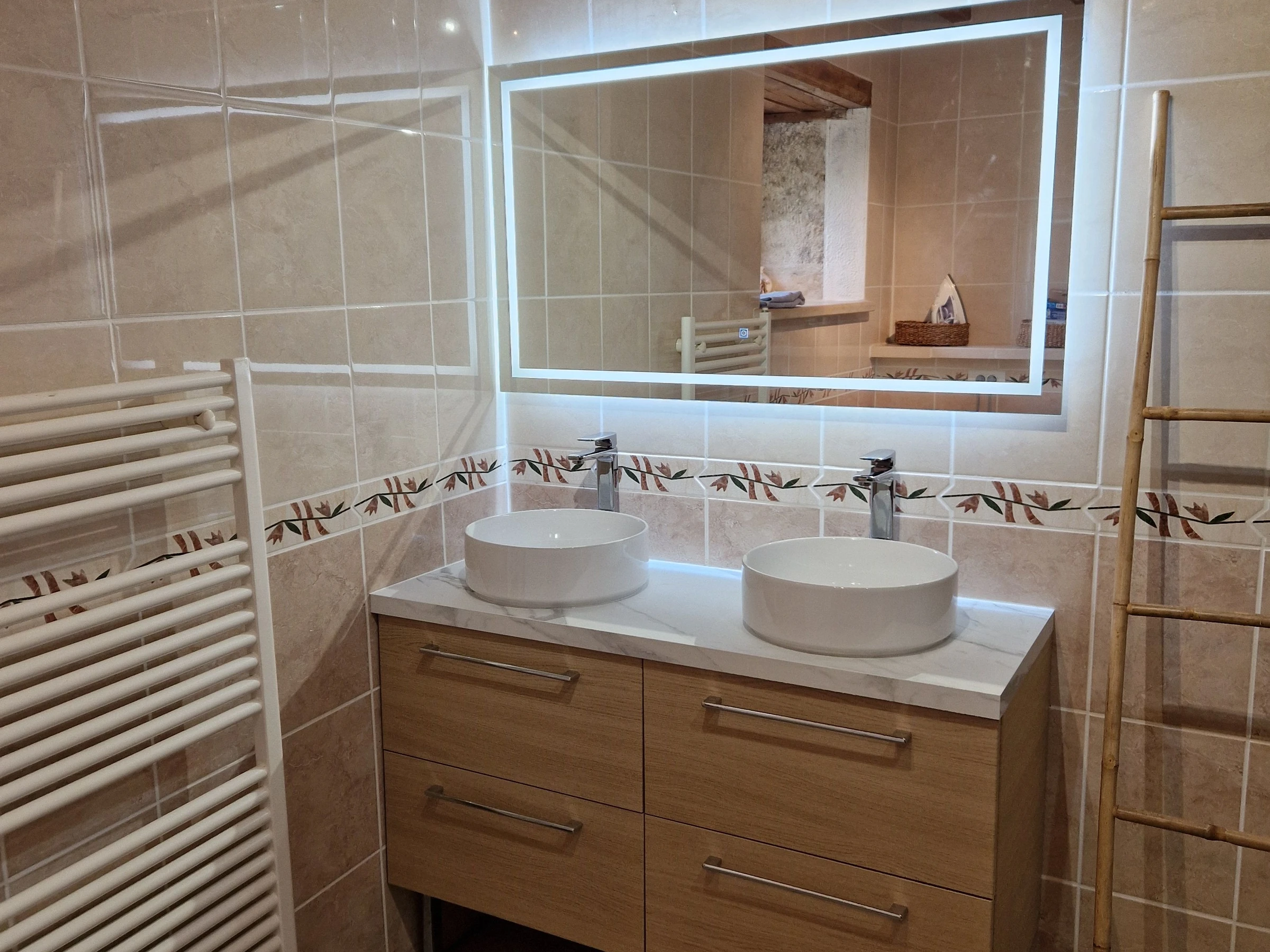 Au rez-de-chaussée une cuisine équipée, une spacieuse salle à manger avec pierres apparentes et cheminée (bois offert) et 2 chambres, l'une est dotée d'un lit 160cm, l'autre de 2 lits 90cm. Salle d'eau. WC..