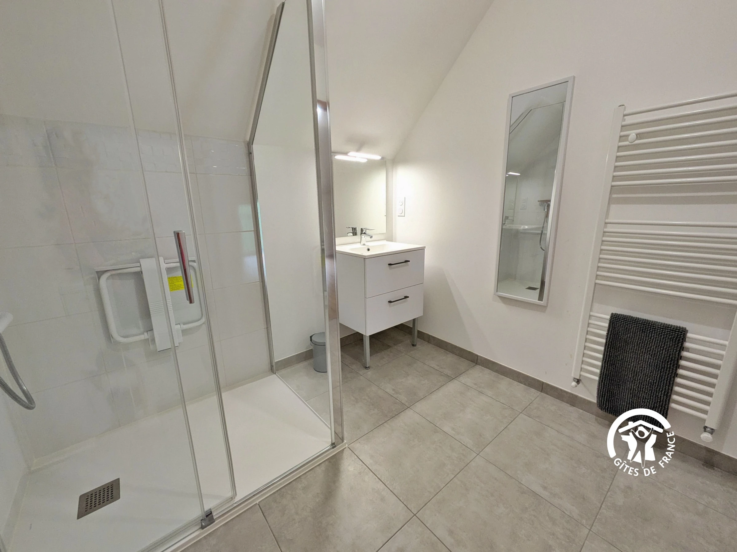 Gîte lumineux à la campagne avec de belles pièces de vie, 3 chambres avec chacune ses sanitaires privatifs. Terrasse et rez-de-chaussée accessibles aux personnes à mobilité réduite (PMR), sanitaires et cuisine adaptés également.