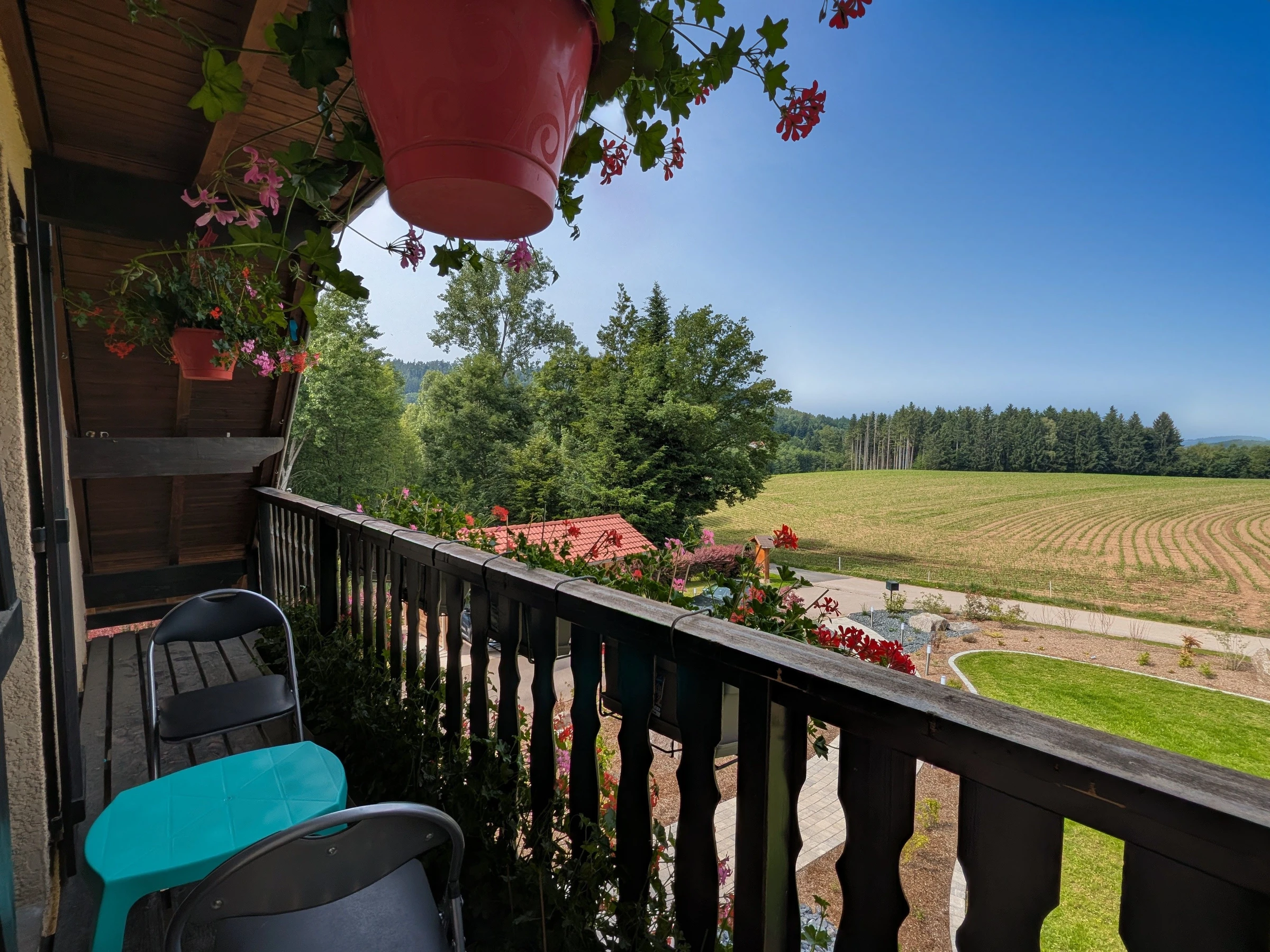 Situé au premier étage la Chambre Sapins est équipée d'un lit 2 pers. 160/200 cm avec balcon. WC avec lavabo attenant. Salle de bains privative (baignoire, douche) non attenante.