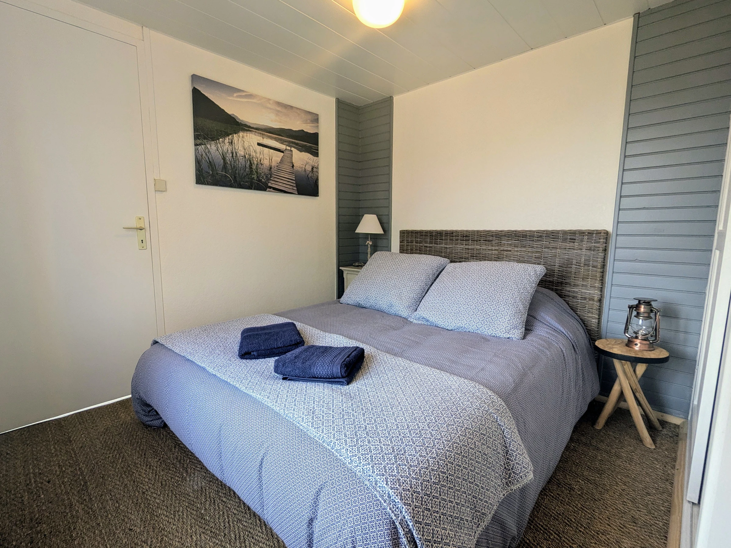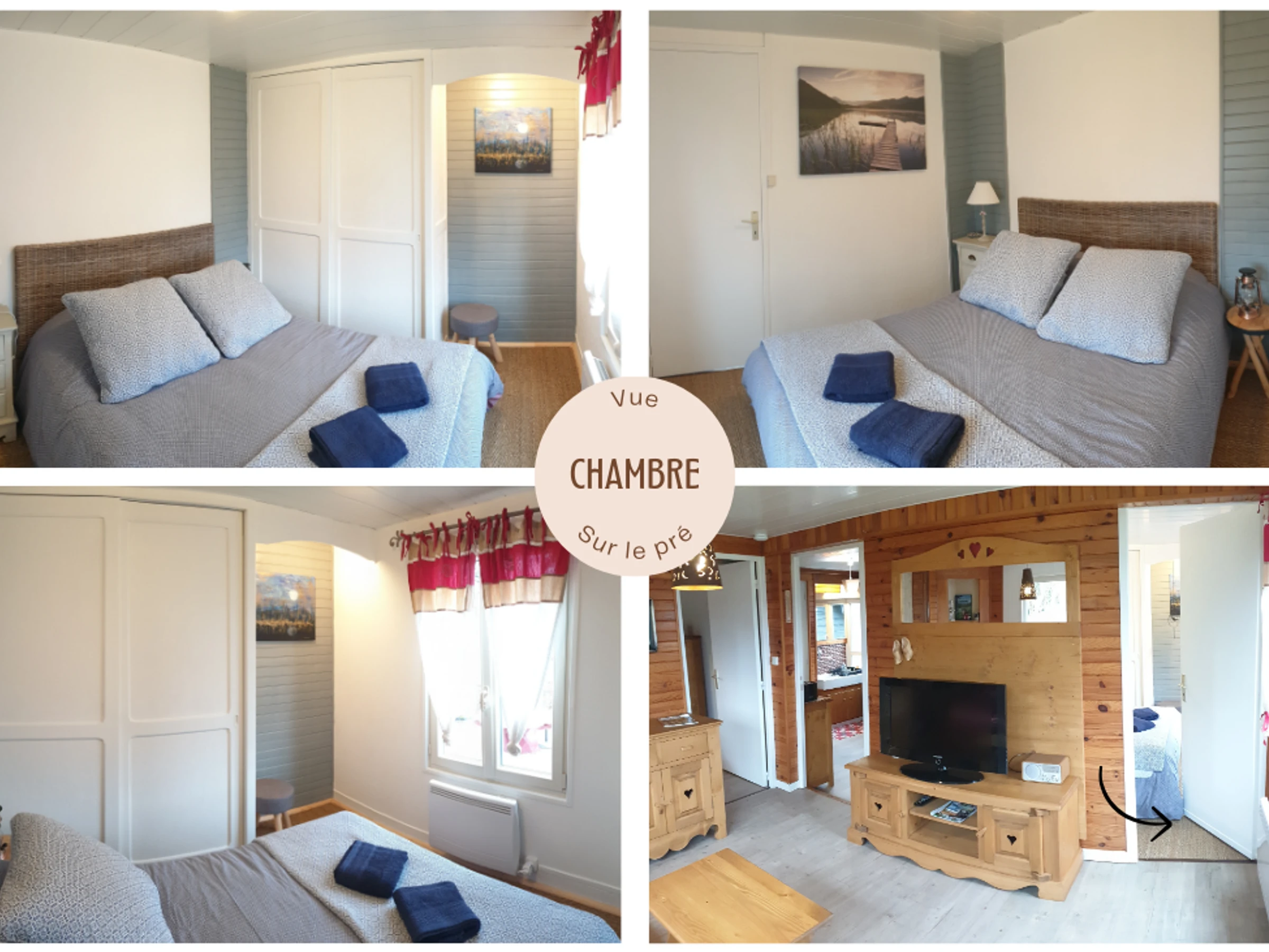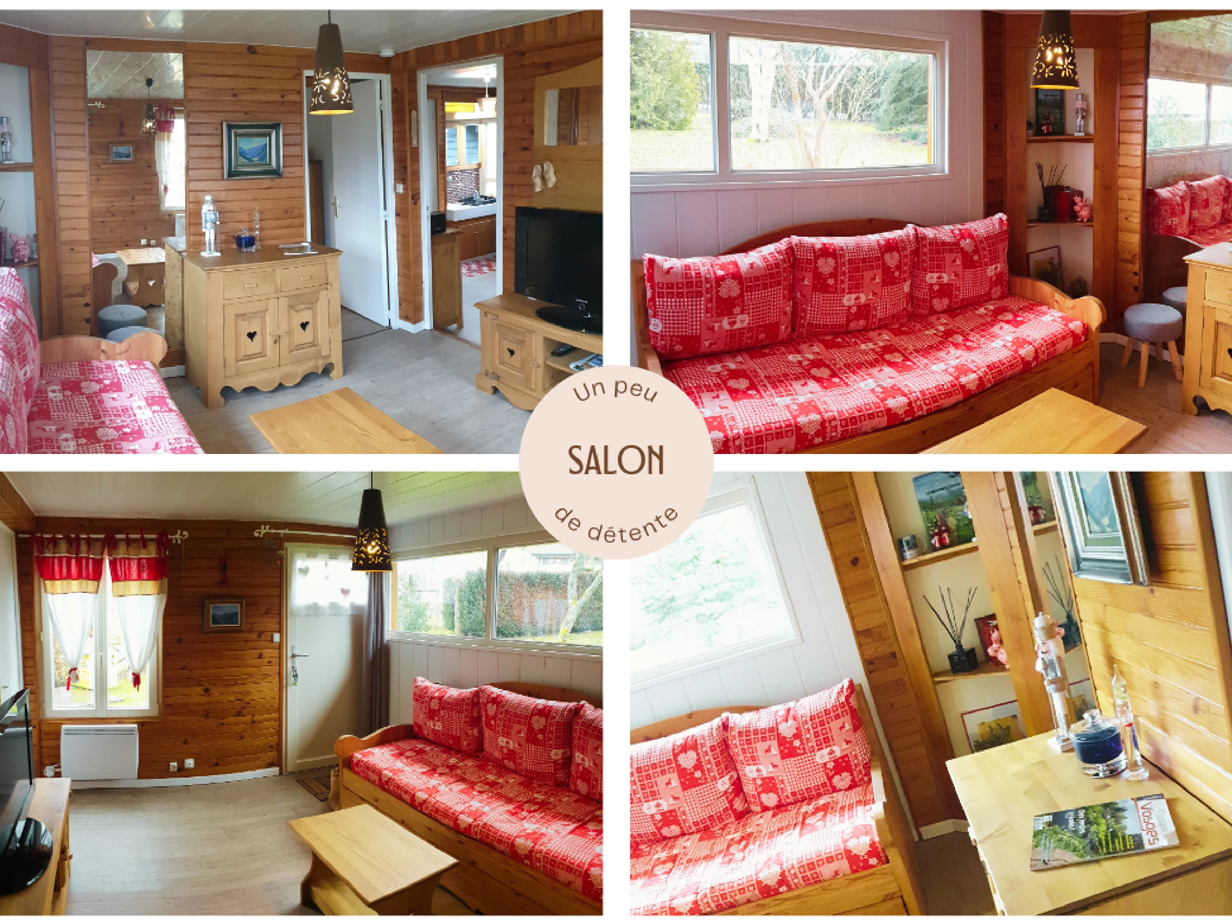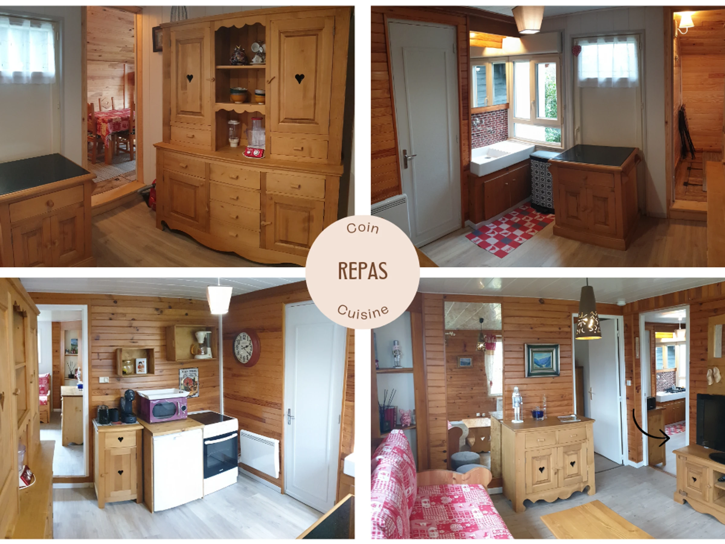 Intérieur : entrée sur le salon avec un canapé lit (160x200cm de deux matelas 80), télévision, connexion Wifi, chromecast. Une cuisine avec 4 feux vitrocéramiques, four, réfrigérateur, une petite salle d'eau avec douche, WC, sèche cheveux, une salle à manger avec table et 4 chaises donnant accès à l'extérieur. Ainsi que deux chambres avec chacune un lit 140x190cm.