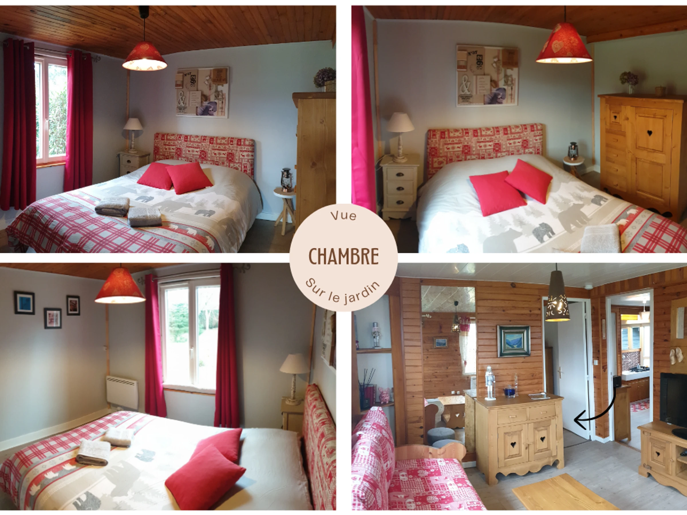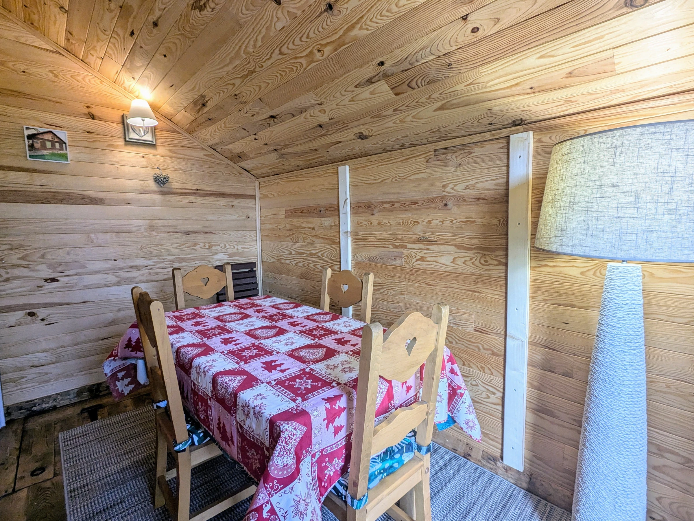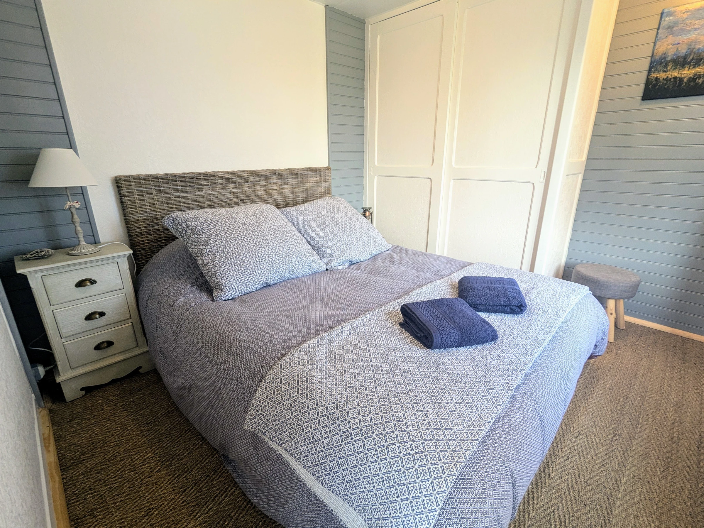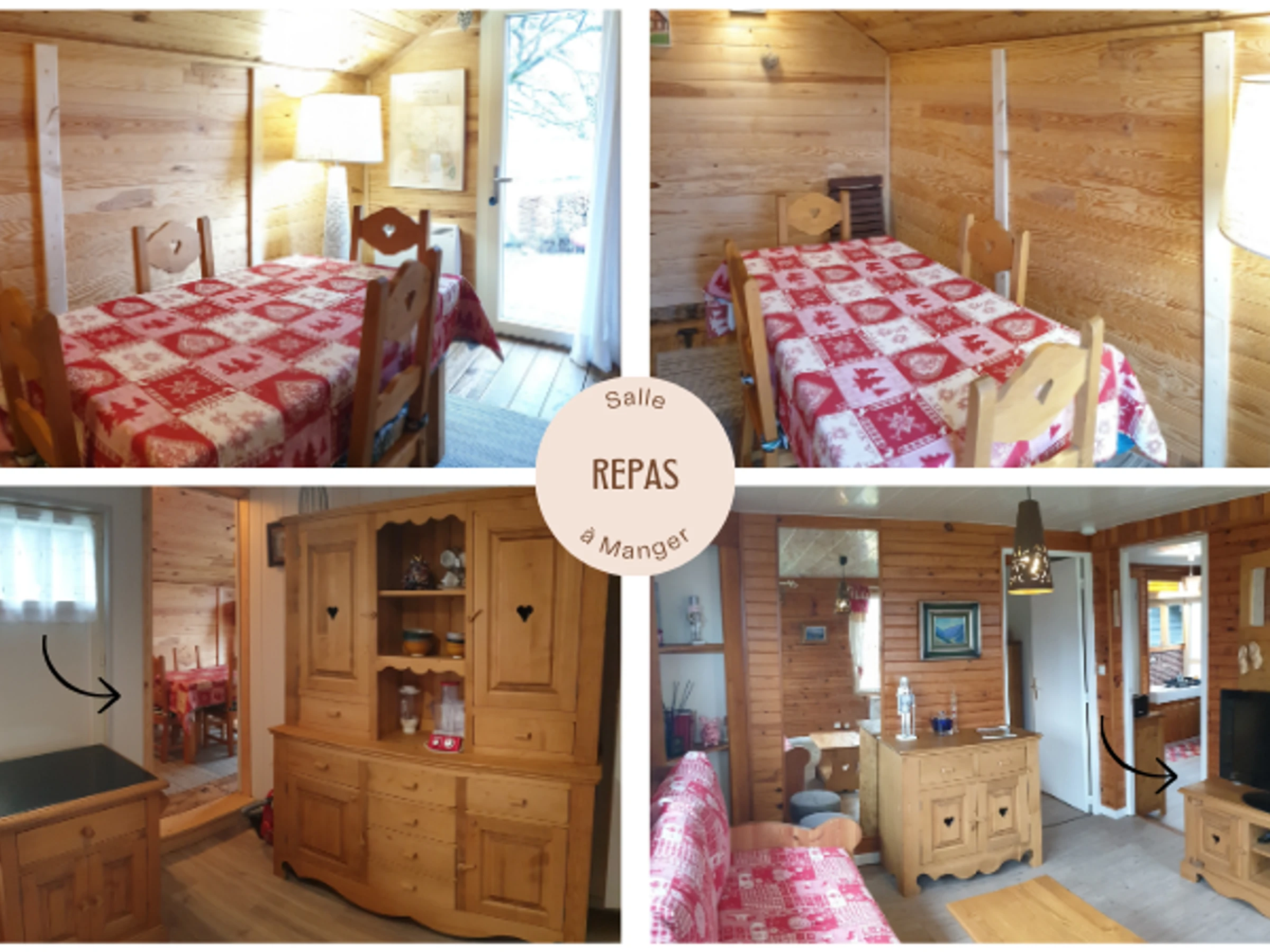 Intérieur : entrée sur le salon avec un canapé lit (160x200cm de deux matelas 80), télévision, connexion Wifi, chromecast. Une cuisine avec 4 feux vitrocéramiques, four, réfrigérateur, une petite salle d'eau avec douche, WC, sèche cheveux, une salle à manger avec table et 4 chaises donnant accès à l'extérieur. Ainsi que deux chambres avec chacune un lit 140x190cm.