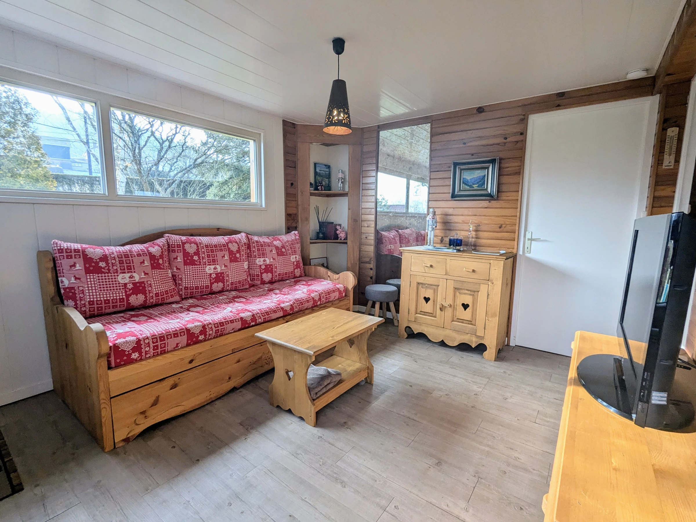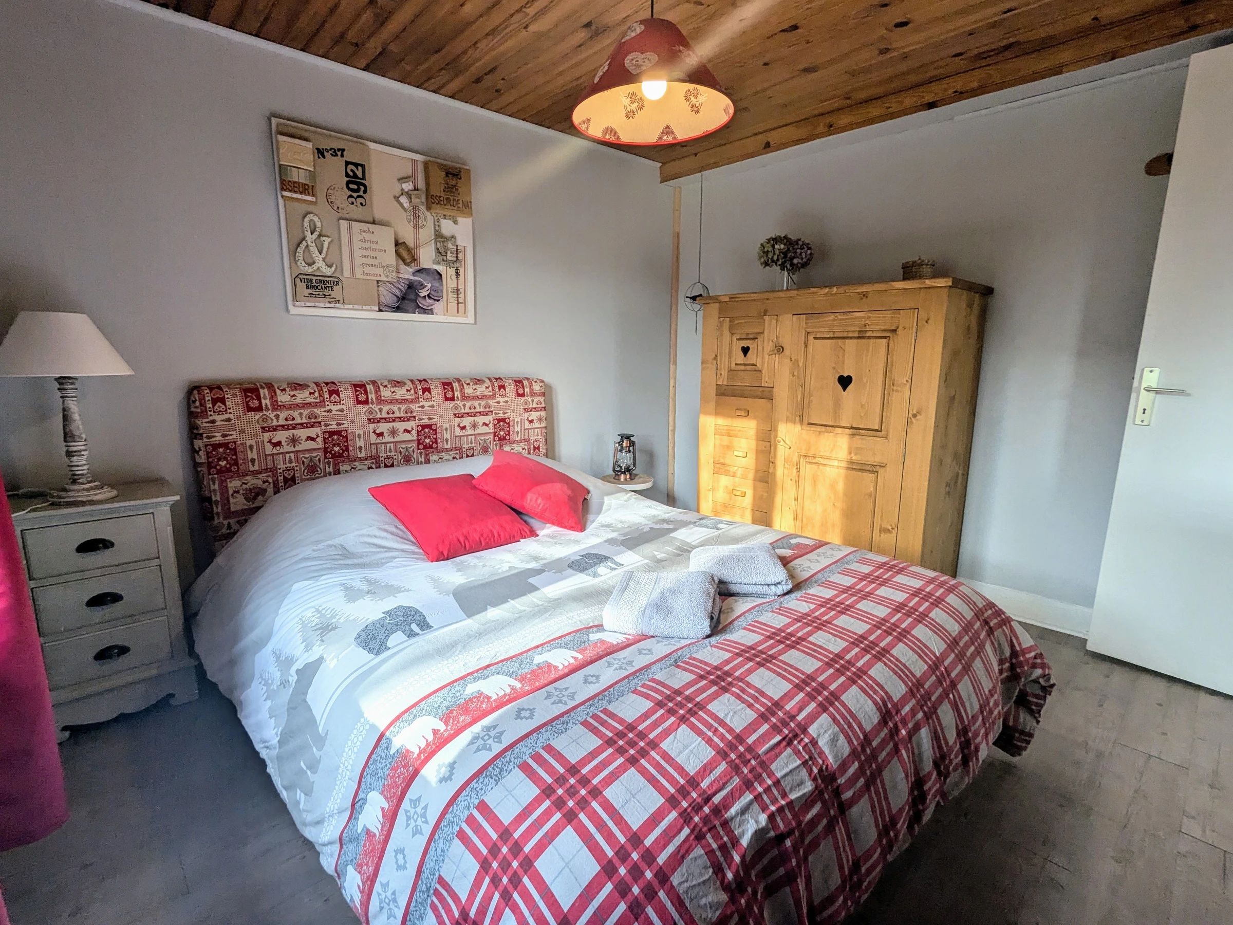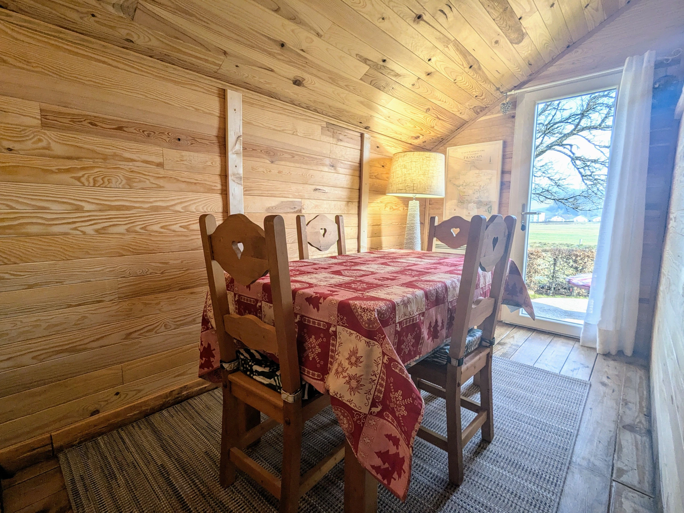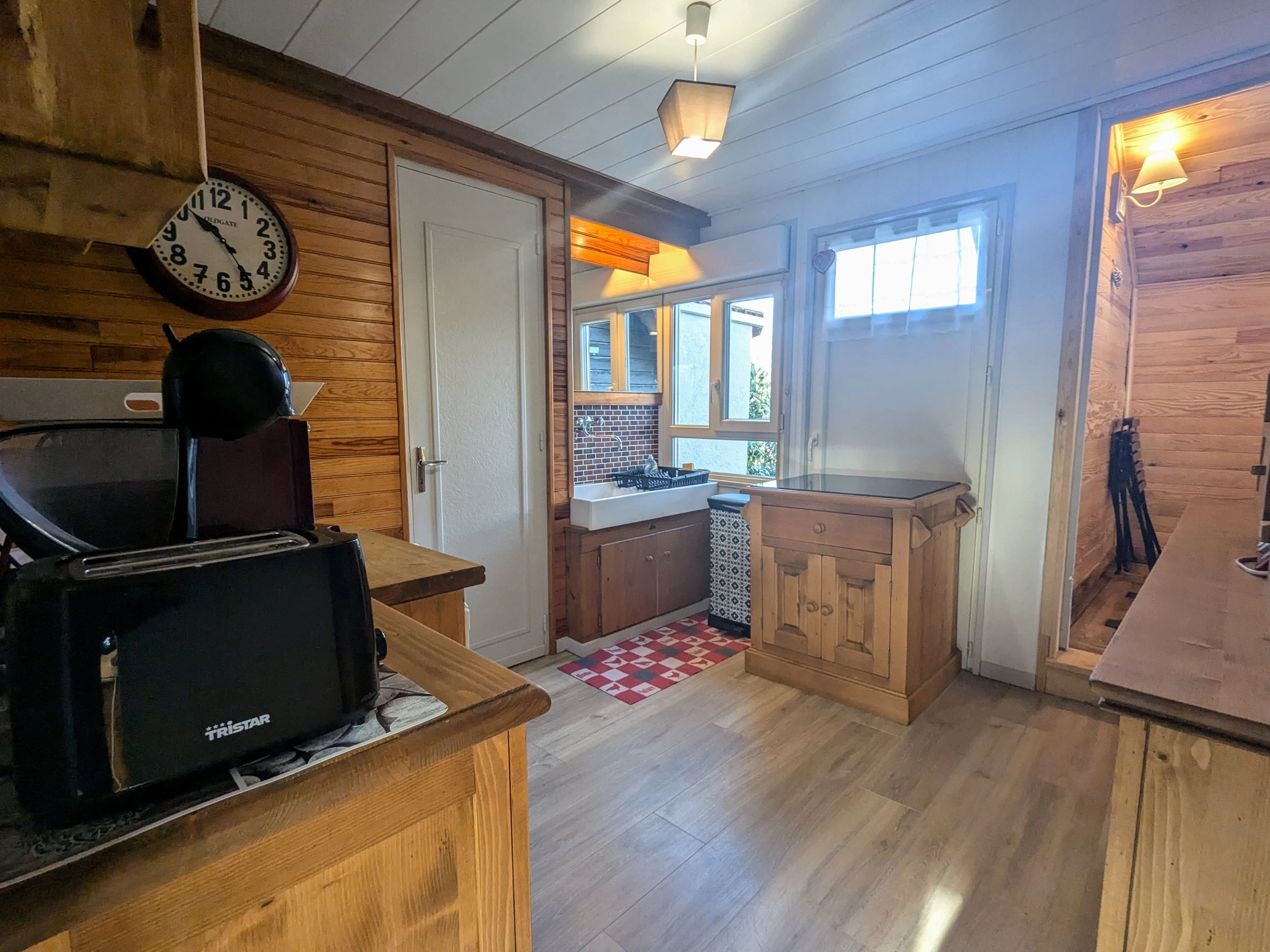 Intérieur : entrée sur le salon avec un canapé lit (160x200cm de deux matelas 80), télévision, connexion Wifi, chromecast. Une cuisine avec 4 feux vitrocéramiques, four, réfrigérateur, une petite salle d'eau avec douche, WC, sèche cheveux, une salle à manger avec table et 4 chaises donnant accès à l'extérieur. Ainsi que deux chambres avec chacune un lit 140x190cm.