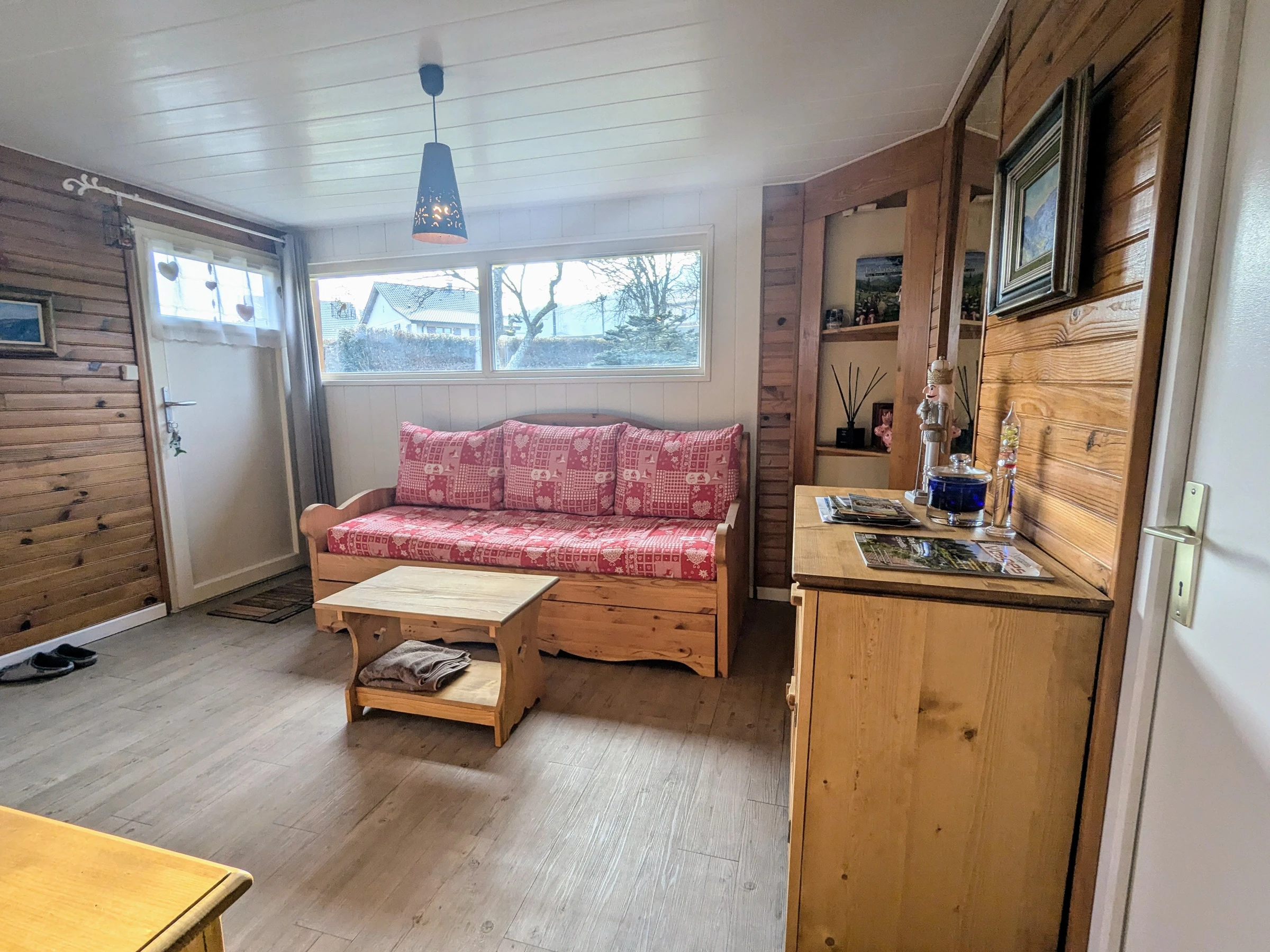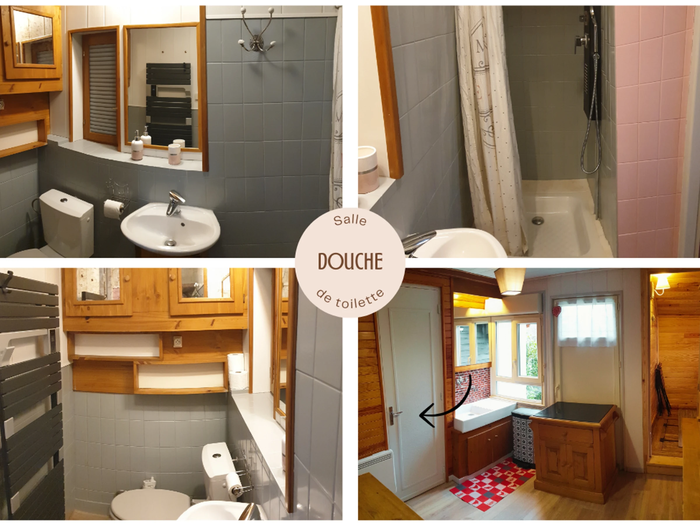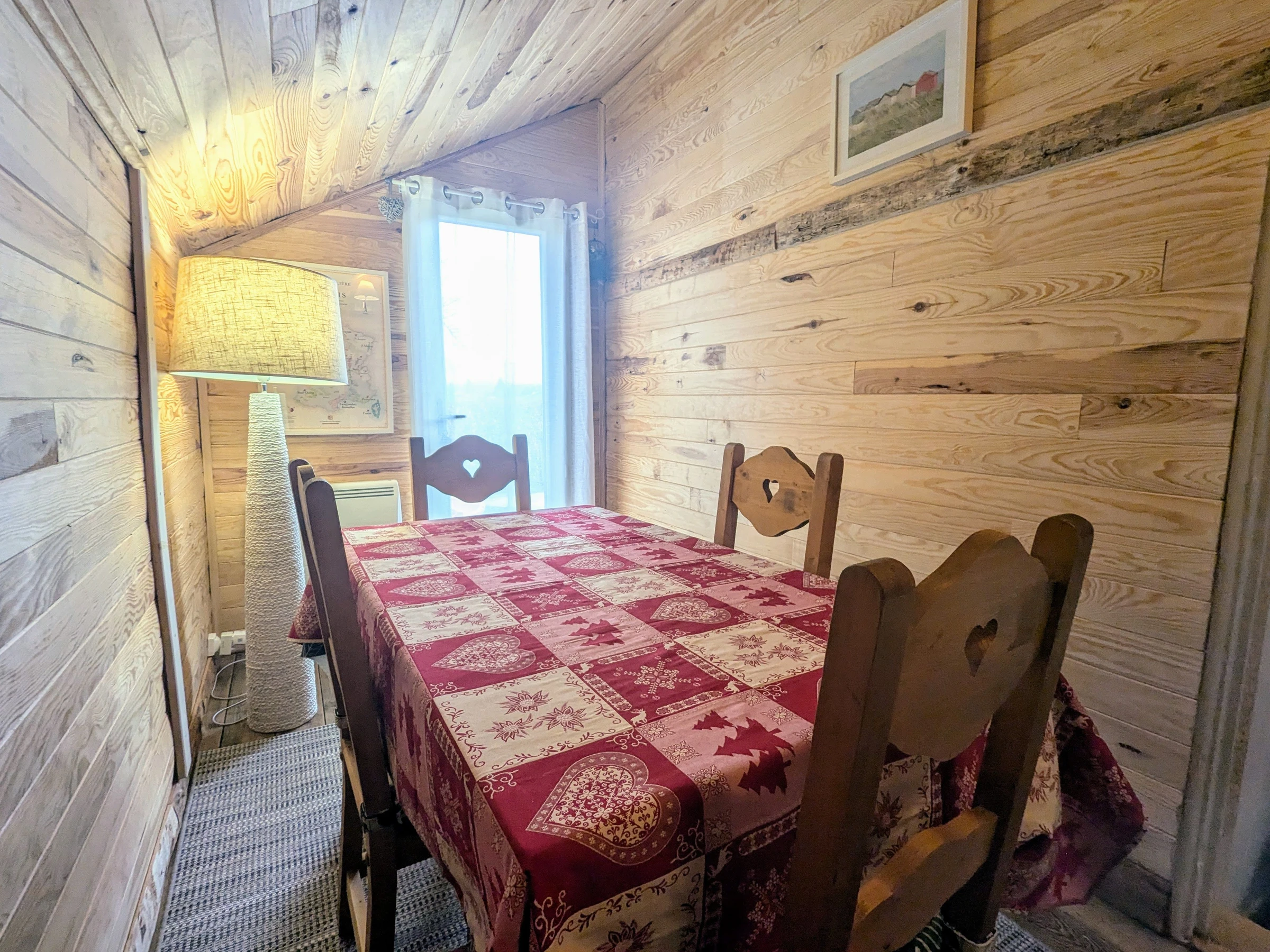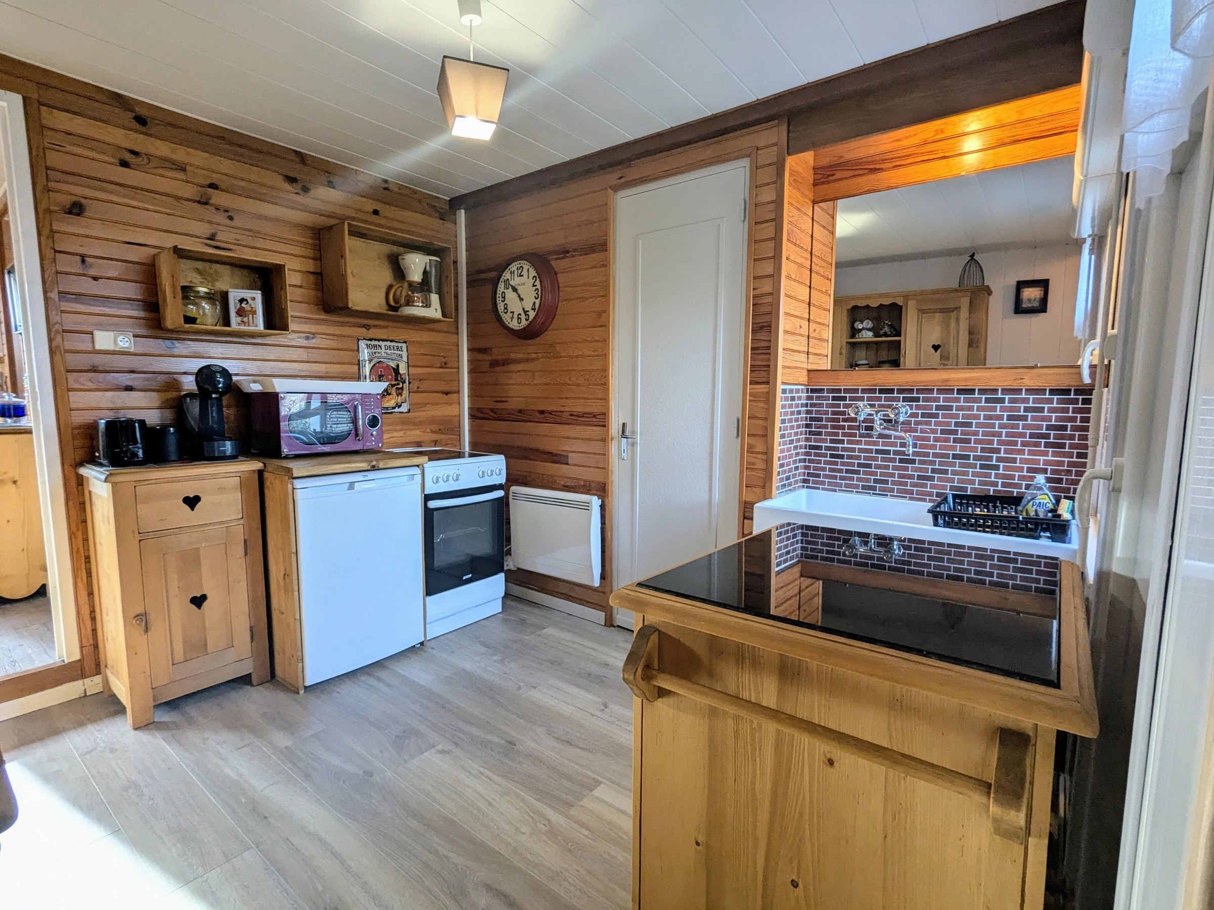Intérieur : entrée sur le salon avec un canapé lit (160x200cm de deux matelas 80), télévision, connexion Wifi, chromecast. Une cuisine avec 4 feux vitrocéramiques, four, réfrigérateur, une petite salle d'eau avec douche, WC, sèche cheveux, une salle à manger avec table et 4 chaises donnant accès à l'extérieur. Ainsi que deux chambres avec chacune un lit 140x190cm.