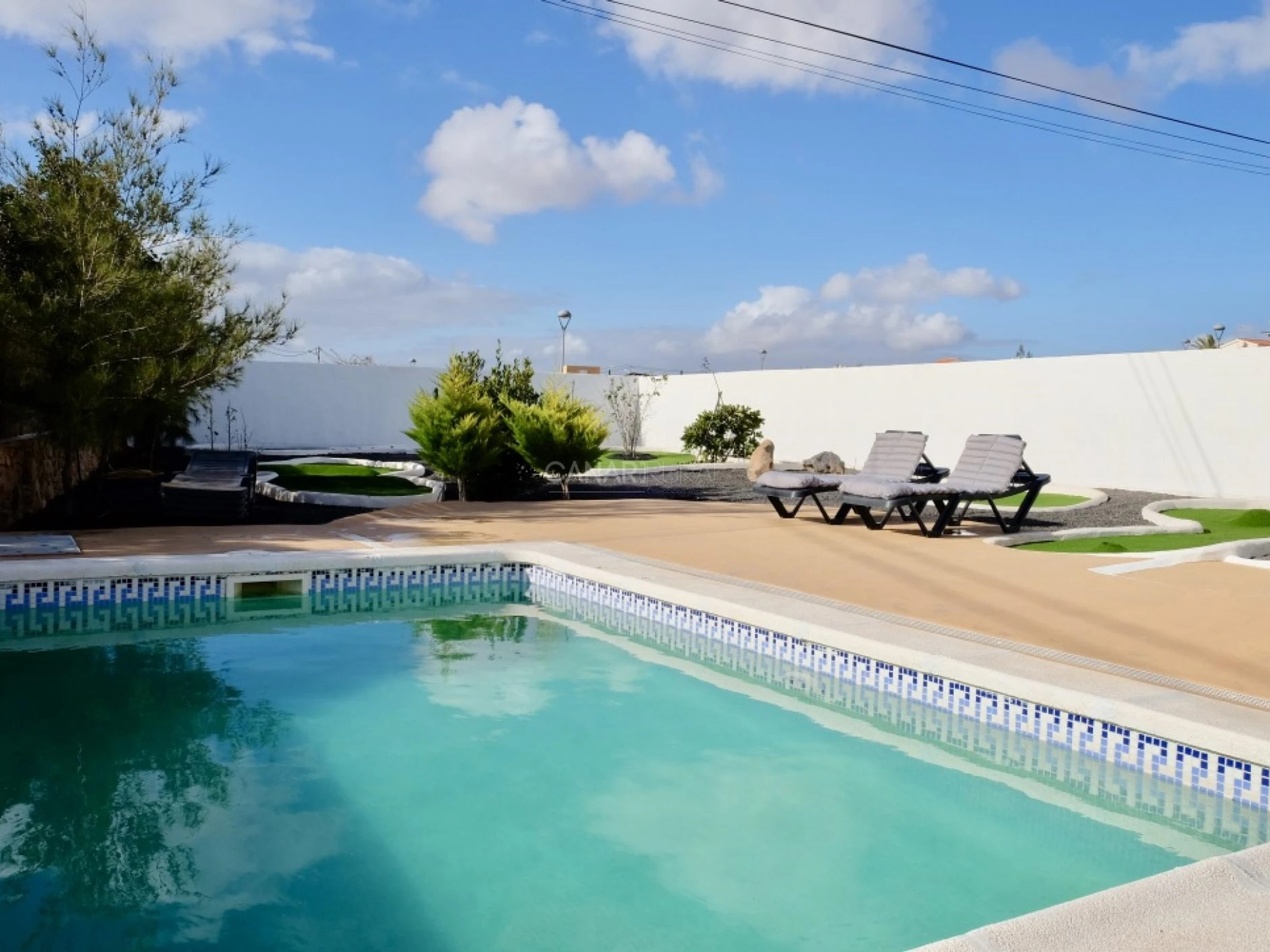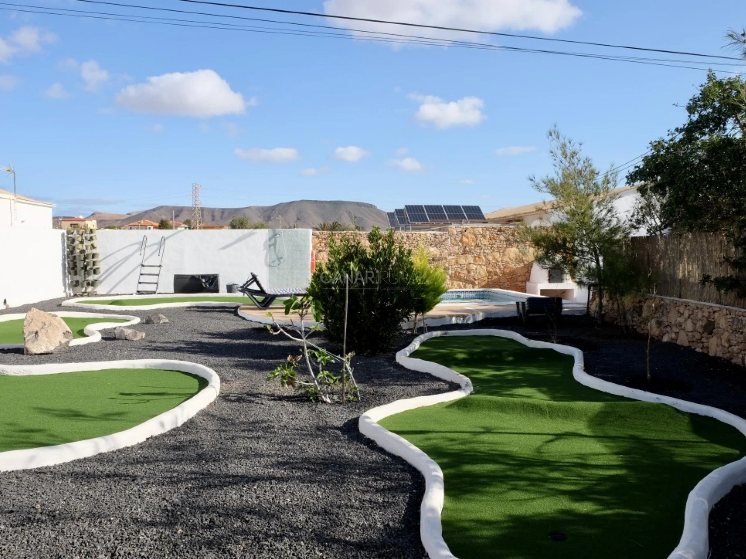 Le salon est prolongé par une terrasse couverte où est projeté un immense jardin avec piscine privée, solarium, mini-golf et zone de barbecue avec le typique four à bois de Fuerteventura.