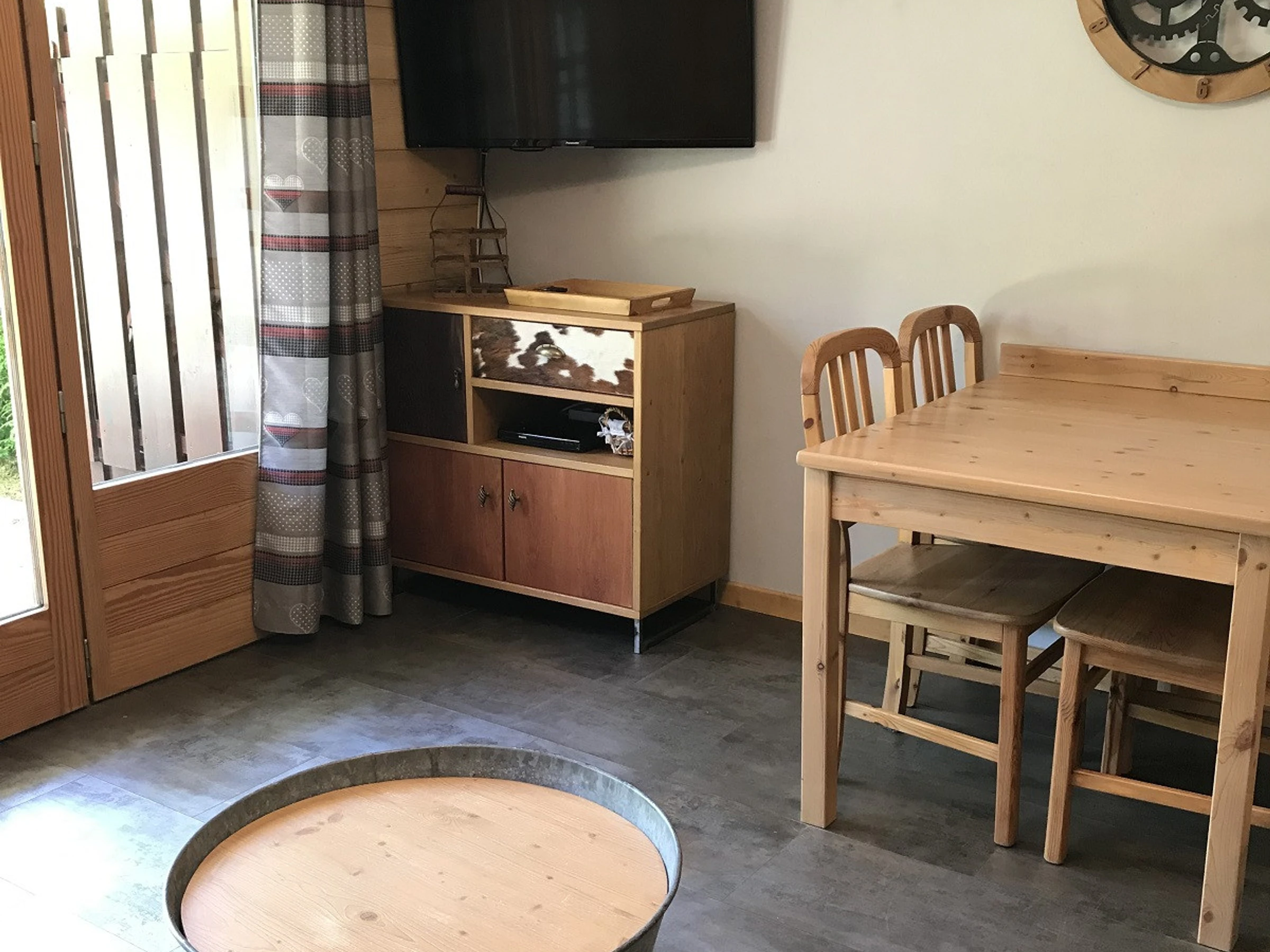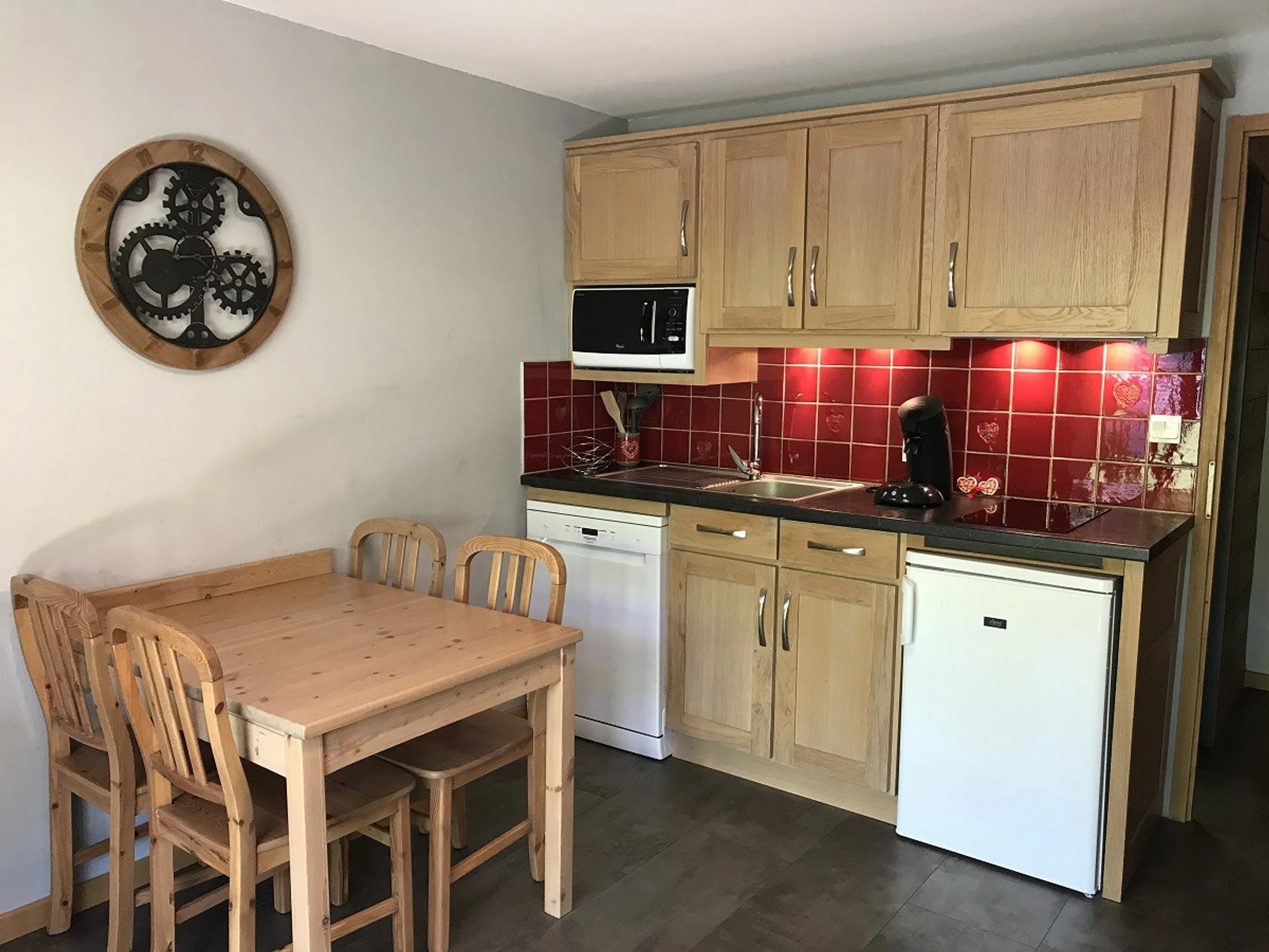 Cuisine équipée ouverte sur séjour, Cafetière à filtre, Cafetière SENSEO, Lave-vaisselle, Appareil à fondue, Petit réfrigérateur avec partie congélation, 2 Plaques induction, Bouilloire électrique, Combiné four/micro-ondes, Appareil à raclette, Grille-pain