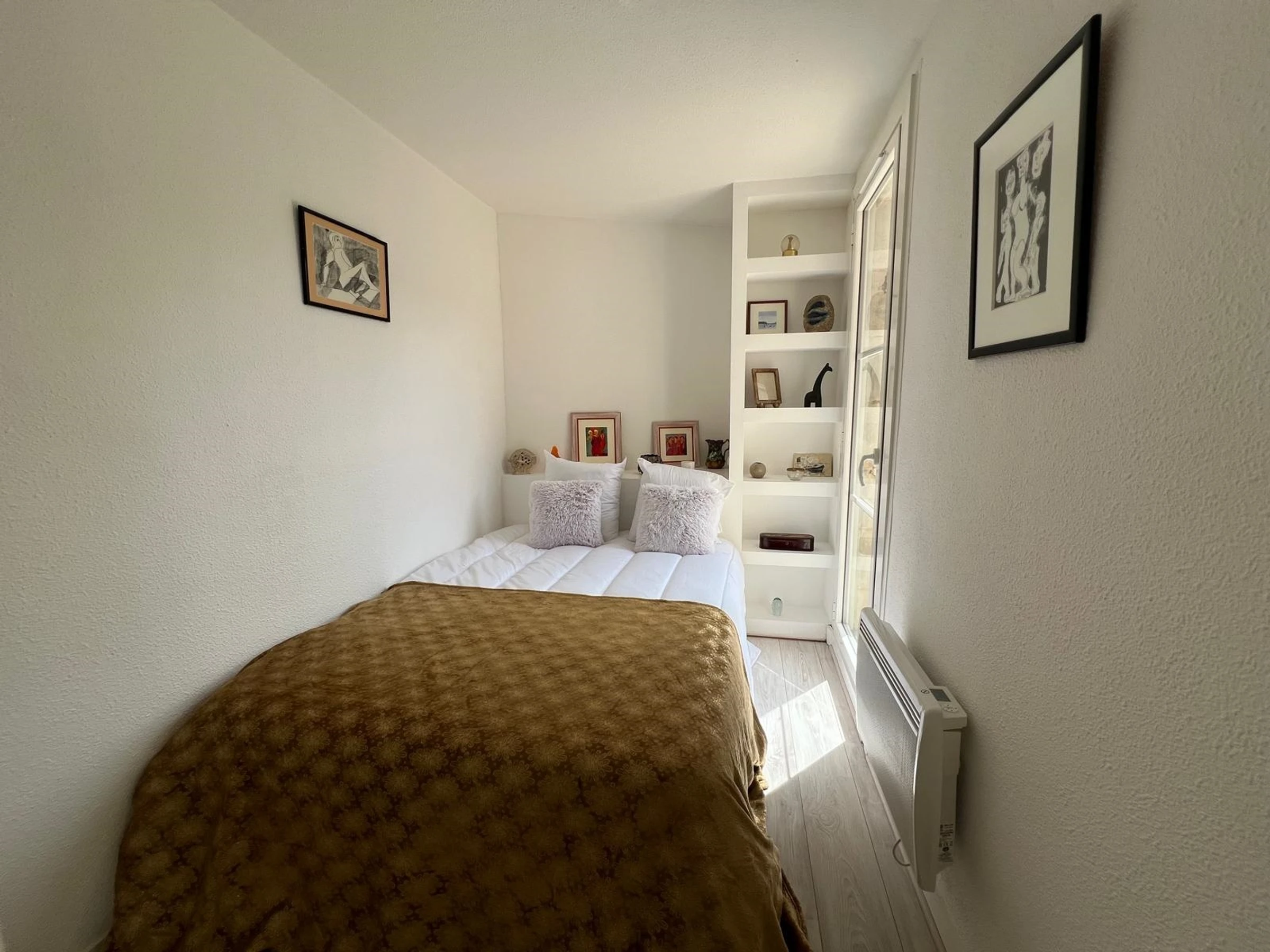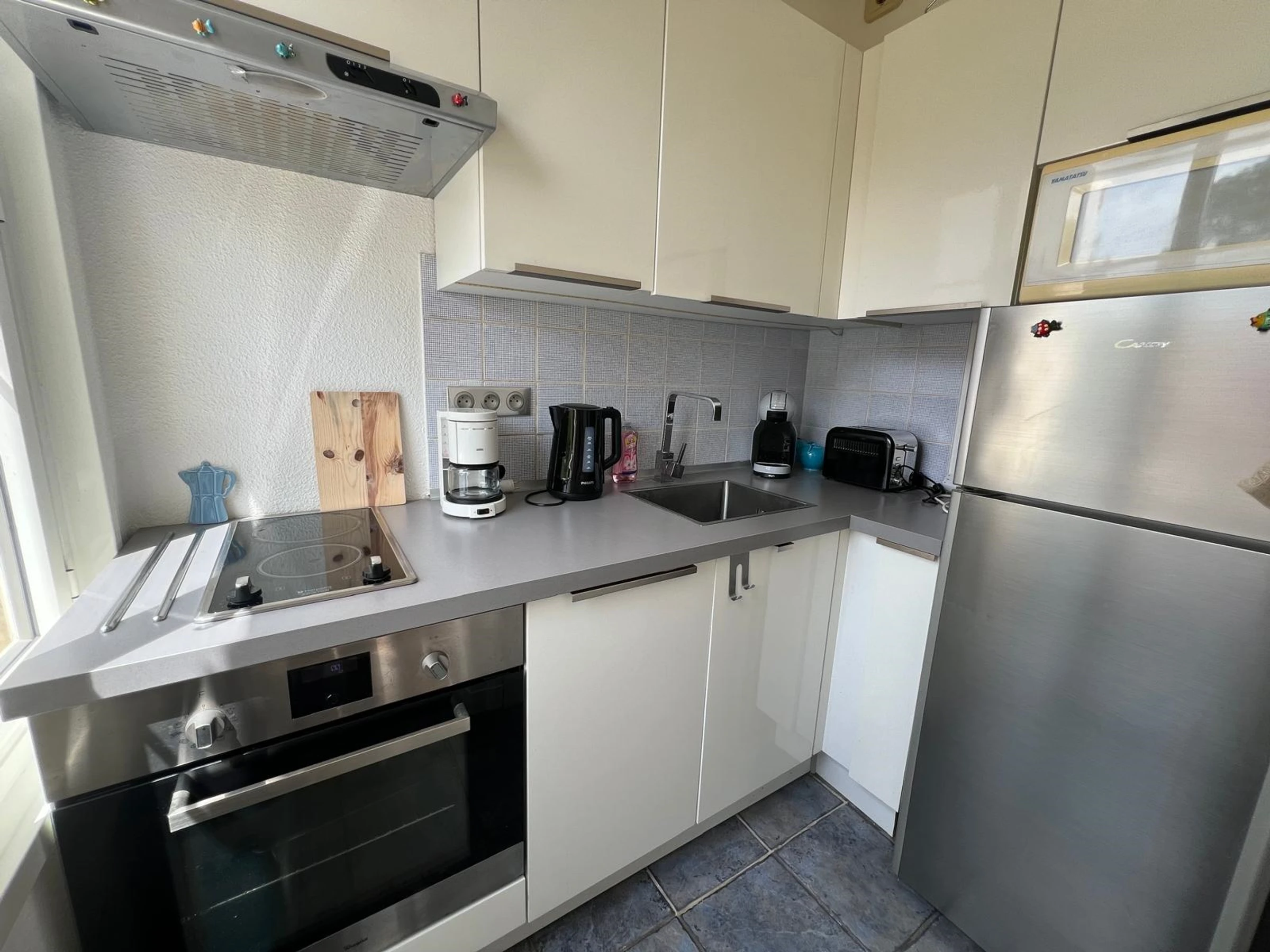 Profitez d’un séjour lumineux et climatisé, avec un canapé convertible confortable (160 cm), une table pour 4 personnes et une TV pour vos moments détente.