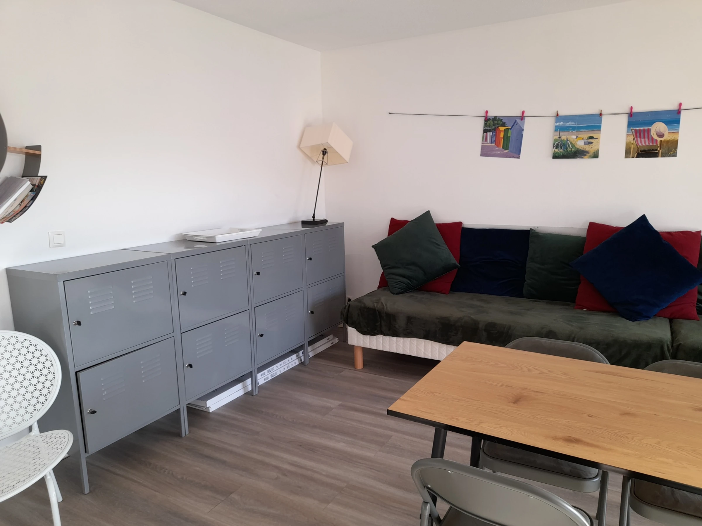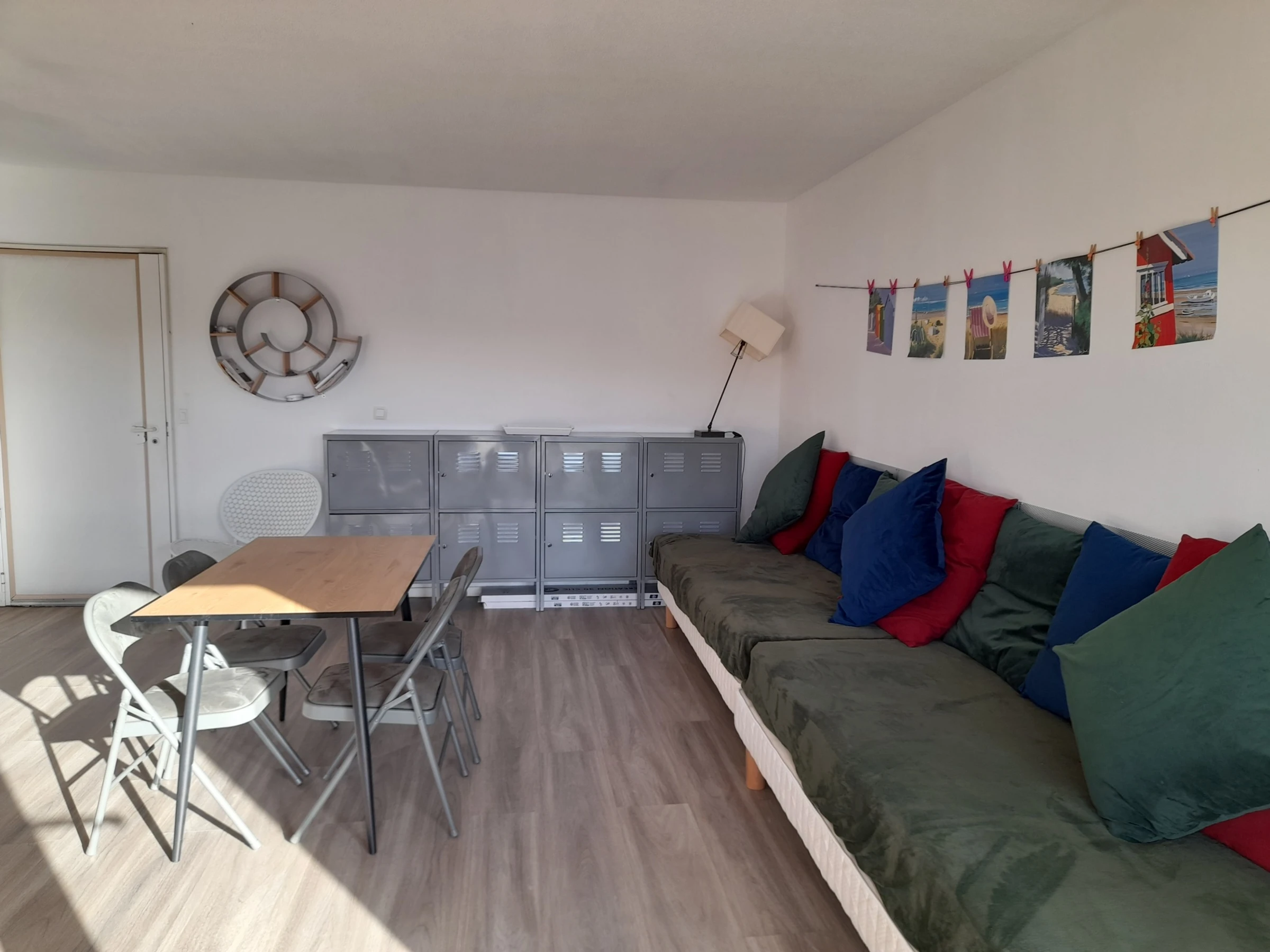 Sa pièce à vivre avec deux petits canapés/lits en 90, TV et WIFI, donnant sur un balcon exposé Sud, pour profiter des repas en extérieur, avec une vue dégagée.
