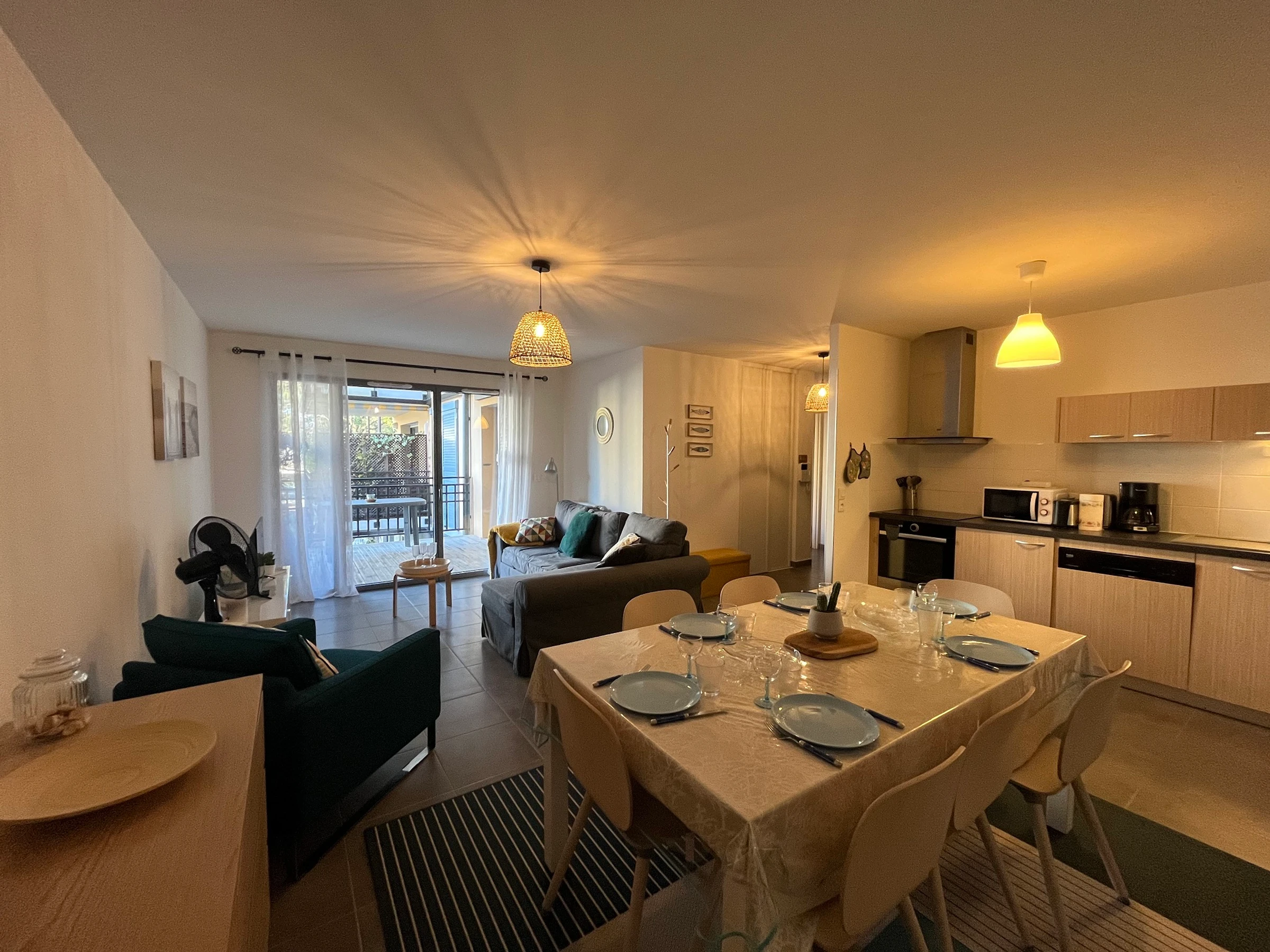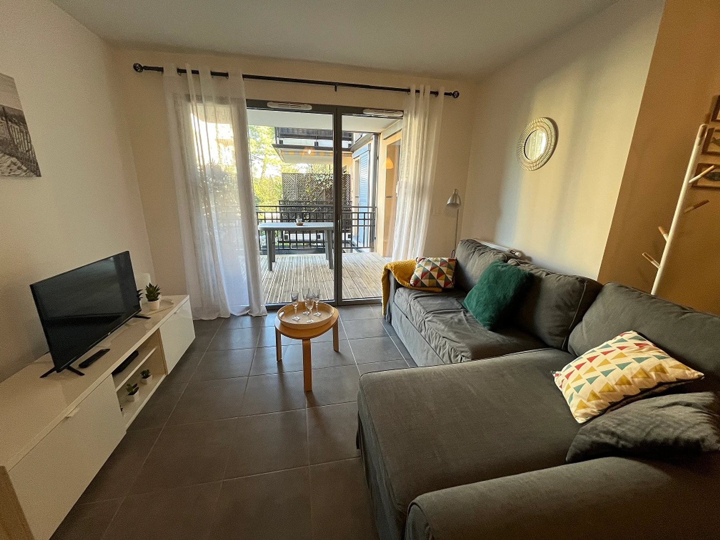 - Séjour double avec canapé, TV, donnant sur une terrasse avec Mobilier avec aperçu bassin.