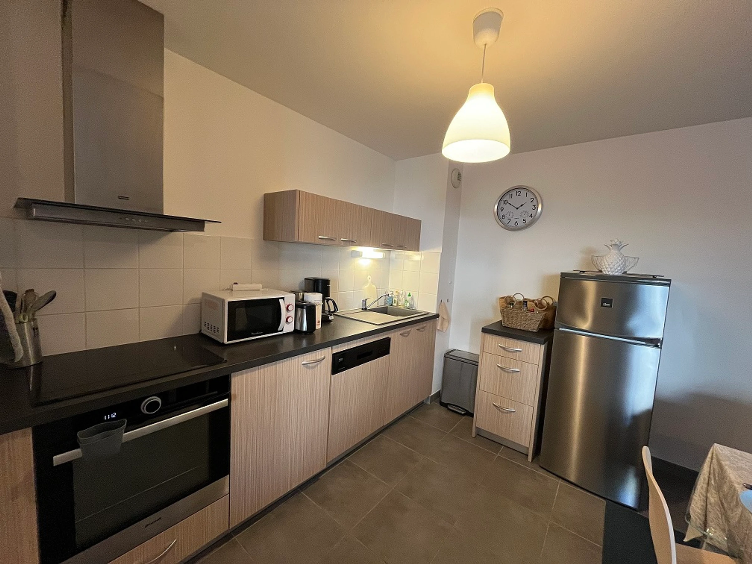 -Cuisine ouverte : plaques vitrocéramiques, four, réfrigérateur-congélateur, lave-vaisselle, lave-linge.