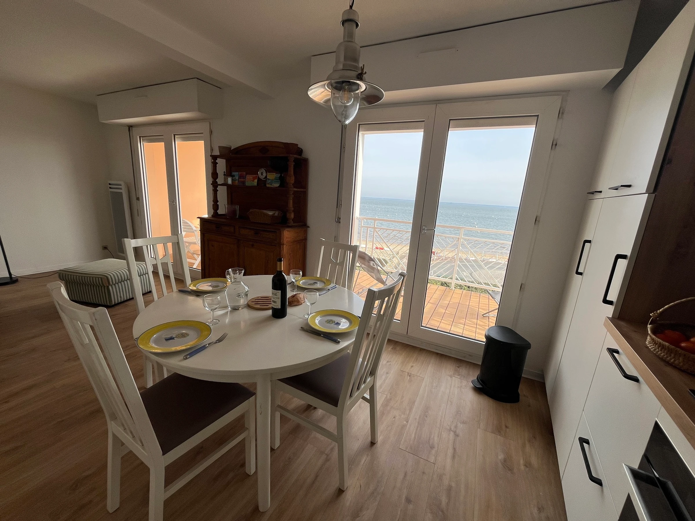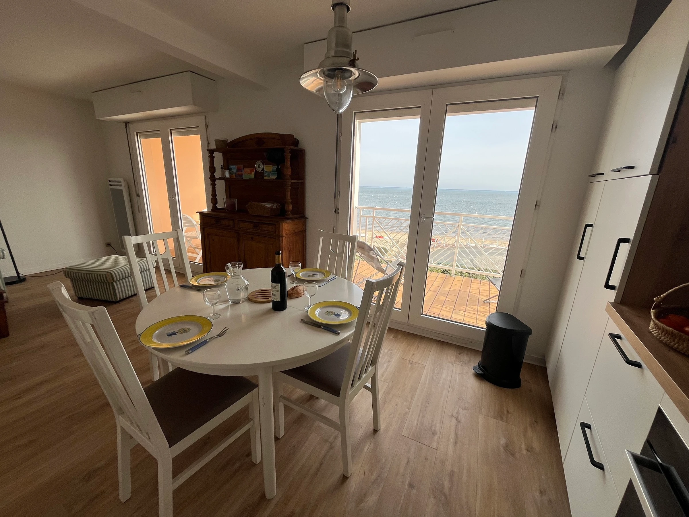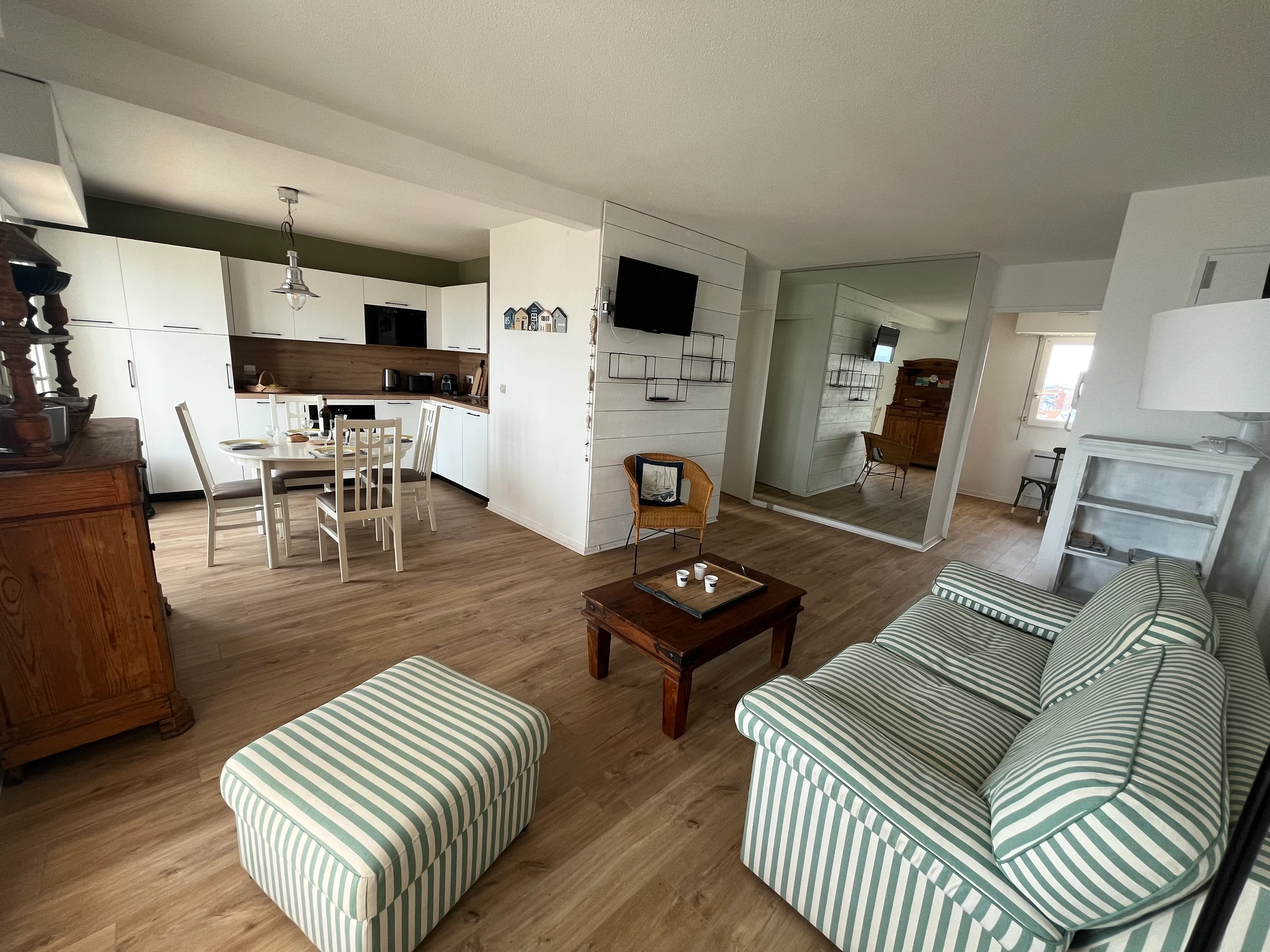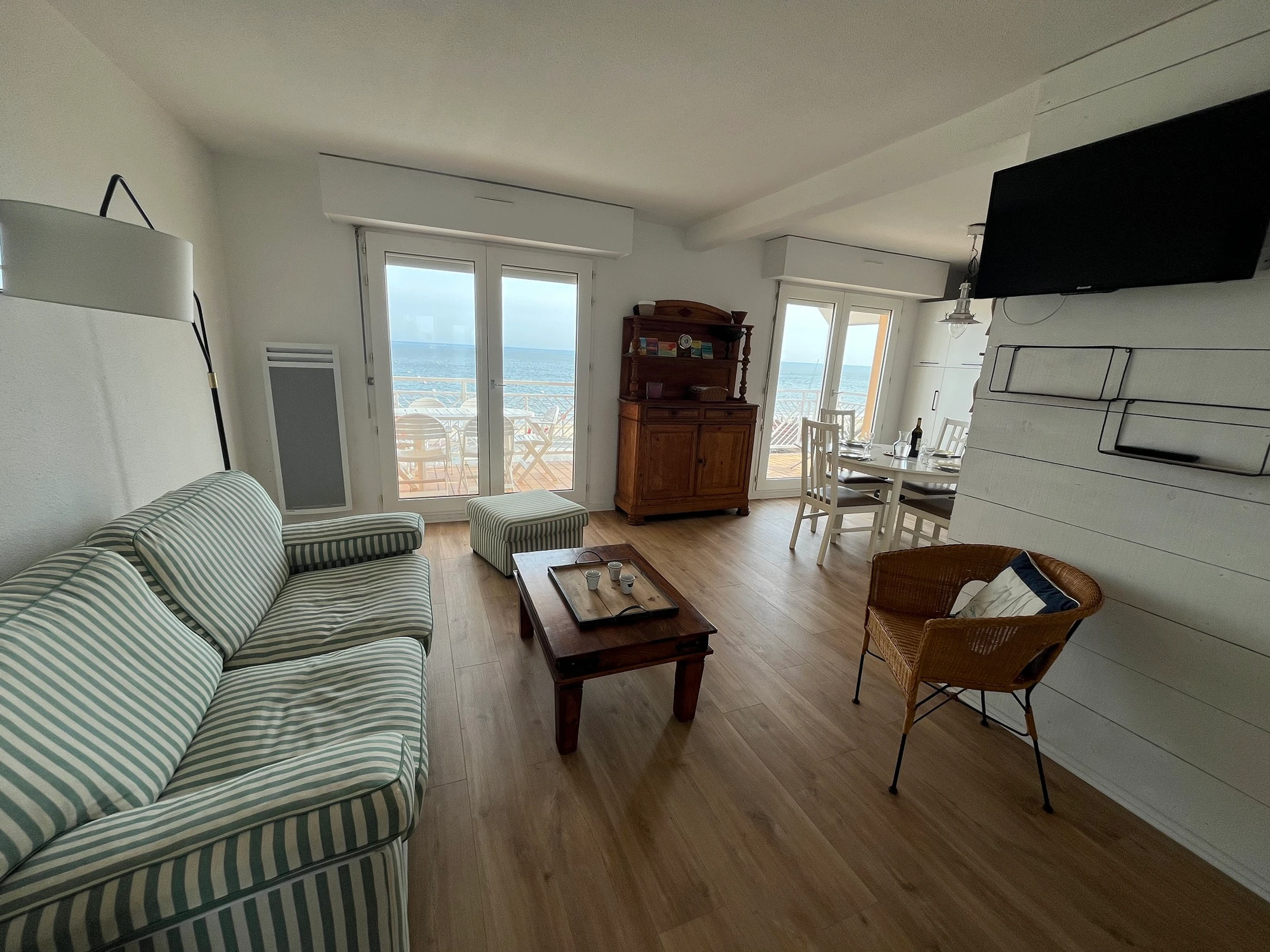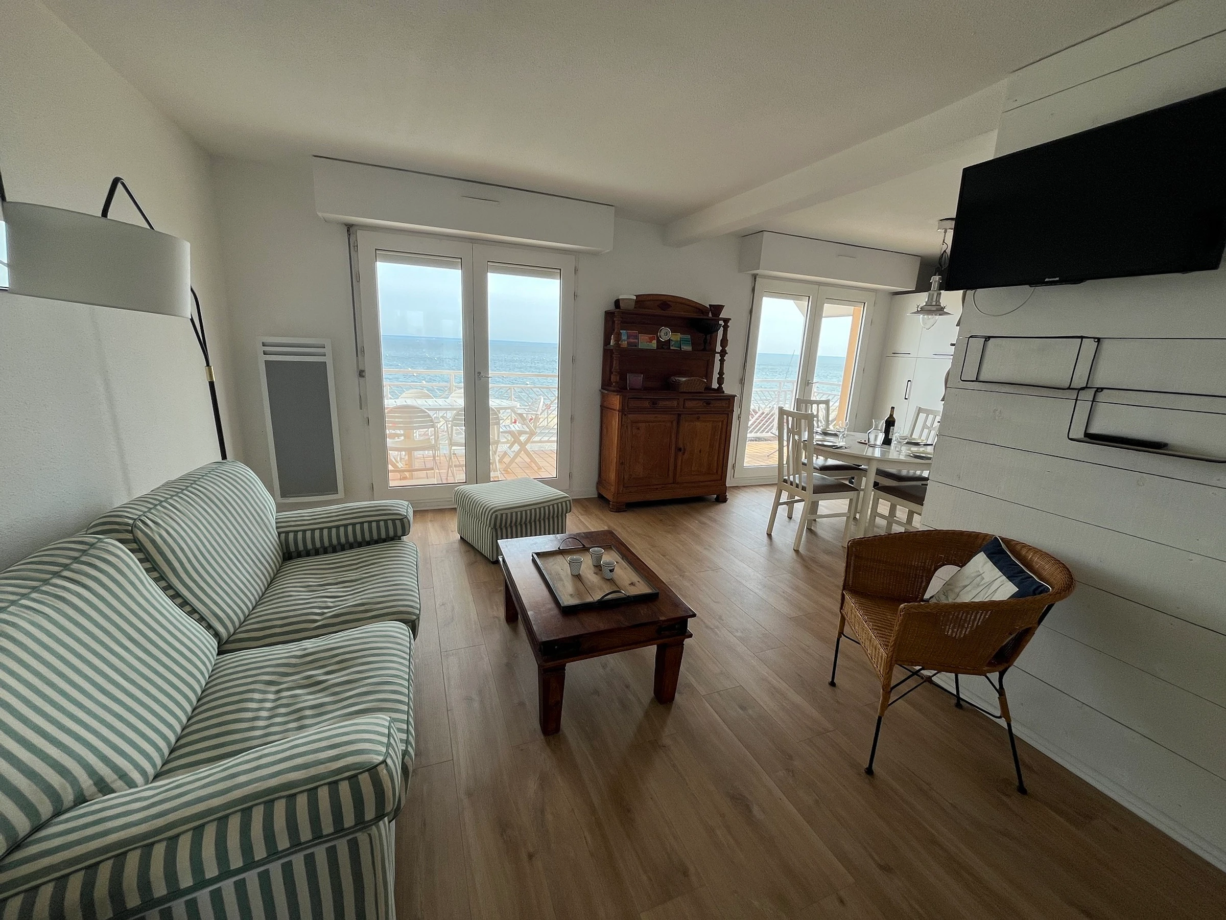 - Séjour avec canapé, TV, donnant sur terrasse avec Mobilier et magnifique vue mer.