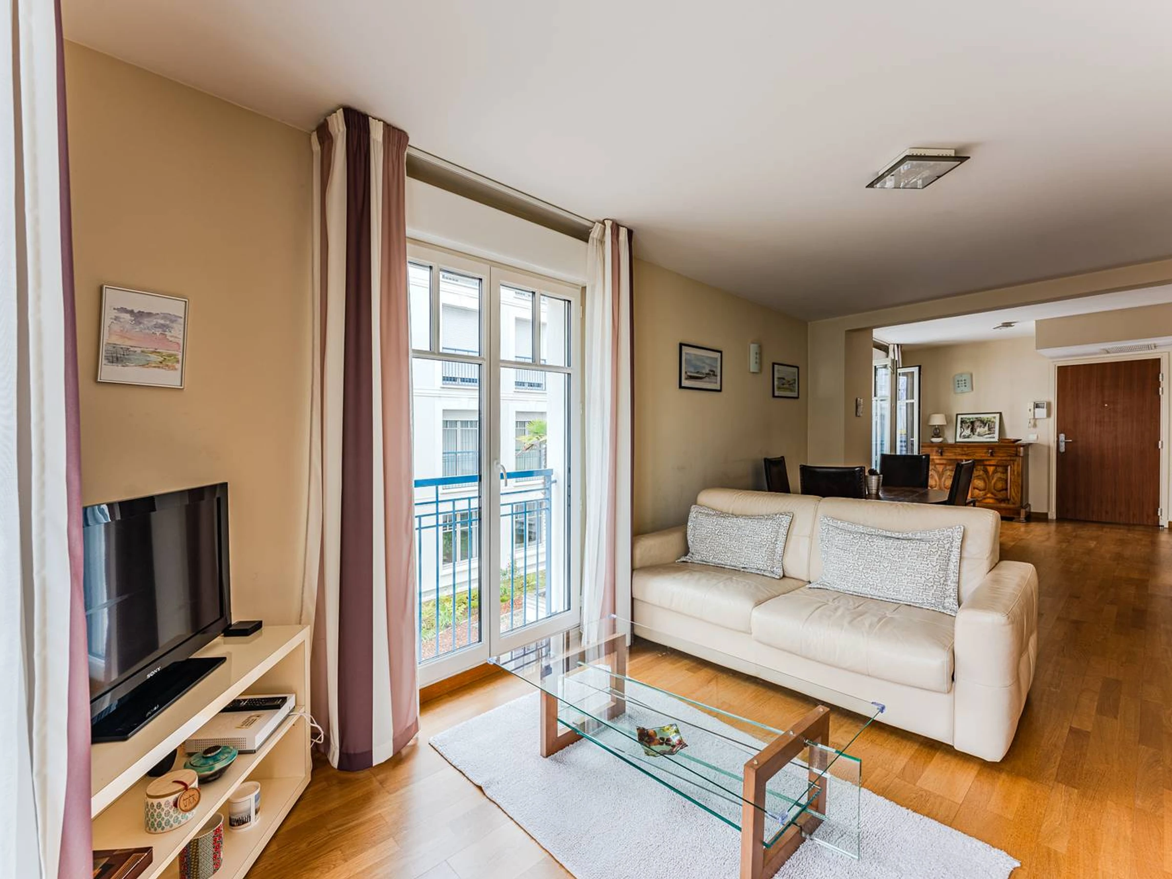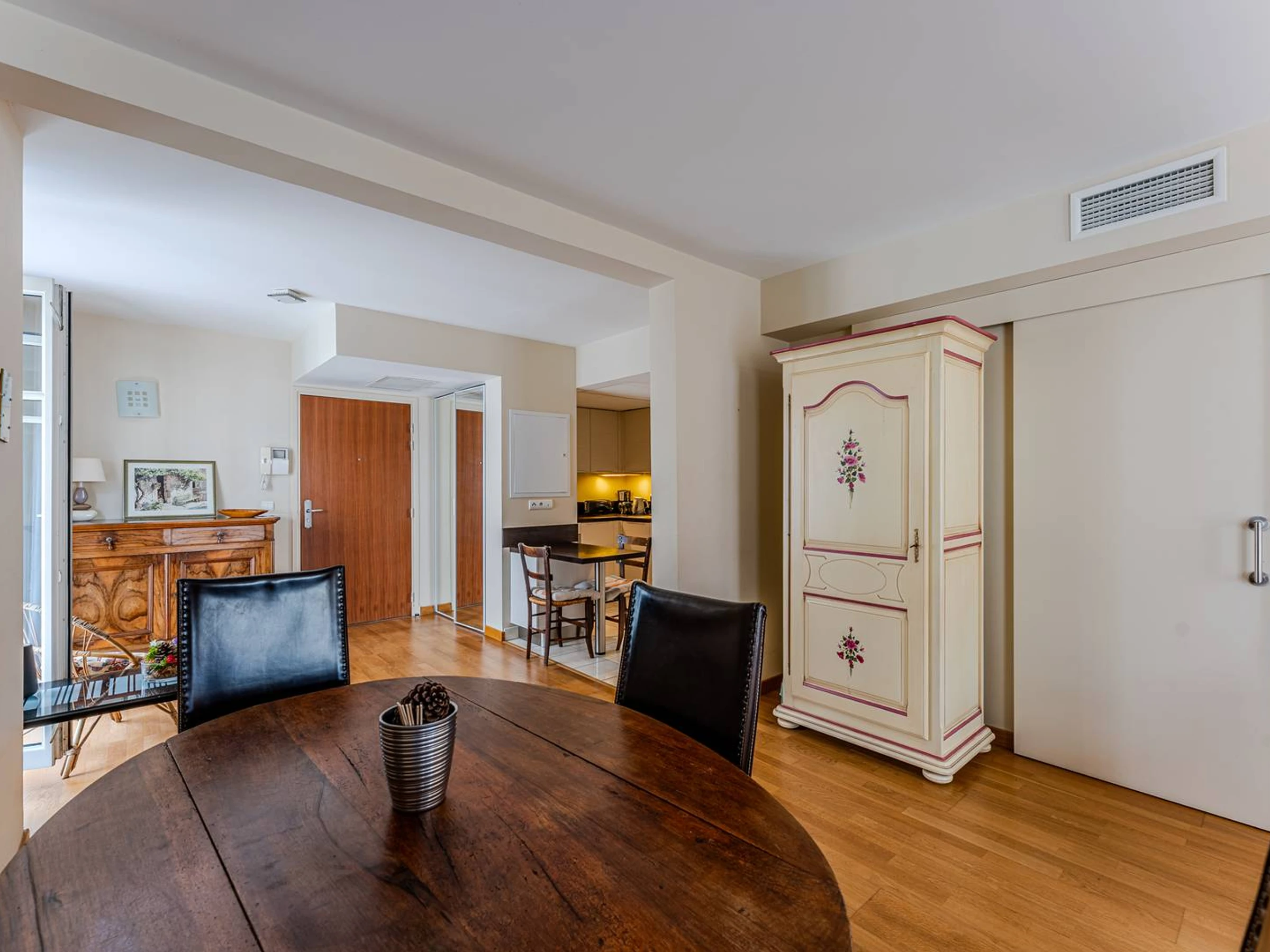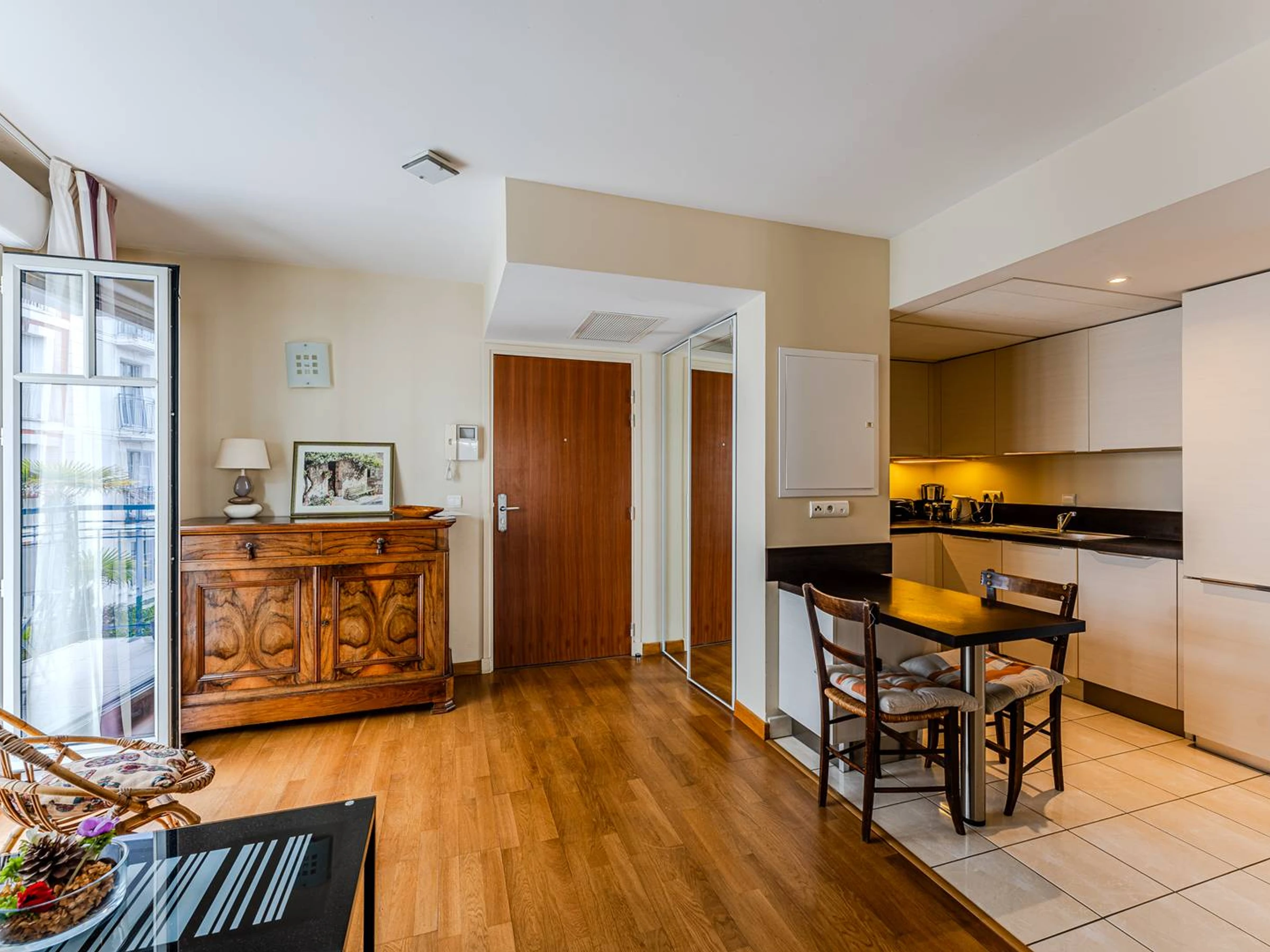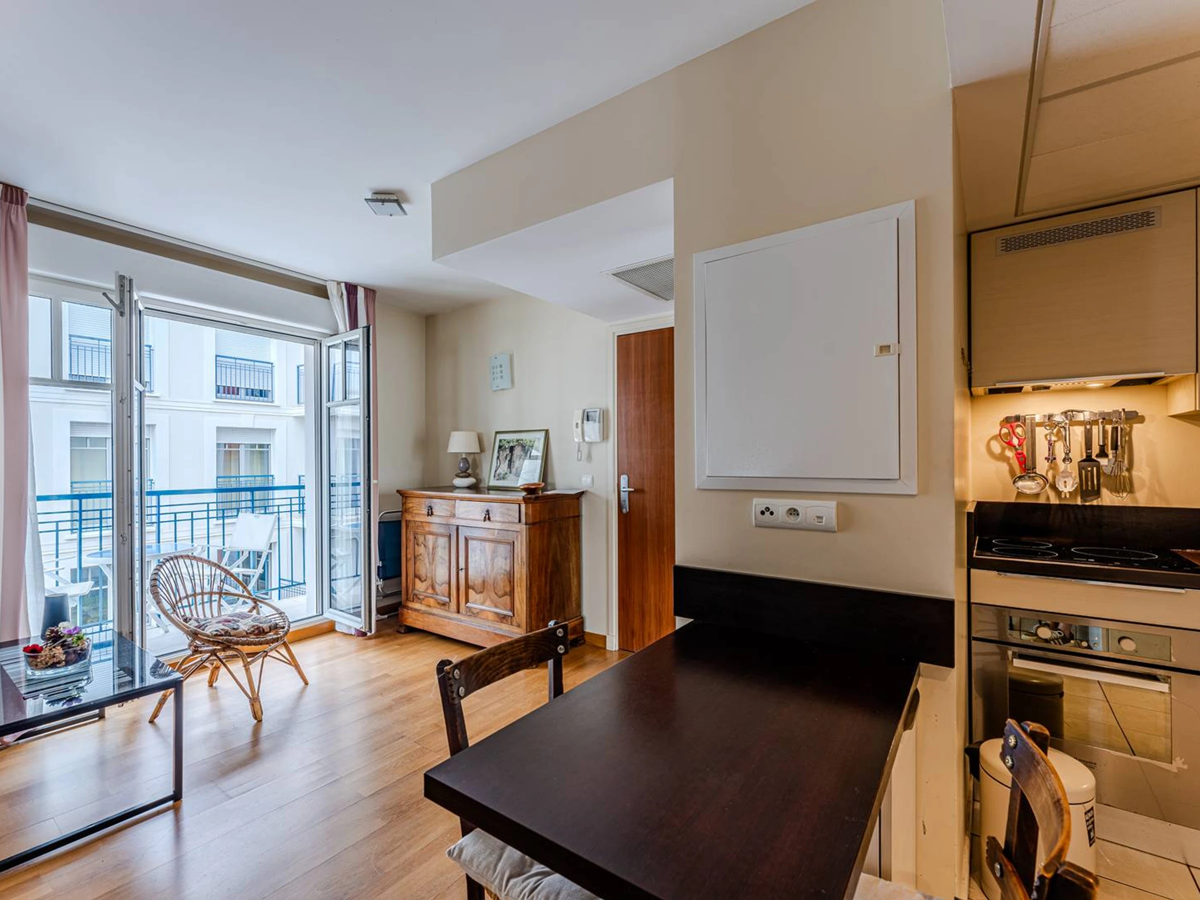 Il se compose d’une spacieuse entrée avec placard (abritant le lave-linge) donnant accès au balcon principal exposé Est avec mobilier, d’une cuisine ouverte parfaitement équipée (réfrigérateur avec compartiment congélateur, four traditionnel, micro-ondes, lave-vaisselle, plaque induction 3 feux, hotte), d’un espace salle à manger et d’un salon lumineux exposé Sud et Est, avec canapé convertible en 160, télévision et accès au 2nd balcon de type "balcon parisien". Le coin nuit comprend un dégagement desservant des WC indépendants, une salle d’eau moderne avec douche à l’italienne, ainsi qu’une chambre exposée Sud, équipée d’un lit double motorisé en 140, d’un grand placard/penderie, et bénéficiant également d’un accès au second balcon.