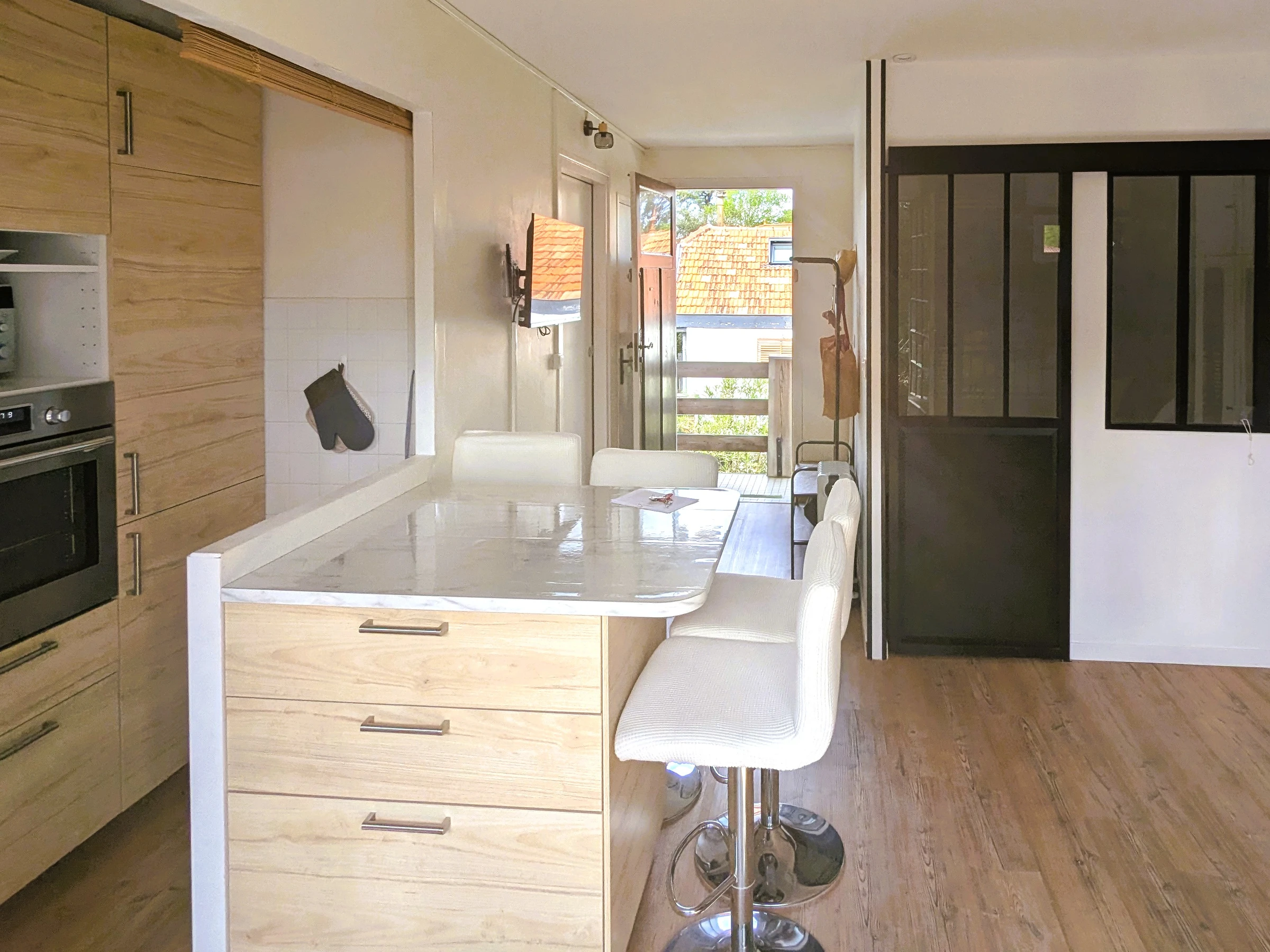 -Kitchenette aménagée et équipée ( lave-vaisselle, four, frigo congélateur, cafetière à capsules, machine à laver/sèche-linge..) avec un îlot et 4 chaises de bar