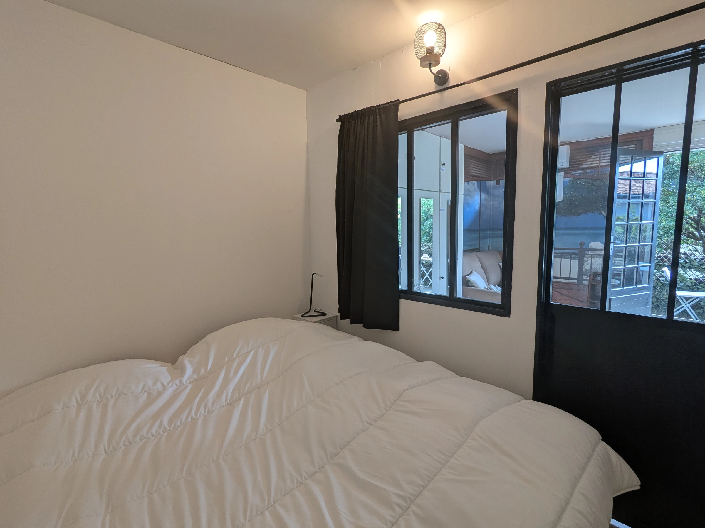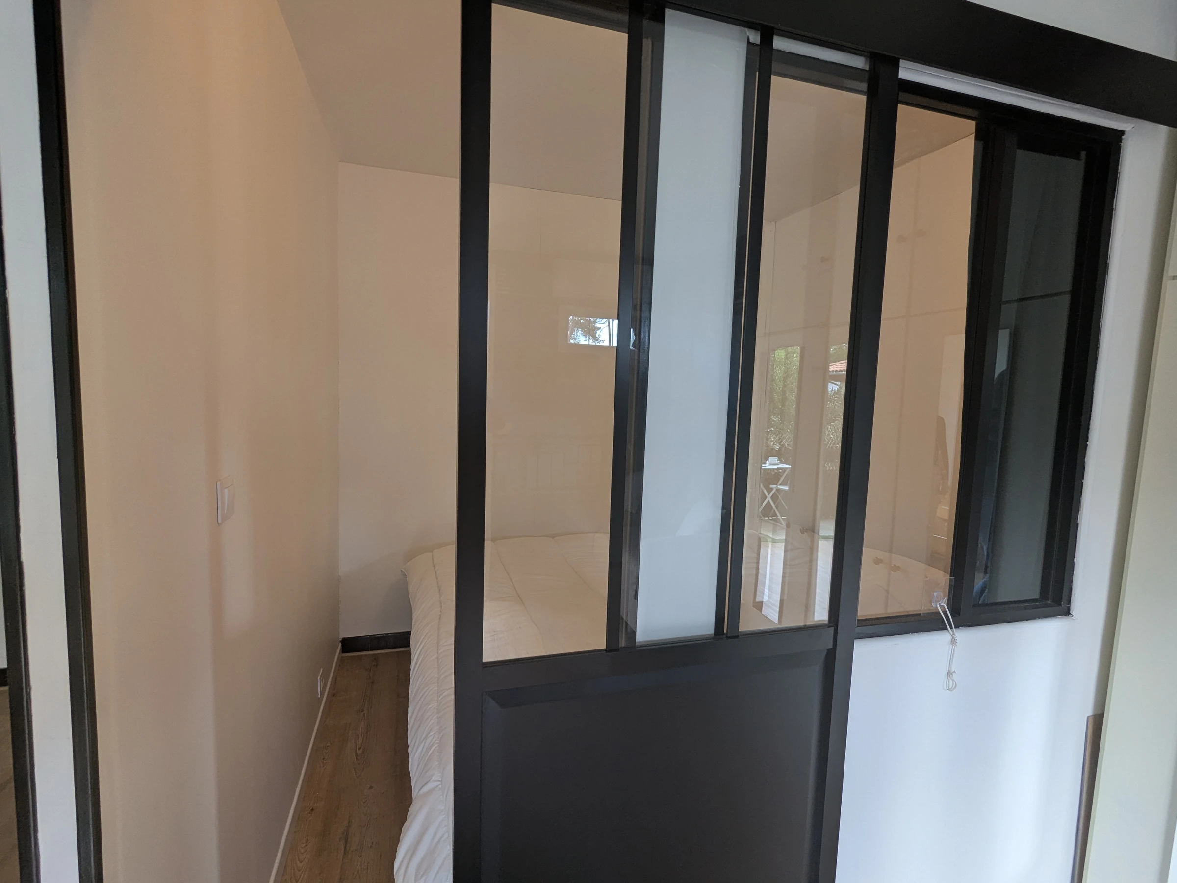 -un espace chambre fermé par une verrière et des rideaux occultants ( 2 lits de 80 cm x 200 cm/ Possibilité de les rapprocher)
