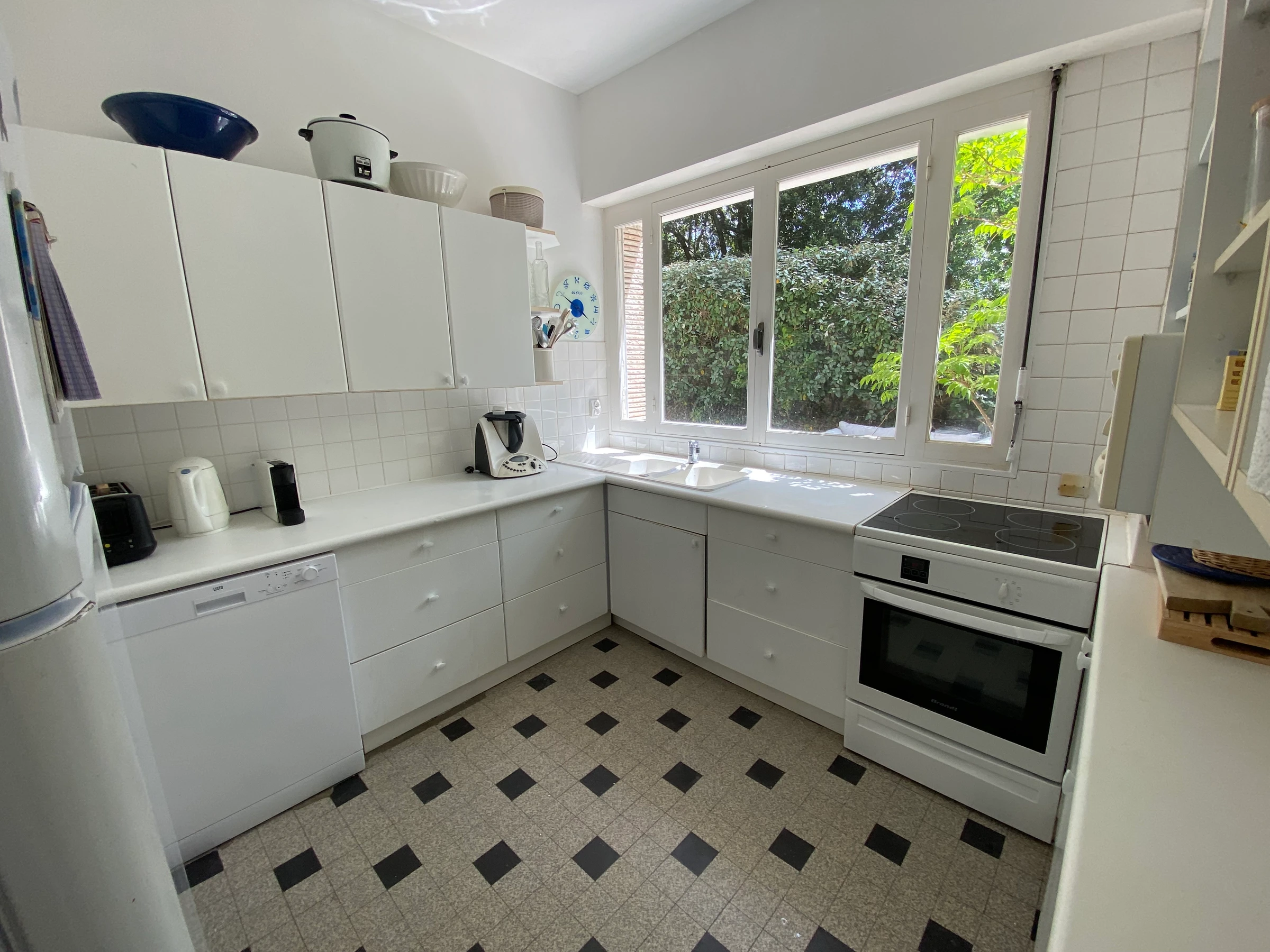 - Cuisine , plaques gaz, four, micro-ondes, réfrigérateur-congélateur, lave-vaisselle, lave-linge.