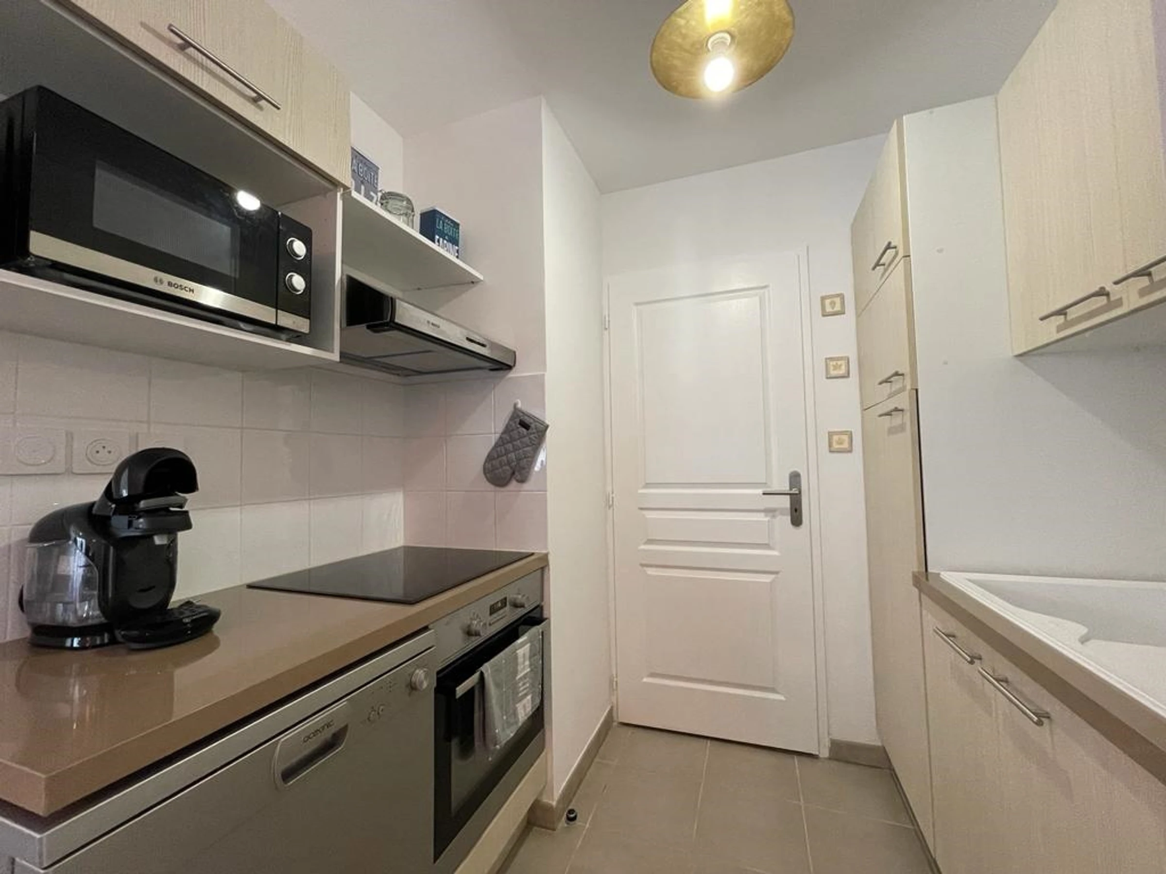 Une cuisine ouverte entièrement équipée dont une plaque vitrocéramique, un four, un micro-onde, un réfrigérateur-congélateur, un lave vaisselle et un lave linge.