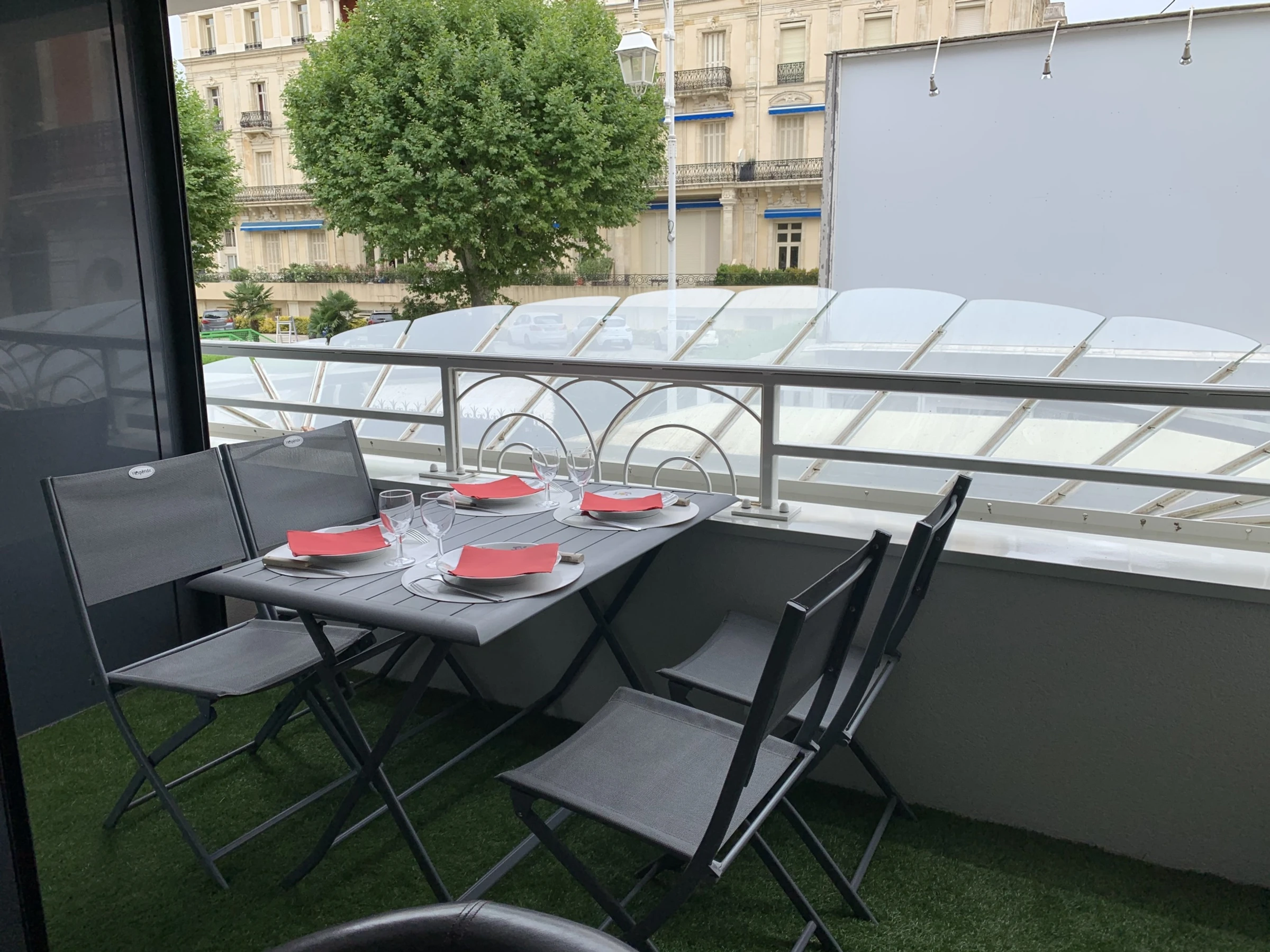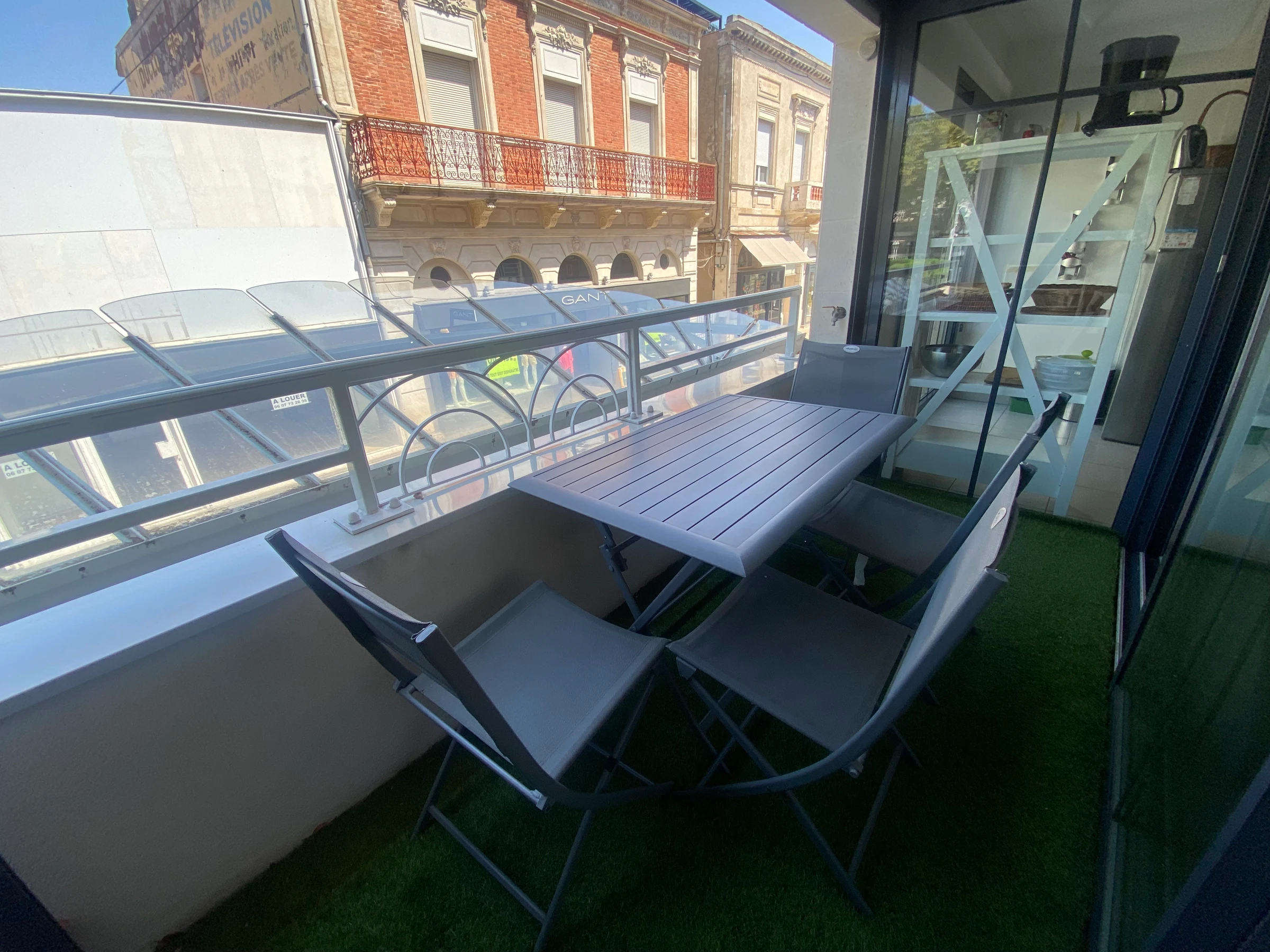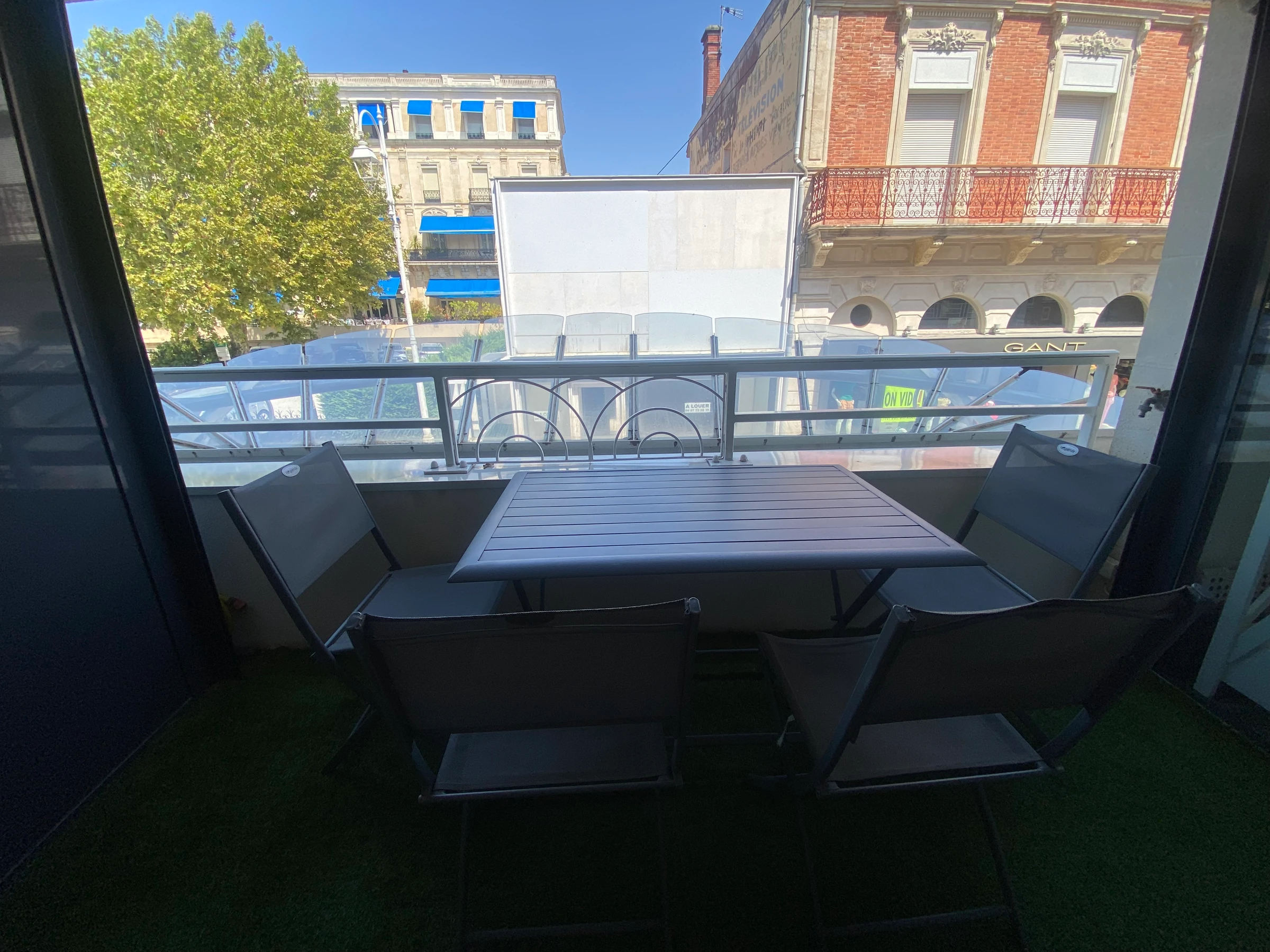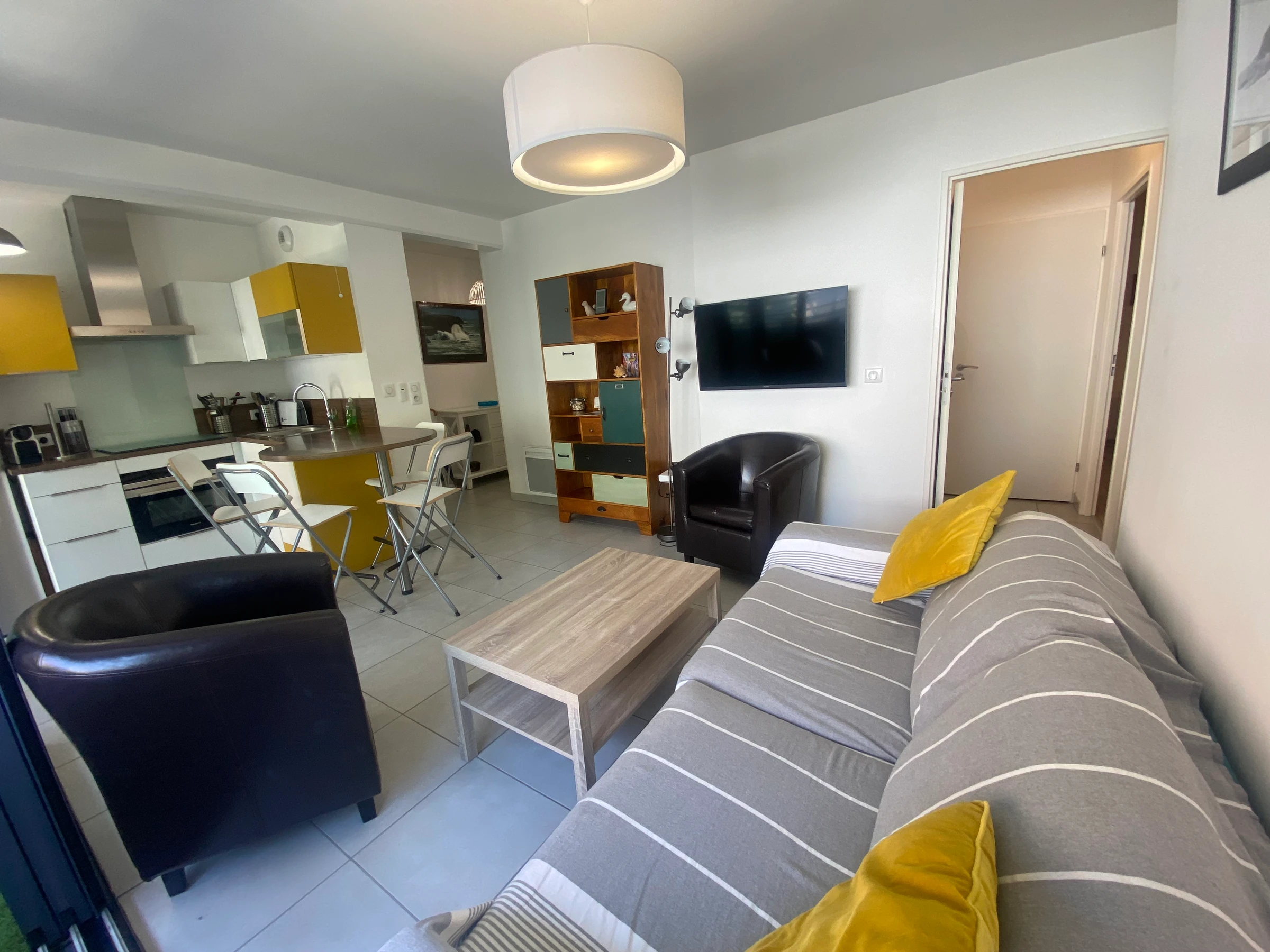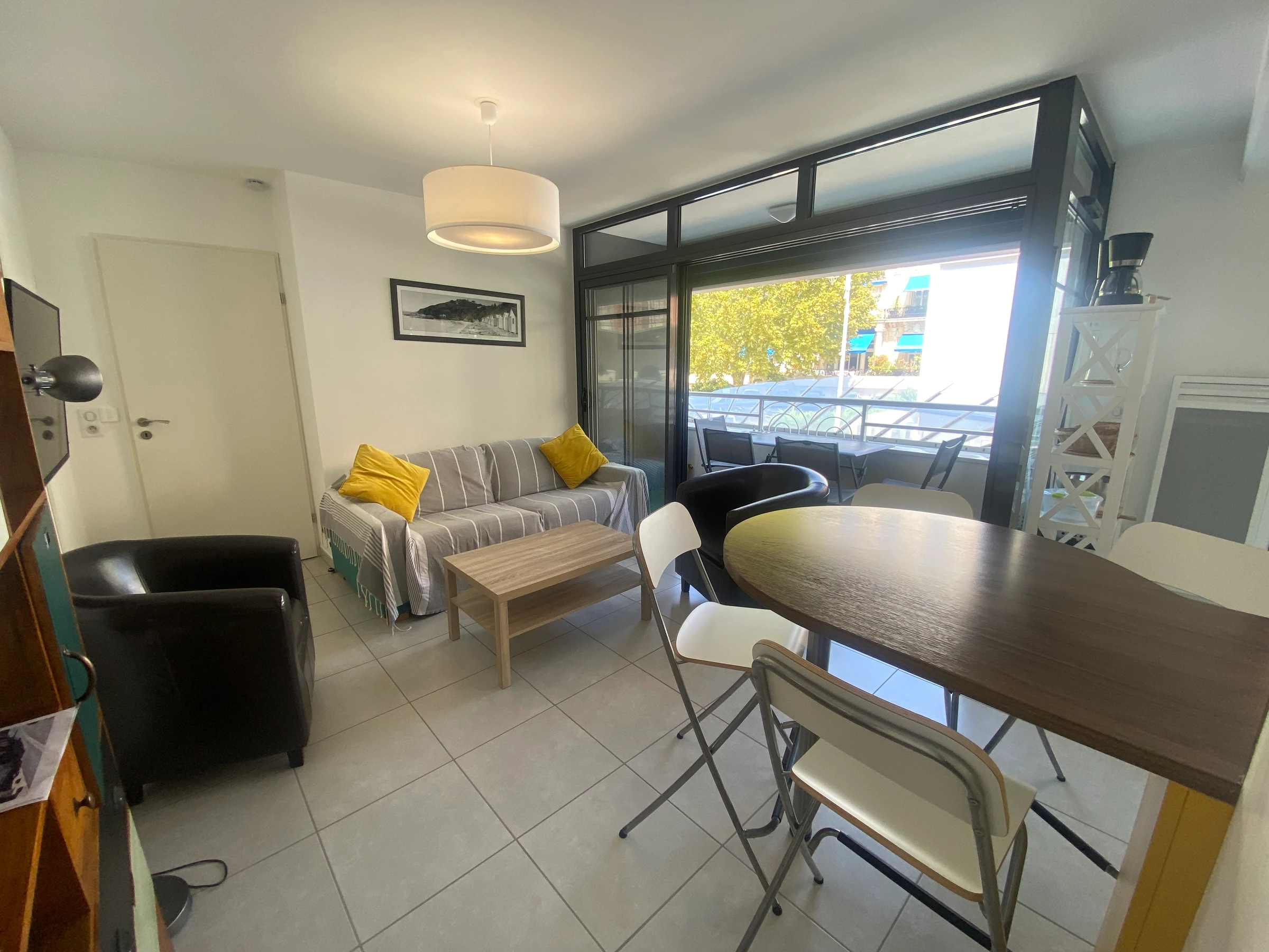 -Séjour avec canapé, TV écran plat, coin repas donnant sur balcon avec mobilier.