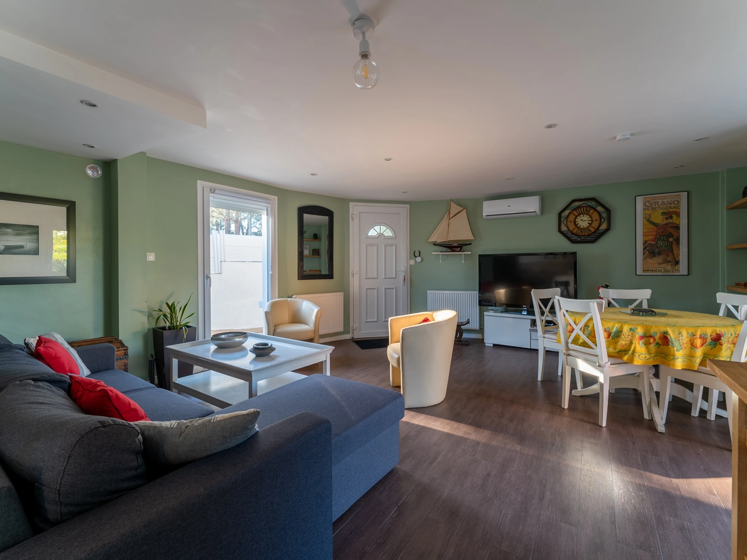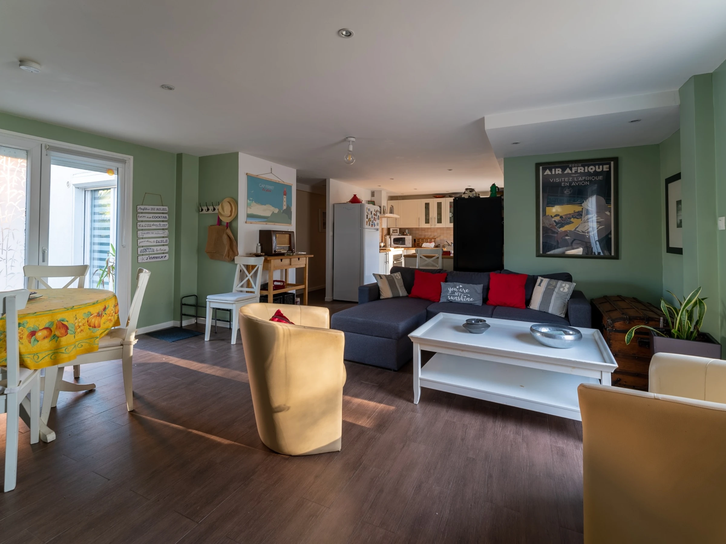 Sa pièce à vivre avec TV, WIFI et son coin repas donnant sur deux terrasses pour profiter des repas en extérieur avec son barbecue est très agréable. Salon de jardin pour la détente avec grand store banne. Une échappée sur le bassin d'Arcachon se présente à vous au bout de la terrasse surélevée.
