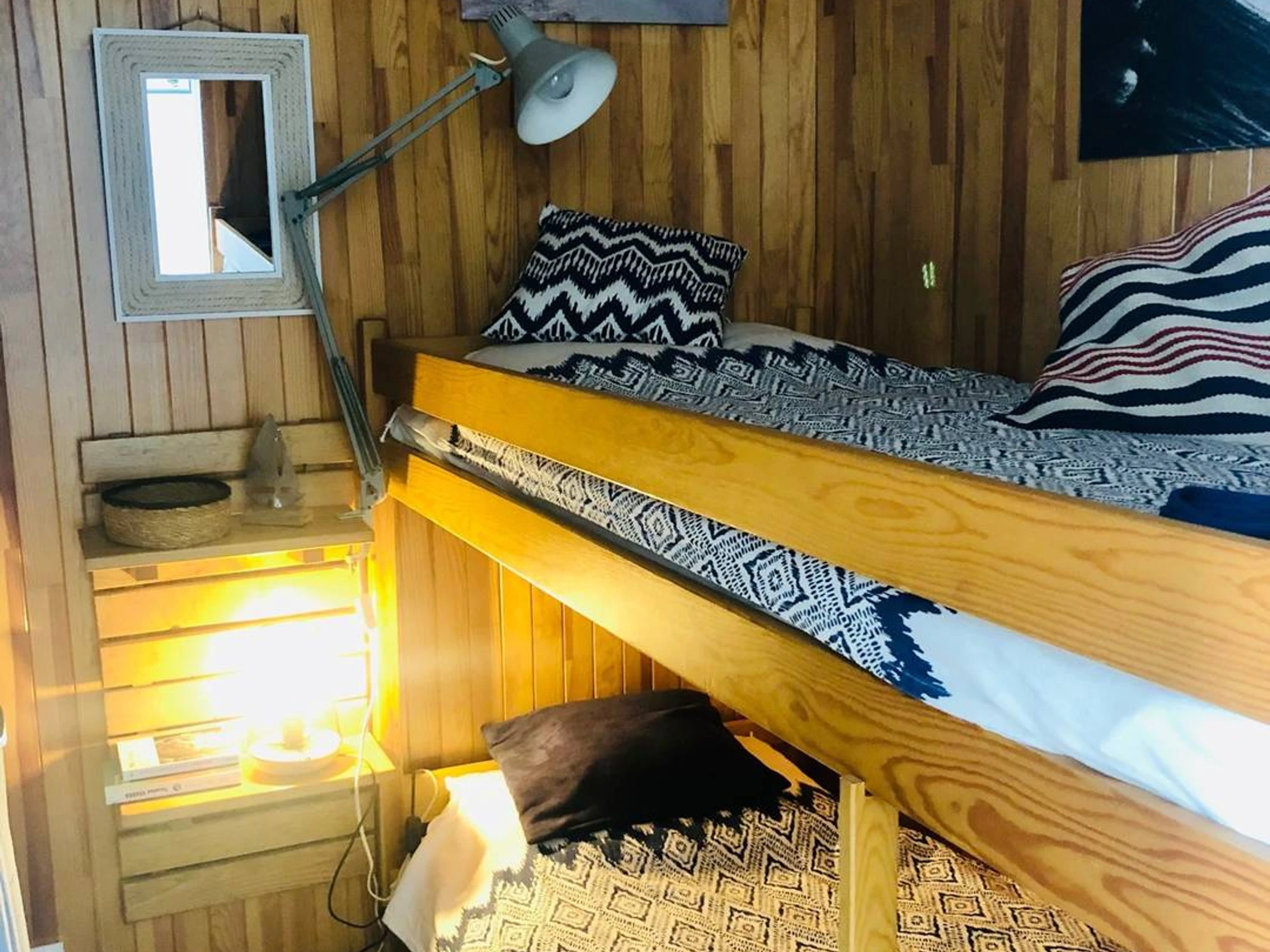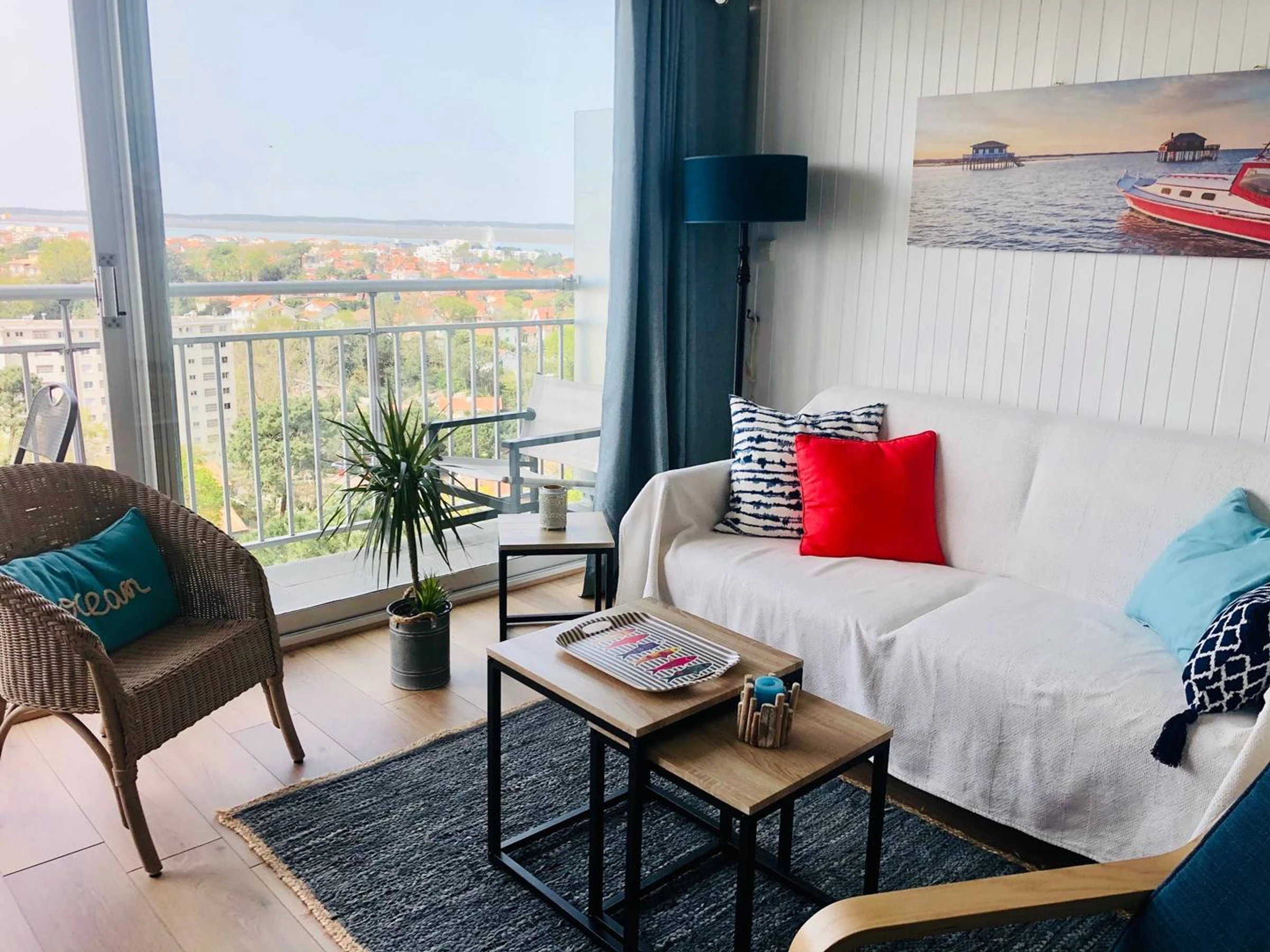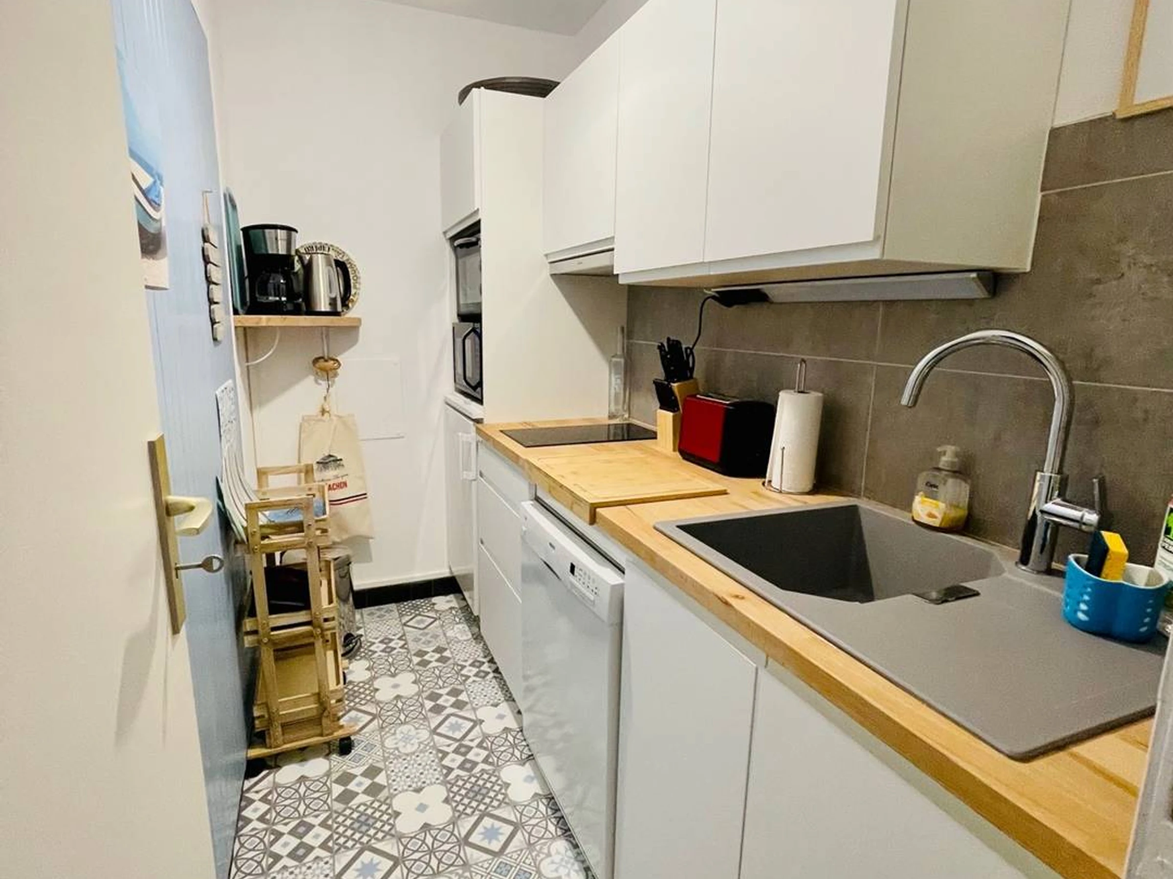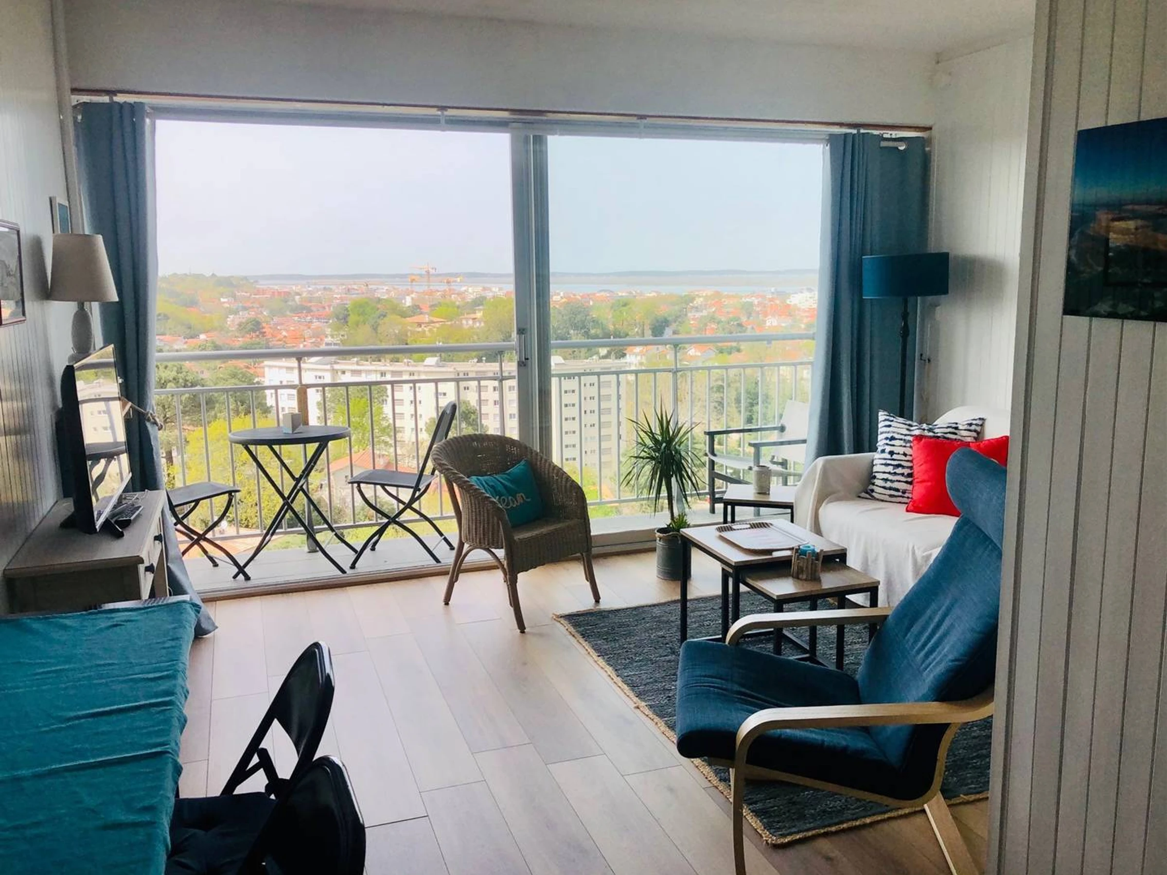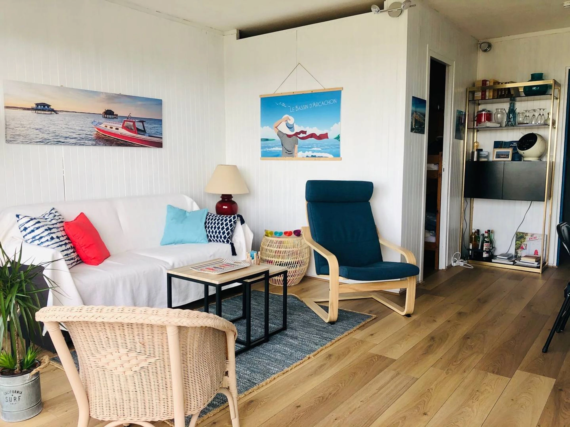 Couloir d’entrée avec placard / penderie desservant une salle d’eau avec WC – Jolie cuisine séparée équipée (petit réfrigérateur avec freezer, lave-vaisselle, 3 plaques induction, micro-ondes, mini-four, hotte…) rénovée récemment – Pièce principale composée d’une cabine « aveugle » (2 lits superposés en 80, rangements) et d’un salon exposé Sud-Ouest (canapé lit en 140 : acheté en mars 2023 : très confortable, TV…) avec accès balcon. Balcon avec mobilier et store banne, bénéficiant d’une très jolie vue sur la ville d’Arcachon et son bassin.