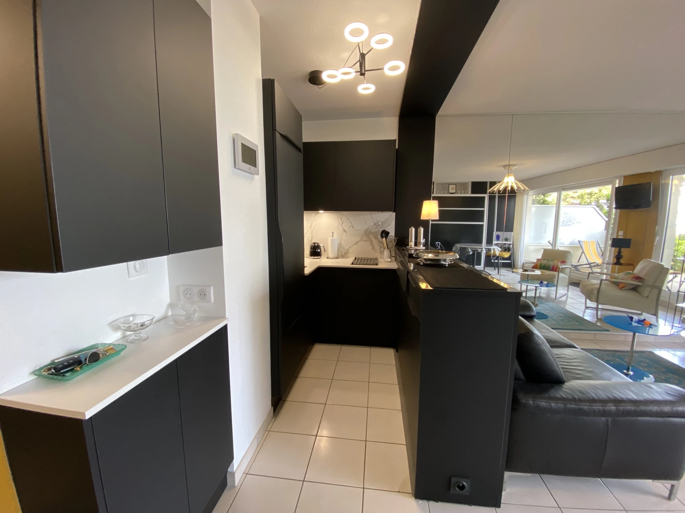 Studio avec de très belles prestations, se composant d'une entrée avec placard. Une pièce de vie avec cuisine ouverte équipée : micro-ondes réfrigérateur-congélateur, mixeur, presse agrume, cafetière Nespresso, bouilloire, grille pain, lave vaisselle, plaques, hotte. Un canapé avec table basse et fauteuil, une télévision, un lit armoire en 160/200. Une salle de bain. Un wc avec lave-linge séchant. Une terrasse et son mobilier complètent l'ensemble avec une vue sur la plage.