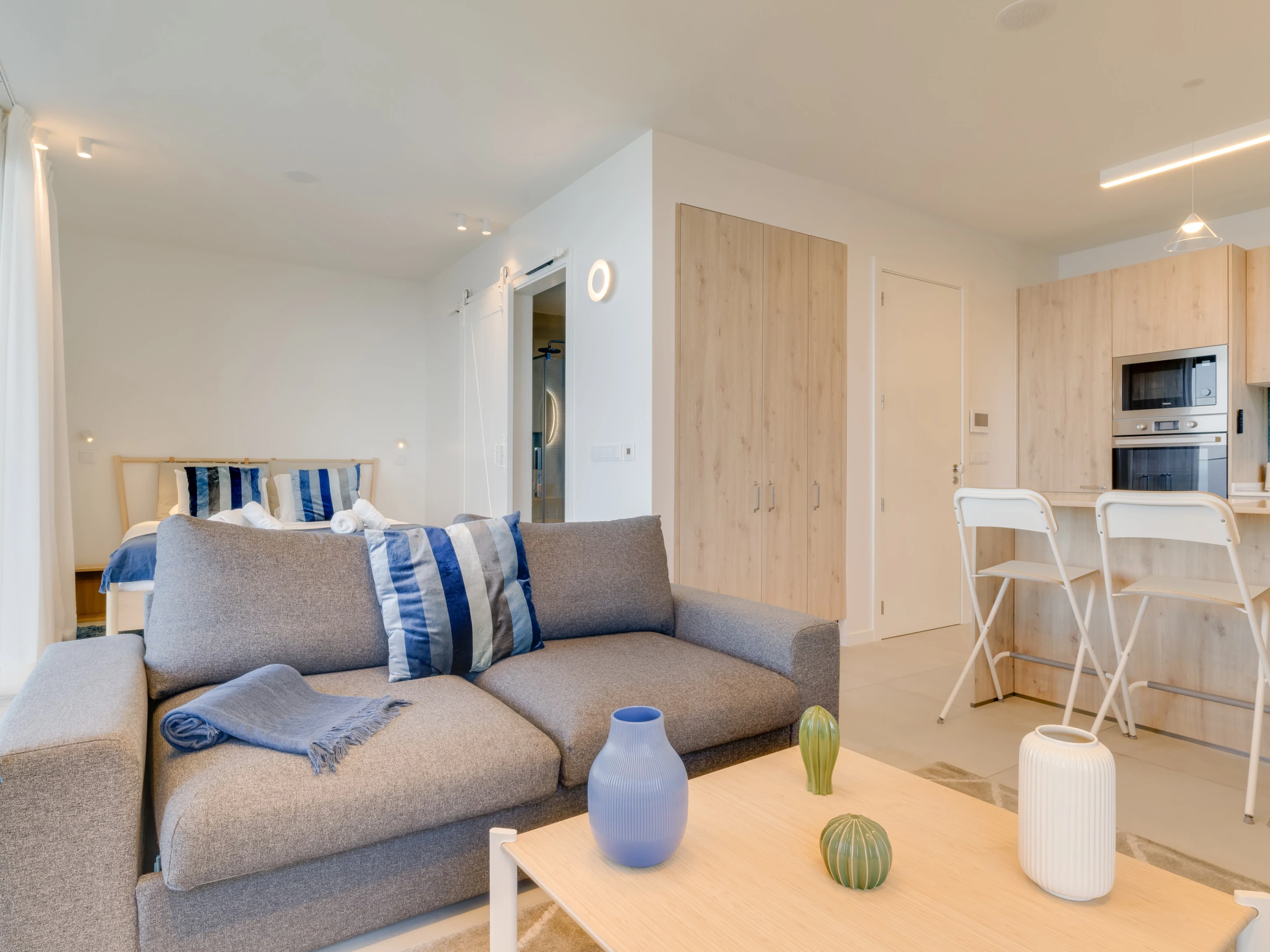 L'appartement dispose d'une chambre confortable avec un lit queen-size et d'un espace commun avec un canapé-lit pour deux personnes. La salle de bains est équipée d'une douche, offrant tout le nécessaire pour commencer la journée de manière rafraîchissante. La cuisine bien équipée comprend un réfrigérateur, un congélateur, un four, un micro-ondes, une plaque de cuisson, des couverts, des assiettes et tous les ustensiles nécessaires. Profitez de vos émissions préférées sur la TV intelligente avec une variété de chaînes. Une machine à laver et un sèche-cheveux sont également disponibles pour votre confort.