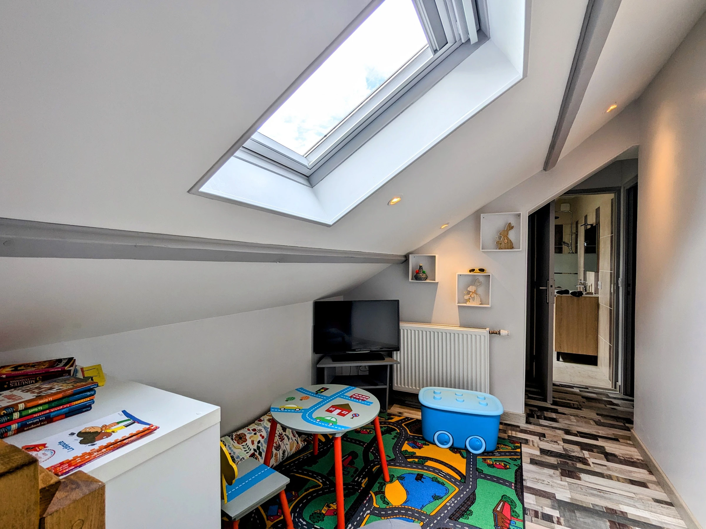 À l'étage, un espace de jeux pour les enfants mène aux deux chambres avec des lits doubles (140 x 190 cm) et des espaces de rangement. Une deuxième salle d'eau et des toilettes se trouvent également à l'étage.