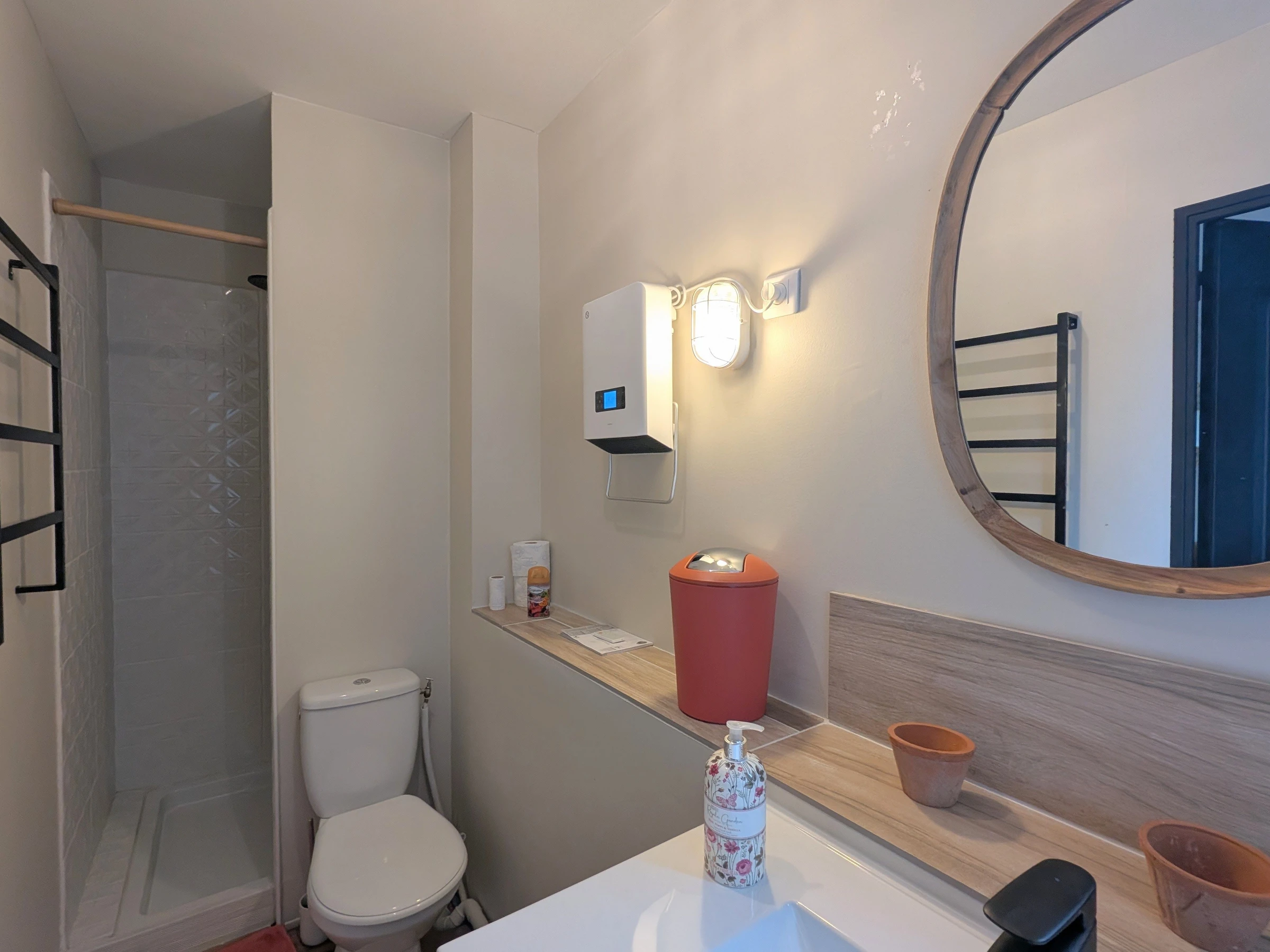Une salle d'eau avec douche, lavabo et wc, un dégagement permet d'accéder au garage privatif et à l'étage.