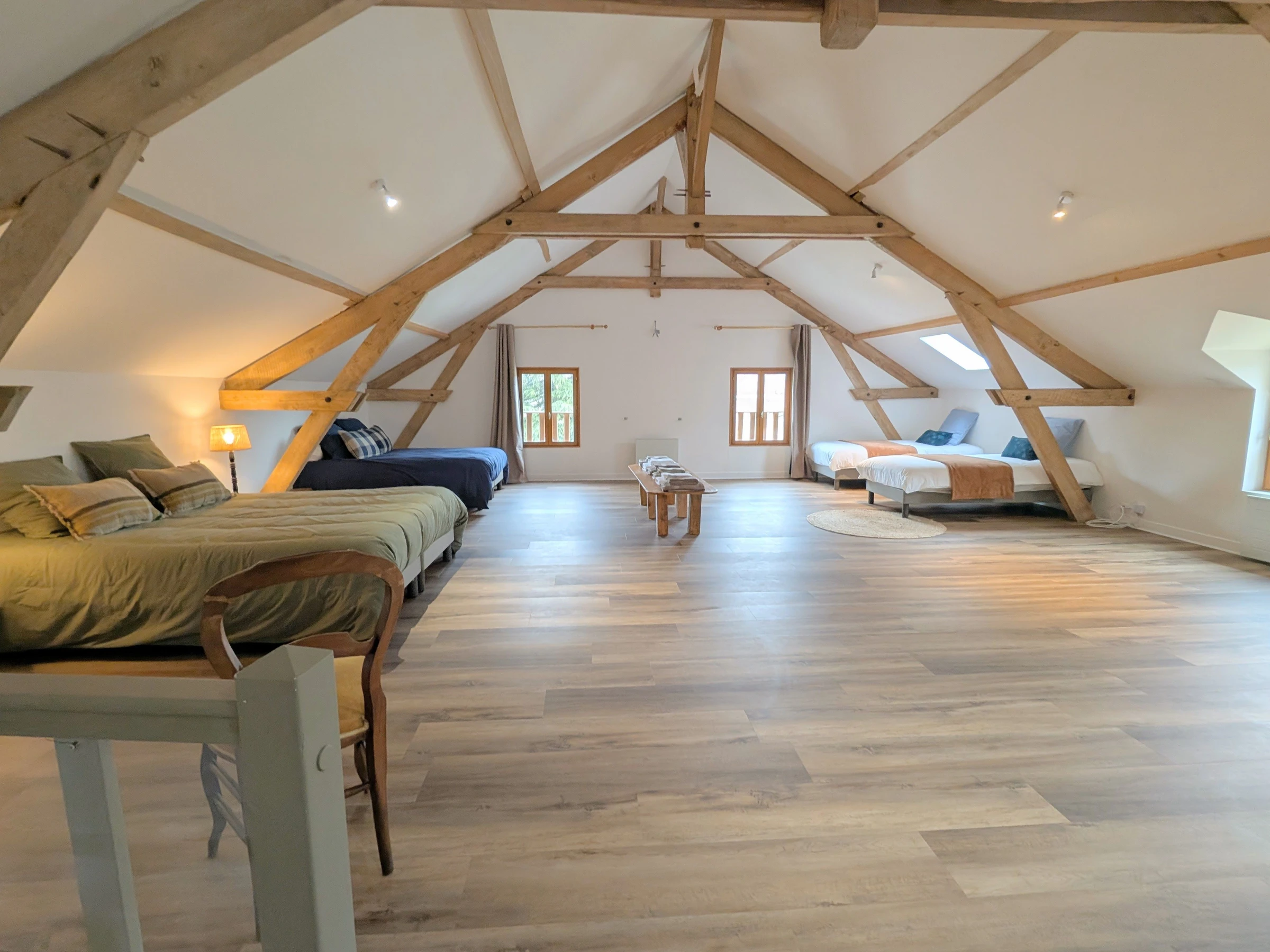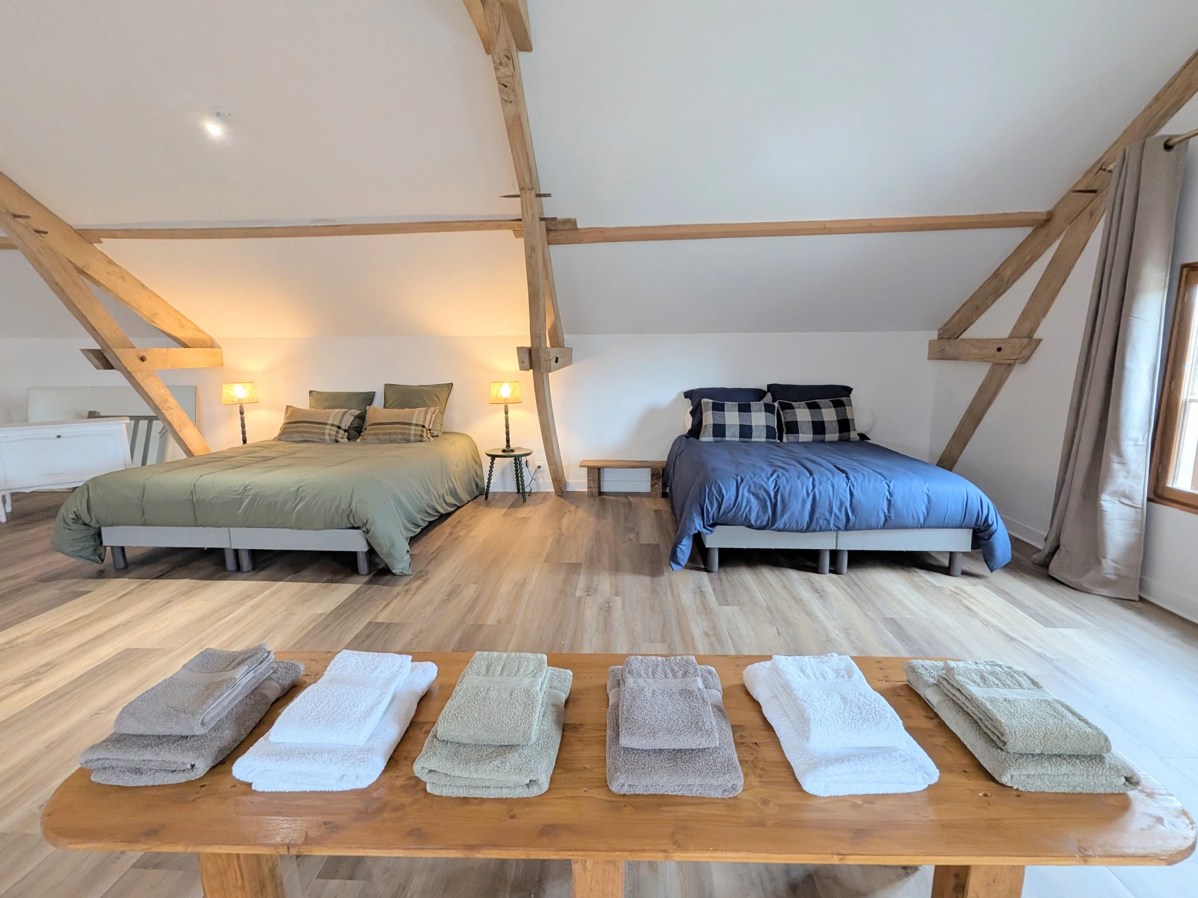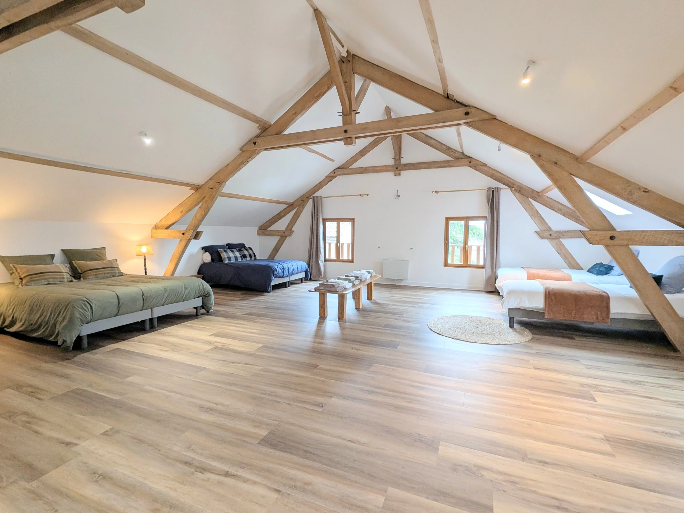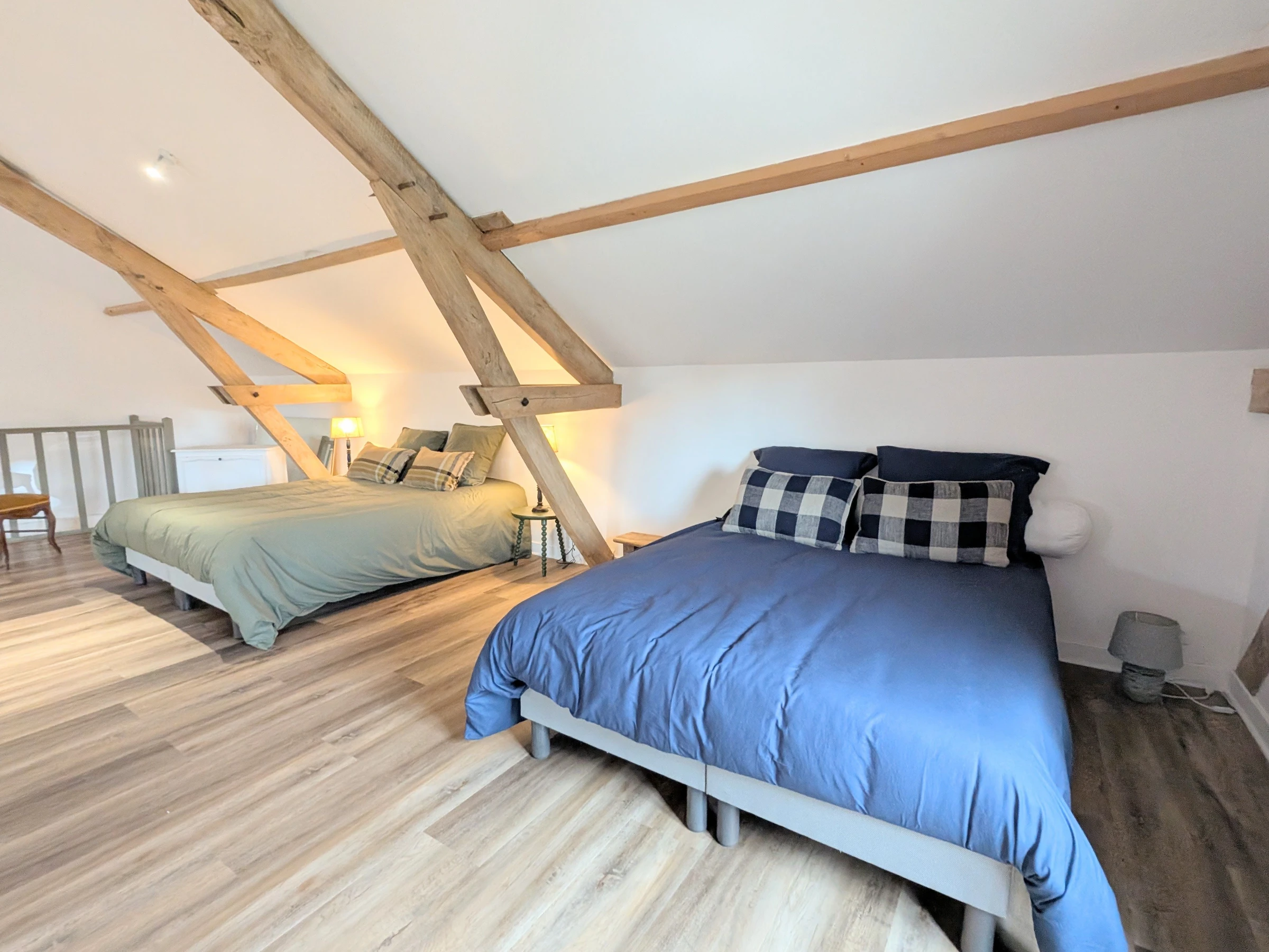 En mezzanine, au premier étage, ouvert sur le rez-de-chaussée un espace nuit avec un lit 2 personnes (140x190cm), un lit 2 personnes (160x200cm) et deux lits une personne (90x190 cm).
