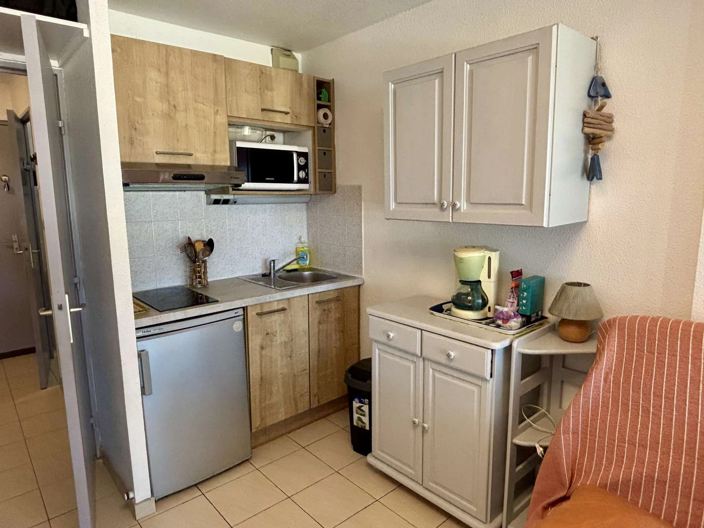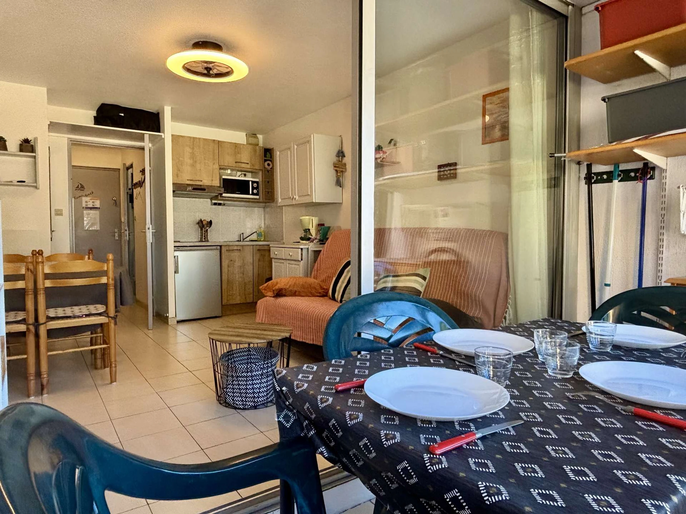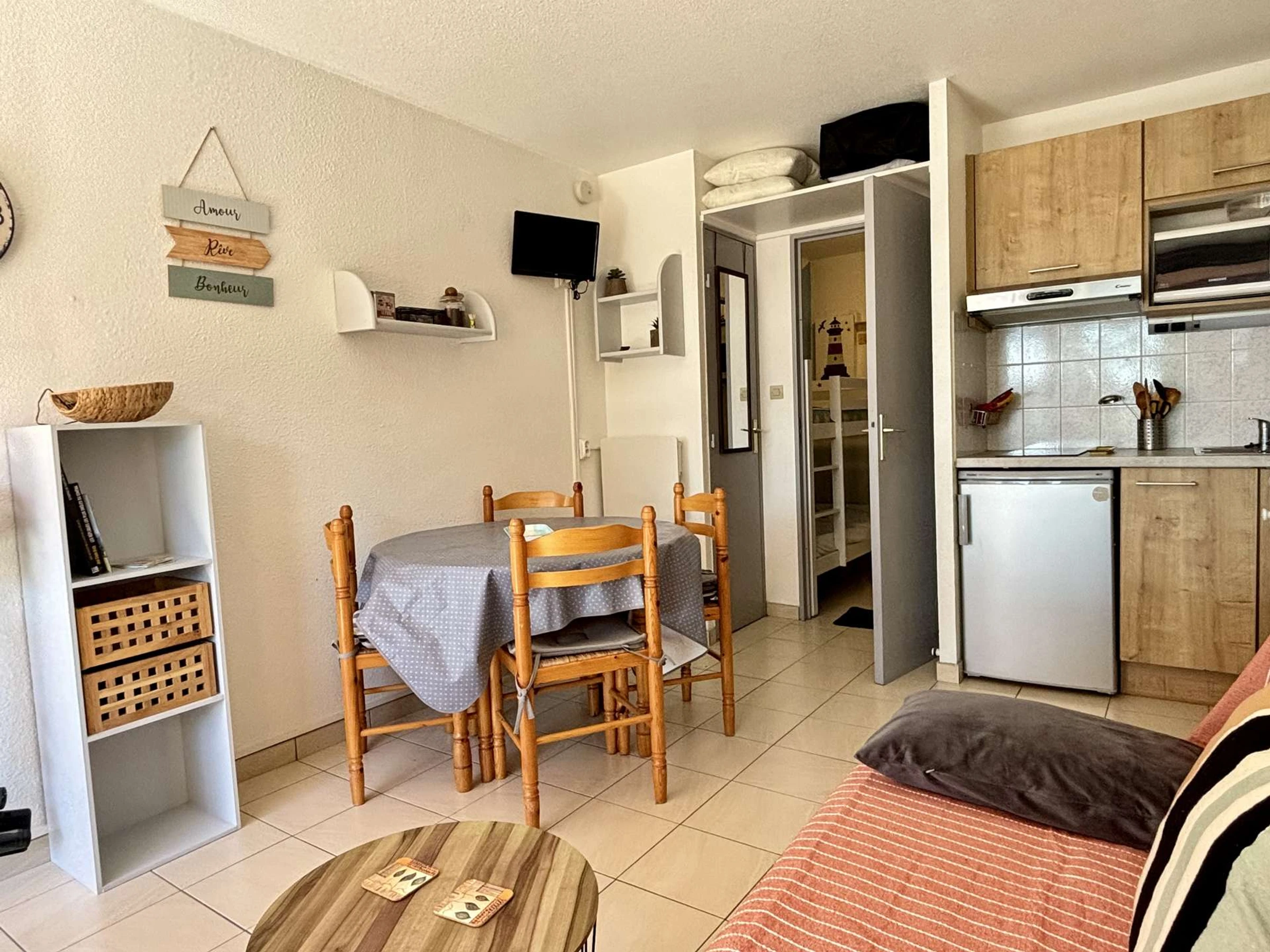 Le logement : Ce studio cabine de vacances, situé au 1er étage du Bâtiment D de la résidence Le Lagon, comprend un séjour avec canapé convertible 2 places, un coin cuisine équipé, un coin cabine avec 2 lits superposés 1 place et une salle d'eau avec WC.