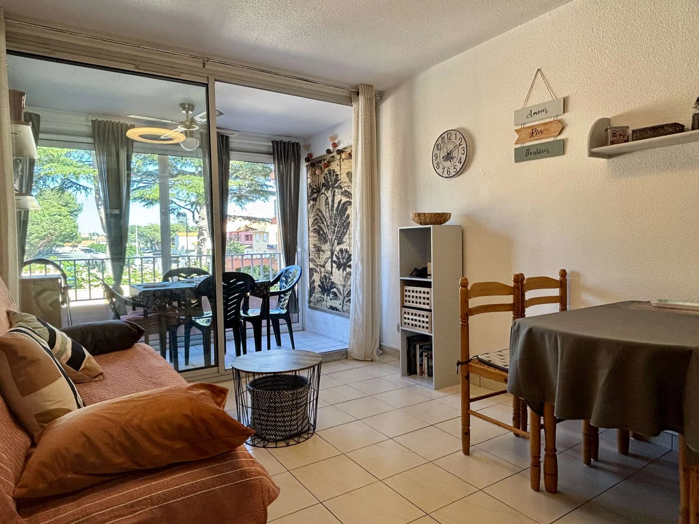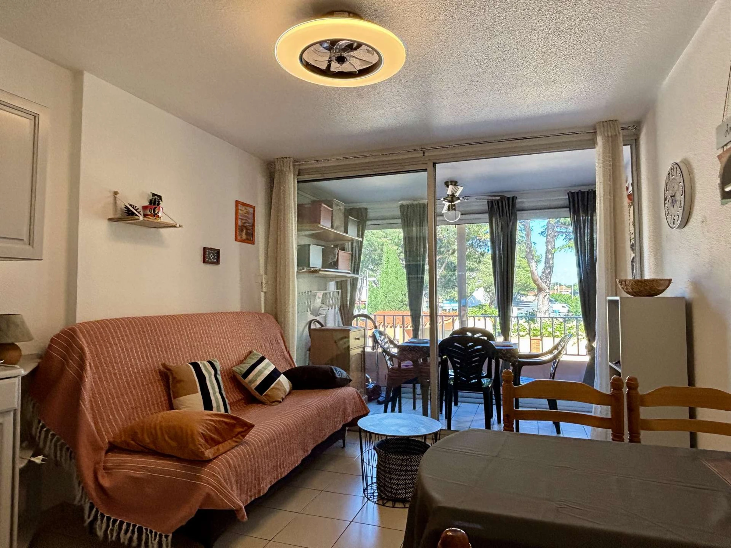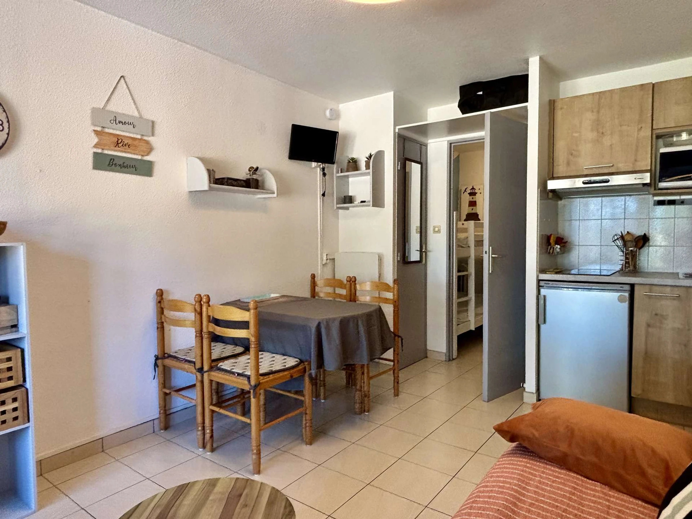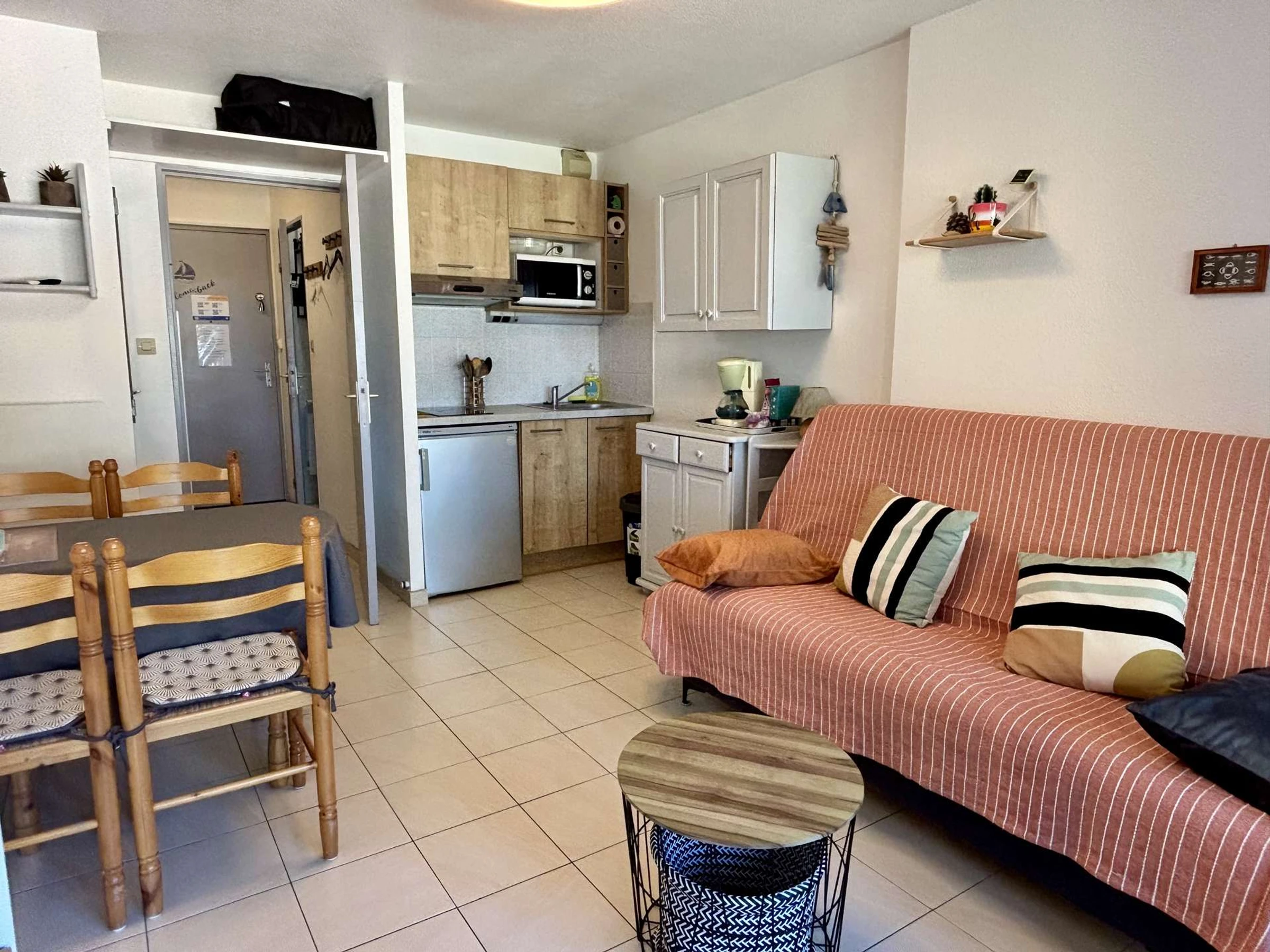 Le logement : Ce studio cabine de vacances, situé au 1er étage du Bâtiment D de la résidence Le Lagon, comprend un séjour avec canapé convertible 2 places, un coin cuisine équipé, un coin cabine avec 2 lits superposés 1 place et une salle d'eau avec WC.